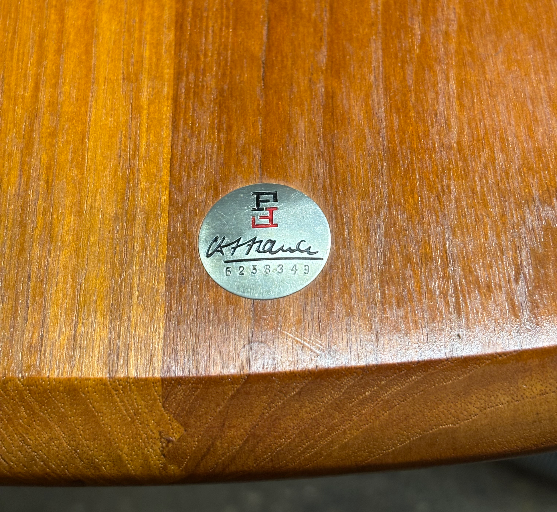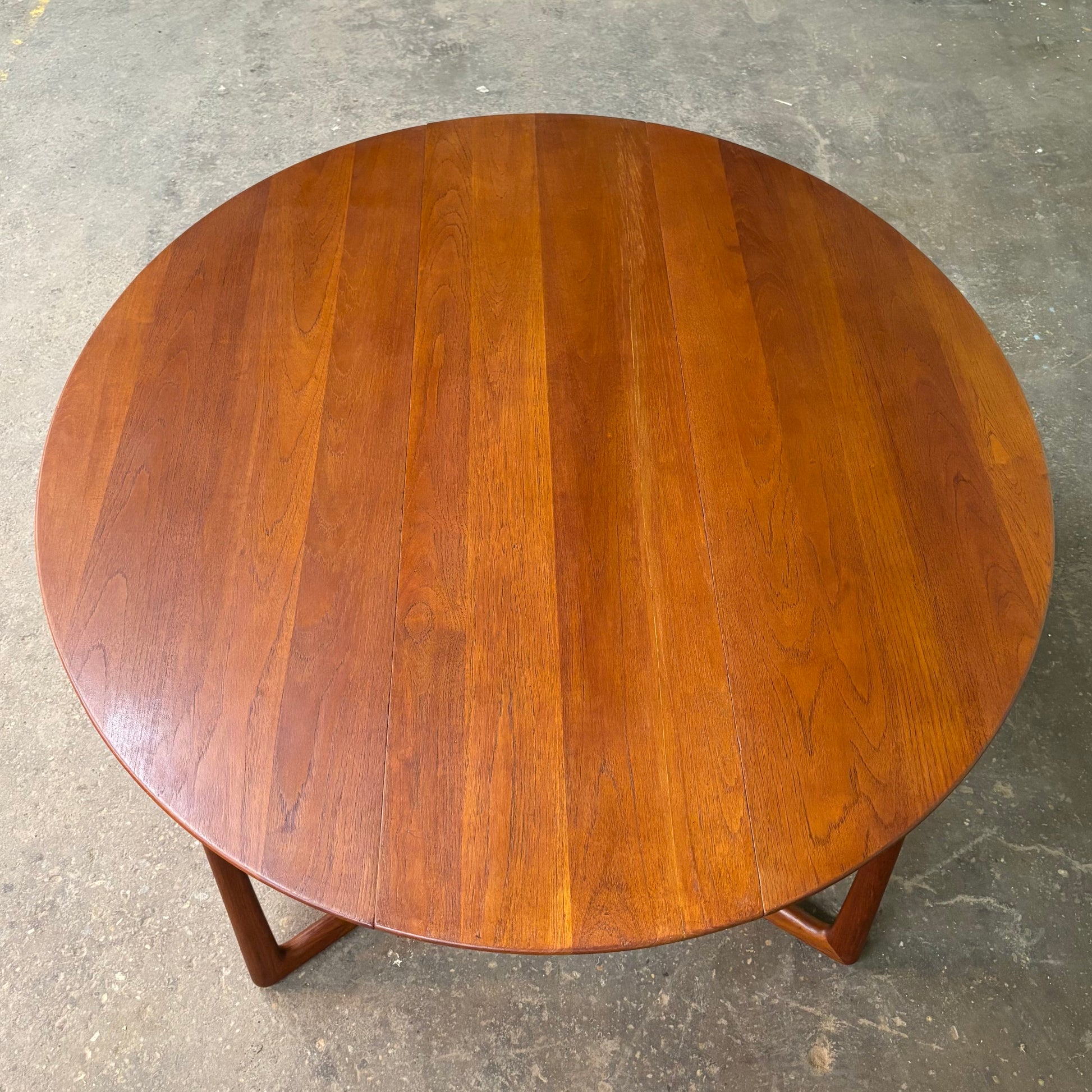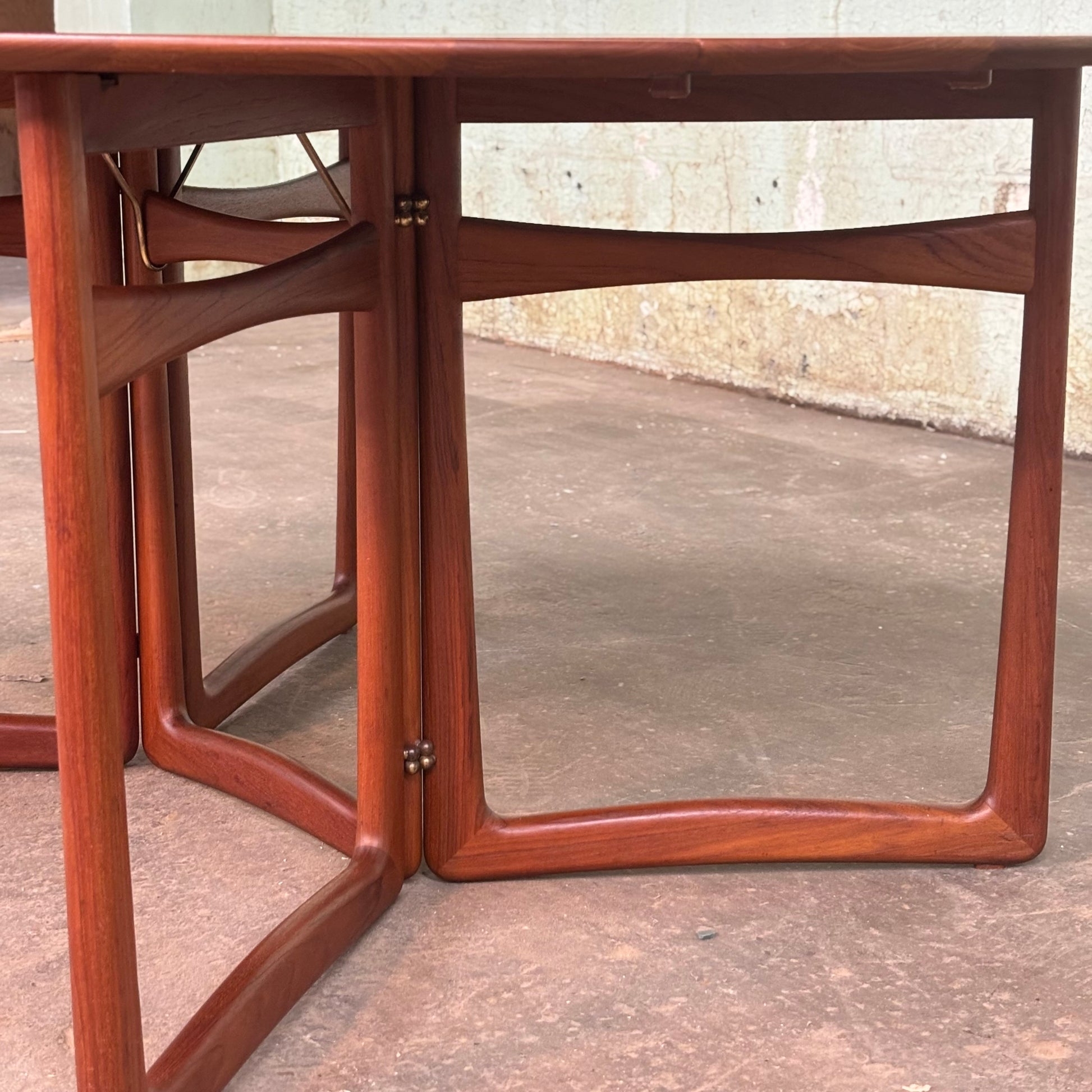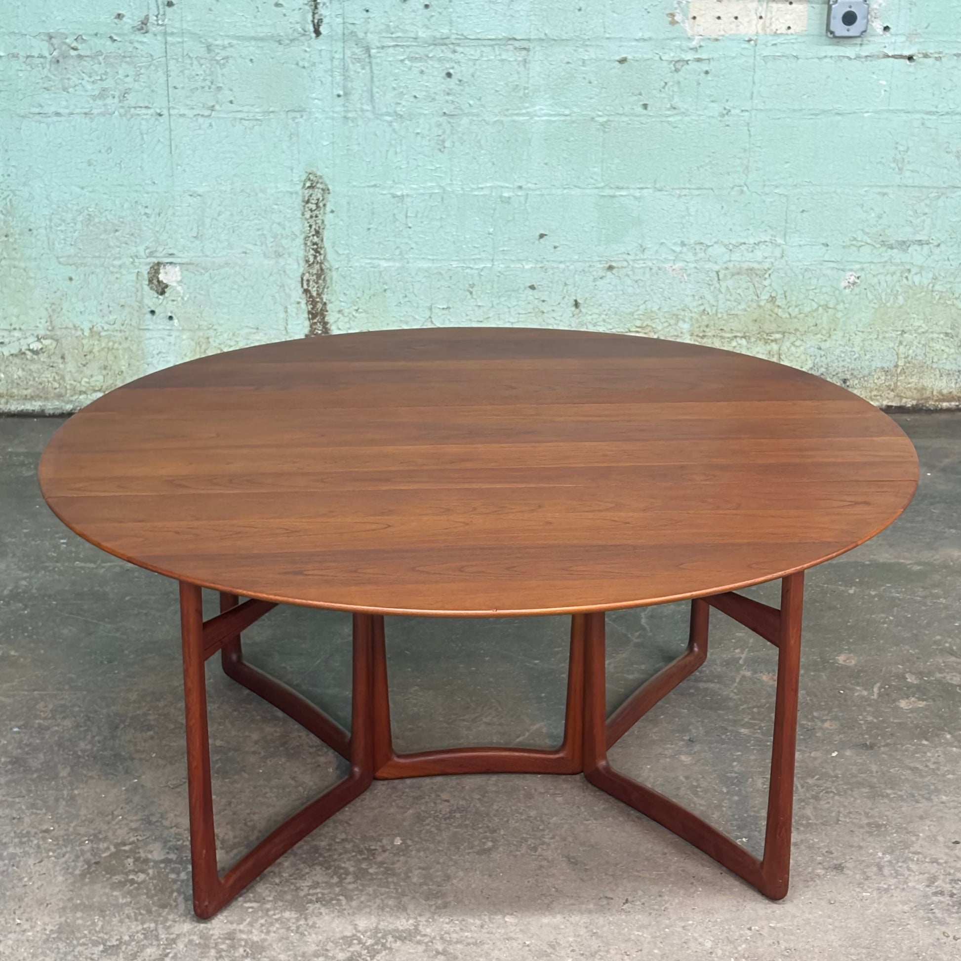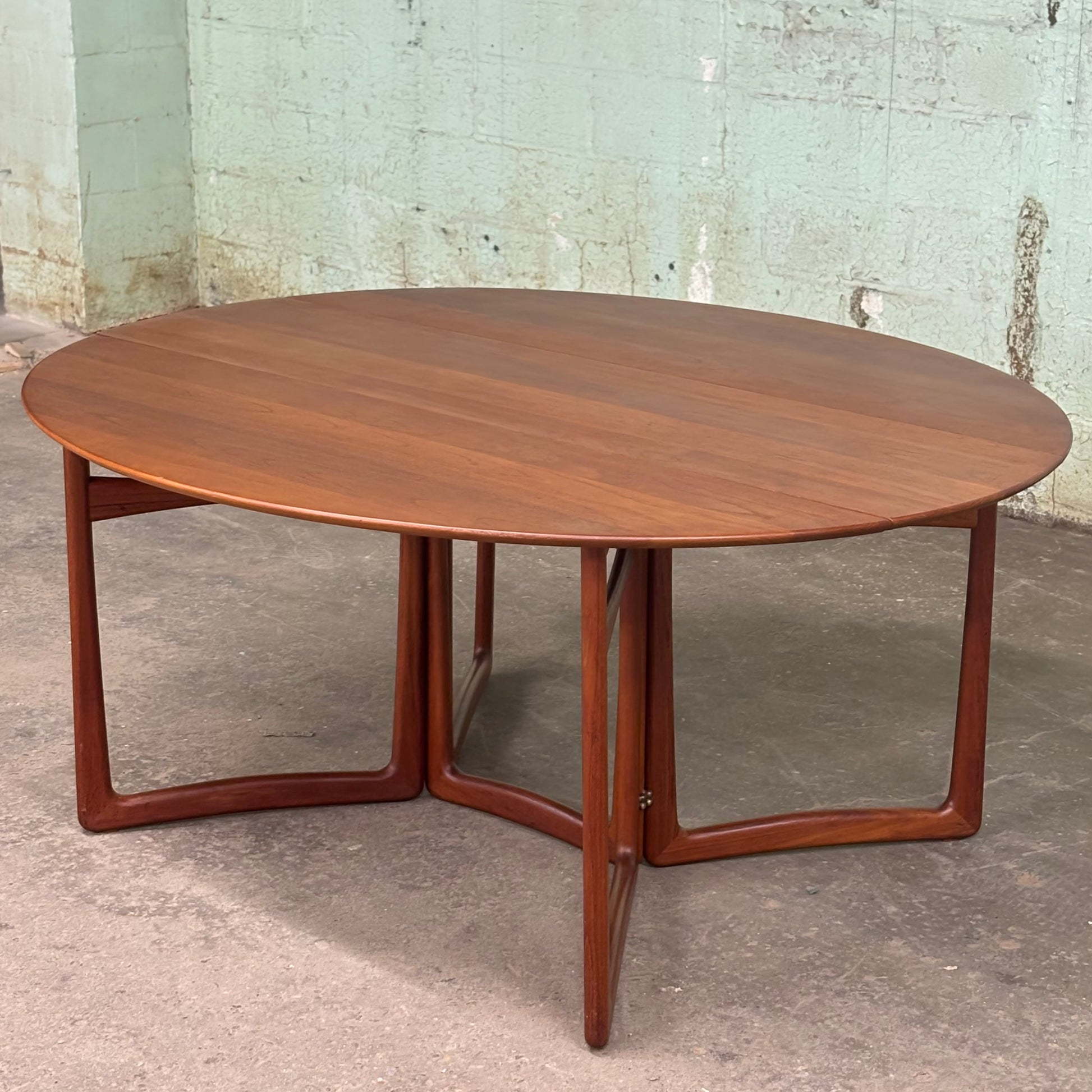 Impressive solid teak table with drop leaves & sculpted teak gate leg frame. Designed by Peter Hvidt & Orla Molgaard Nielsen for France & Son in 1956.