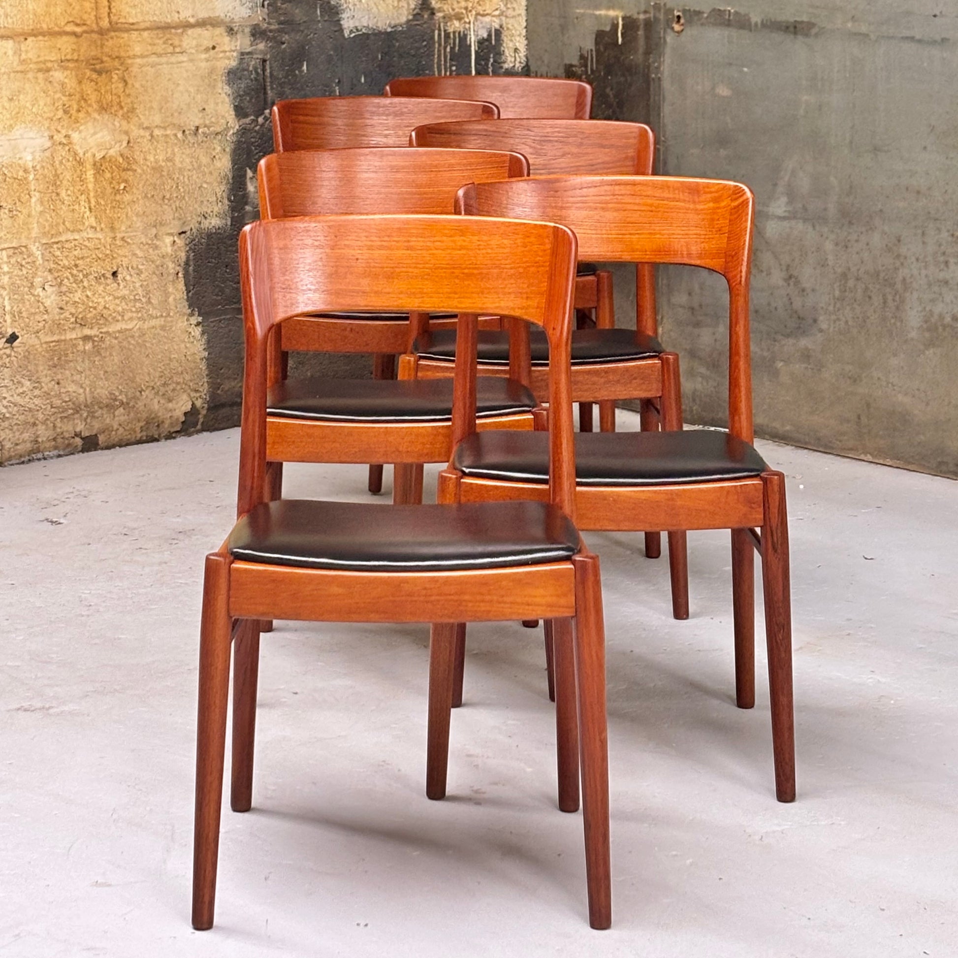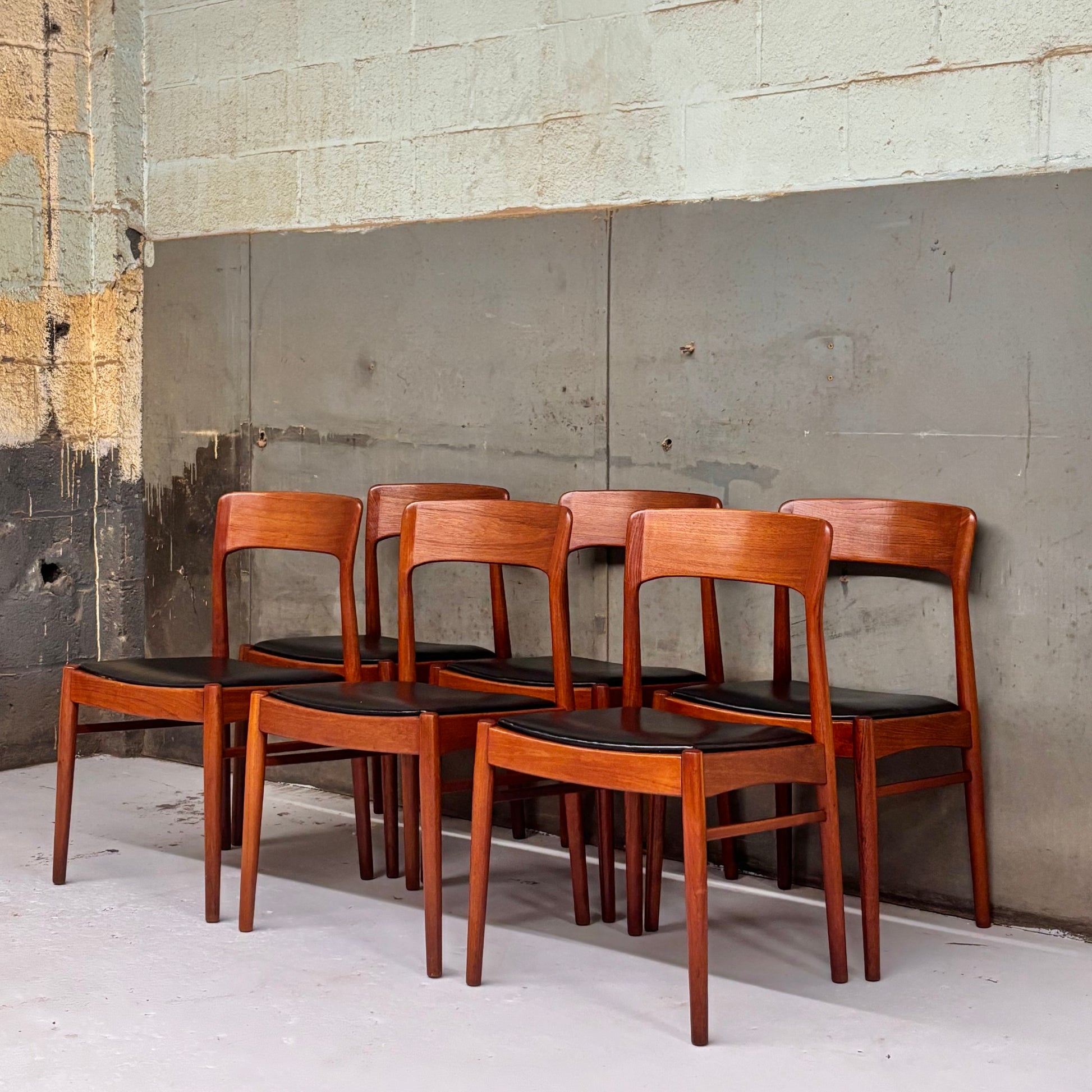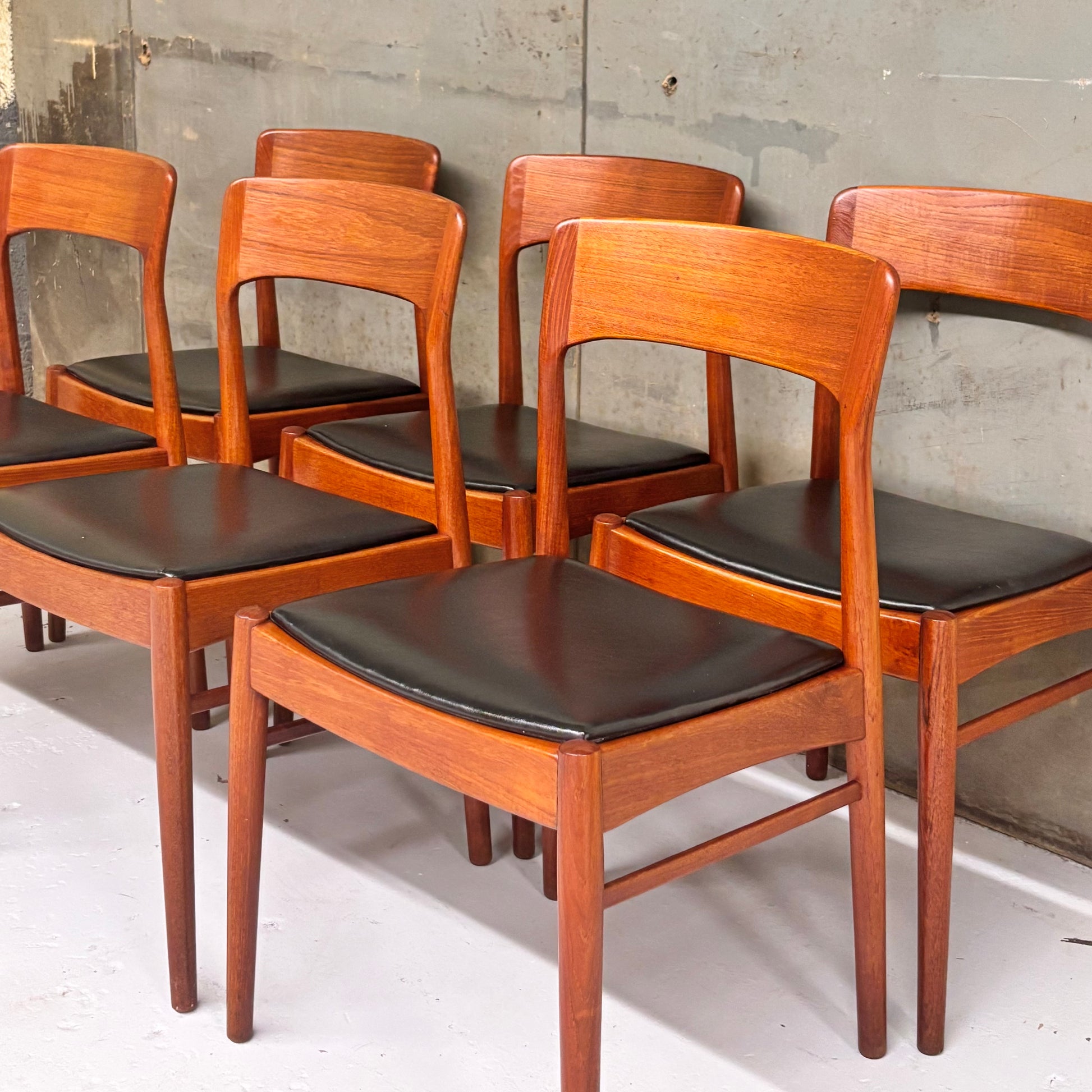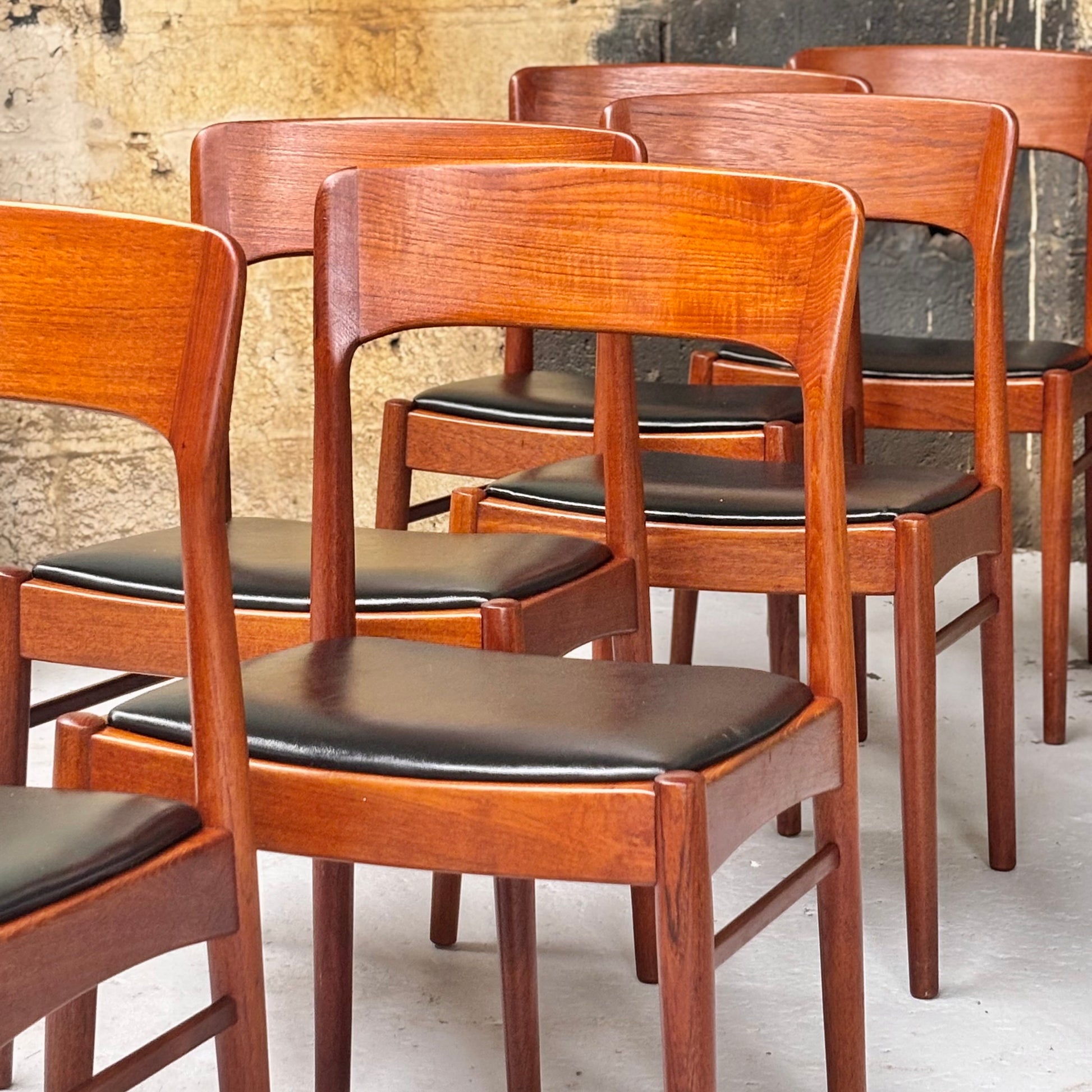 Incredible set of sculpted teak dining chairs in their original black leatherette upholstery. Designed by the legendary Henning Kjaernulf for Korupstolefabrik c. 1950s.