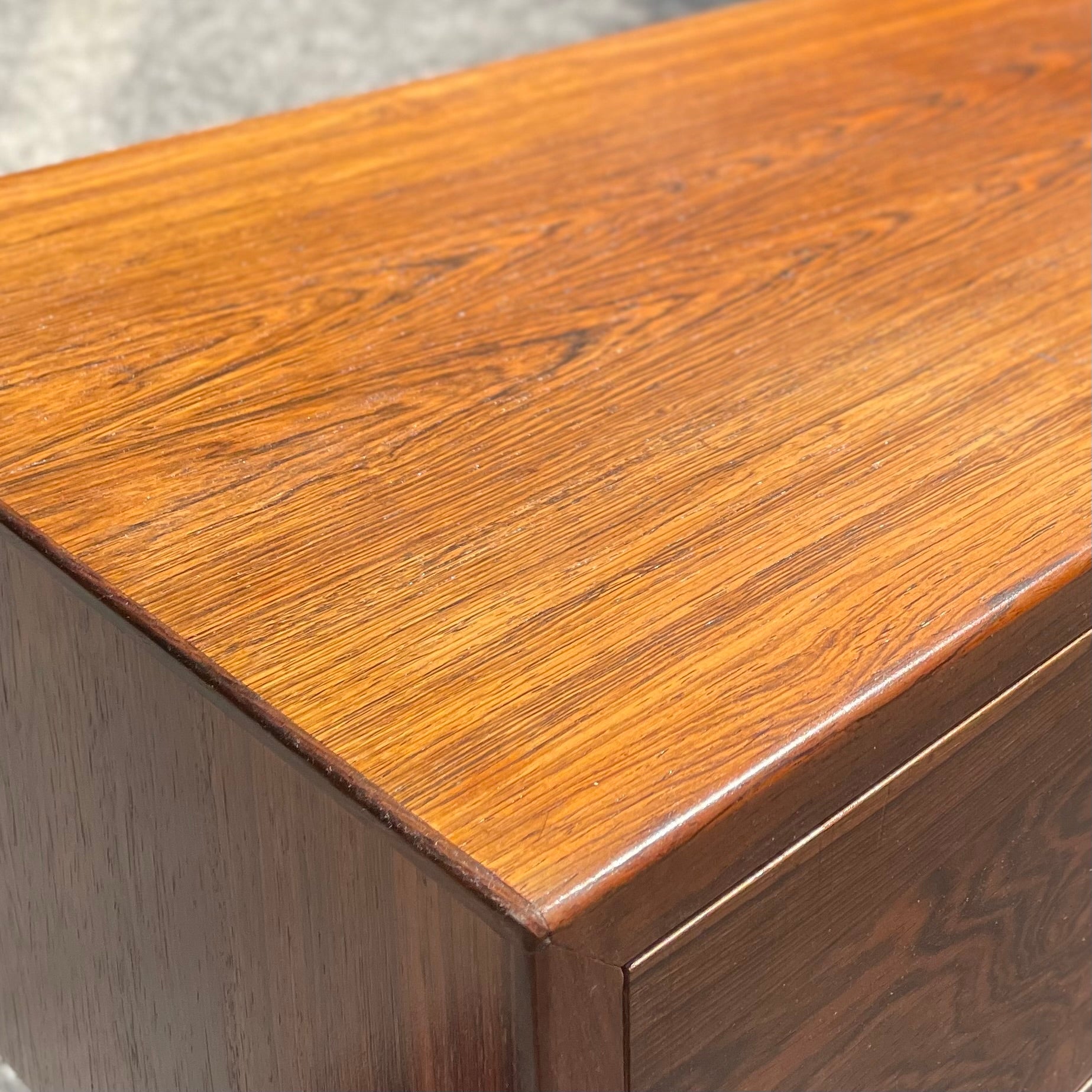 Rosewood is always touted as one of, if not the most beautiful wood species of all. Rich brown and red hues with starkly contrasting mineral lines create so much intrigue and movement. The case of this piece rests on two sled legs constructed of solid rosewood and the drawers are accented with a cobalt glaze ceramic tile.