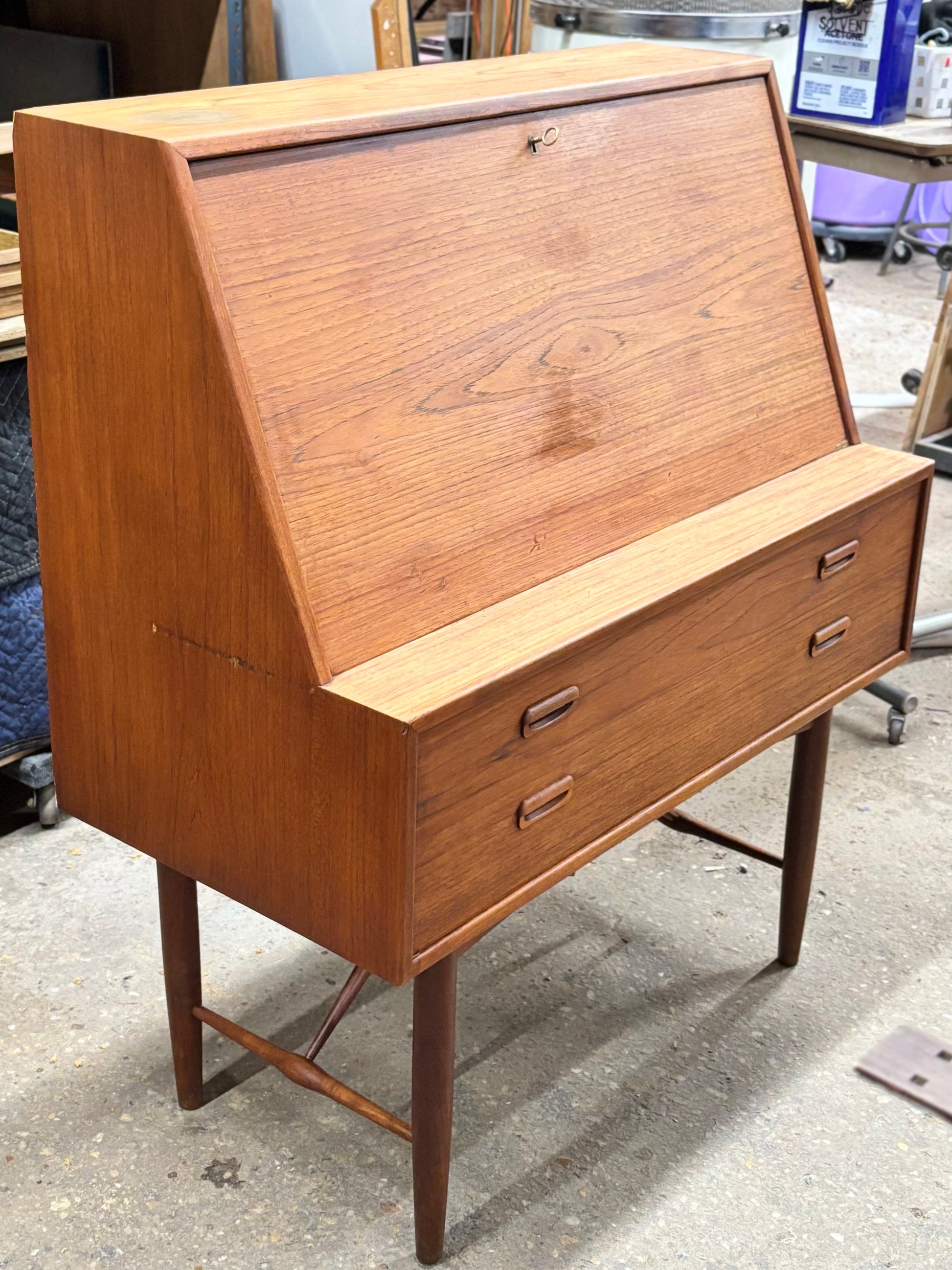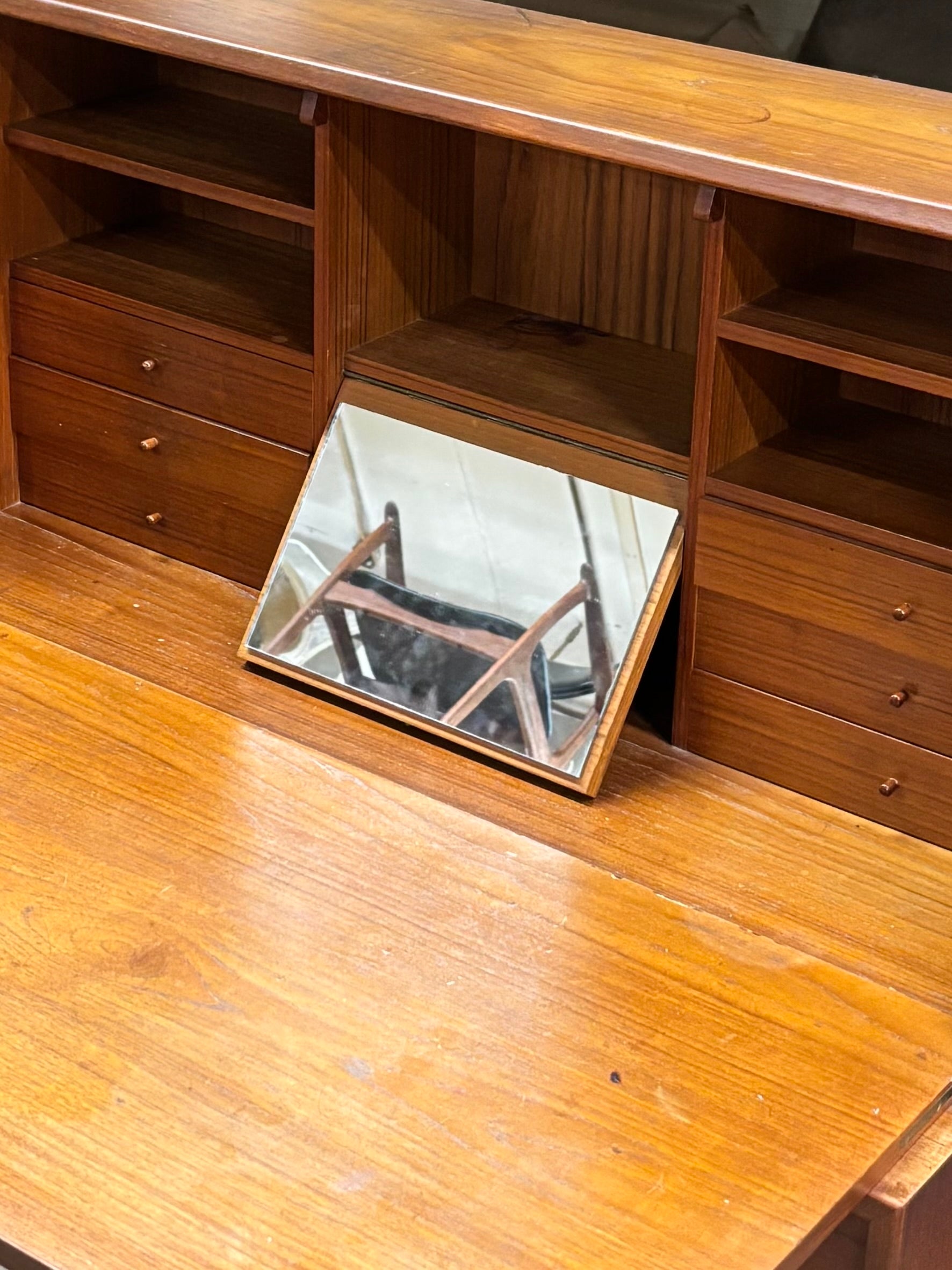 Shown in un-restored condition, this wonderful desk is currently undergoing a cosmetic overhaul. I wanted to get everyone’s eyes on it, even in its current state, it’s just too good. The hidden mirror that folds out after opening the desk panel is the ultimate reveal…