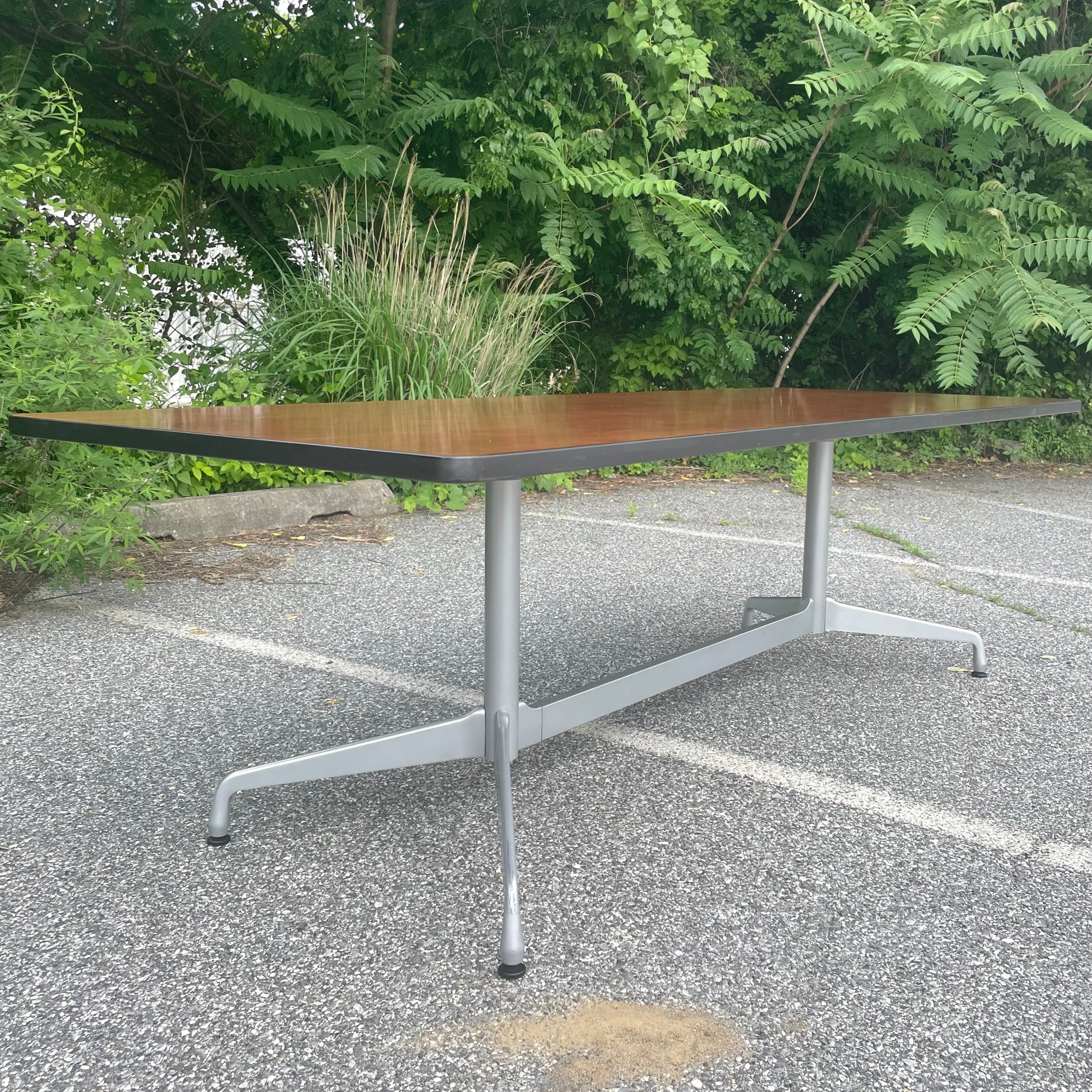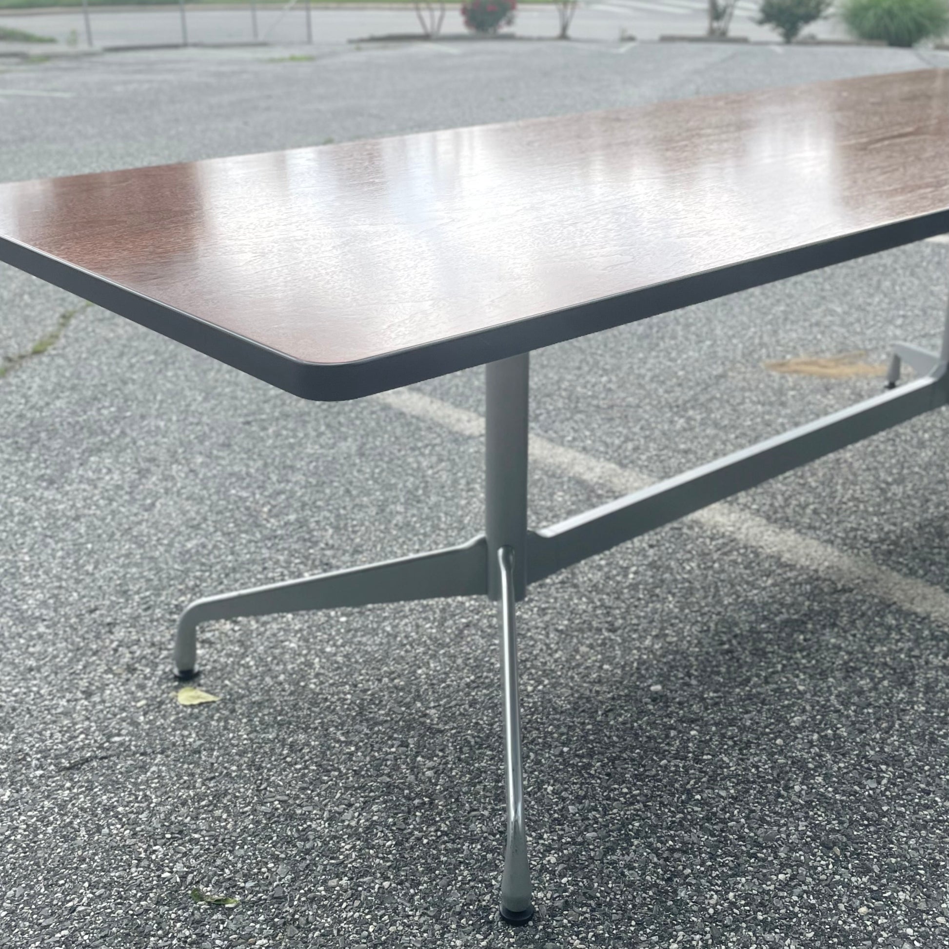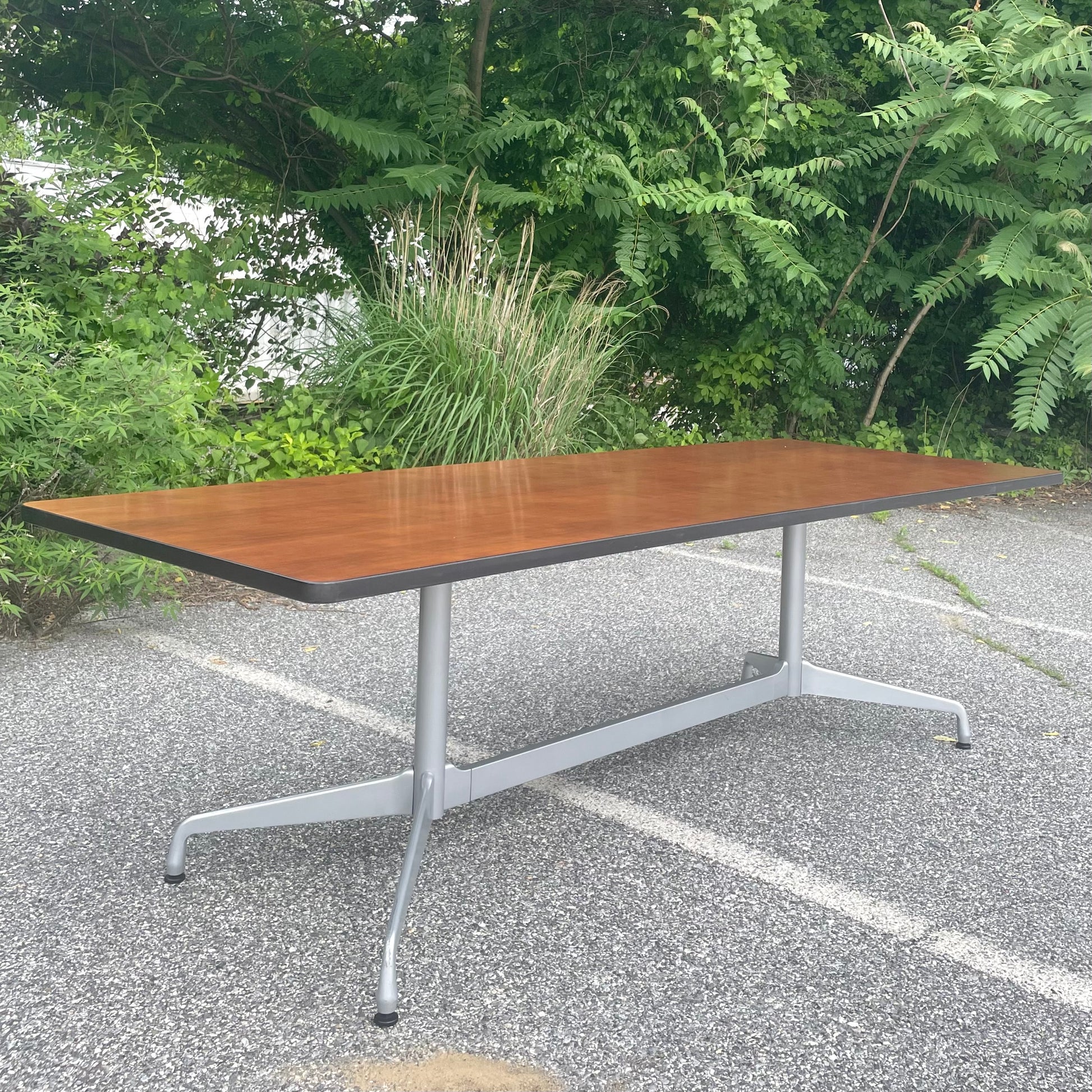 Eames designed model ’ET189C’ conference/dining table in walnut and vinyl edge, with a segmented base in powder coated aluminum. Originally designed for Herman Miller in 1964 and still built today, this example is dated 01/13/2011 and branded with the Eames Office label.