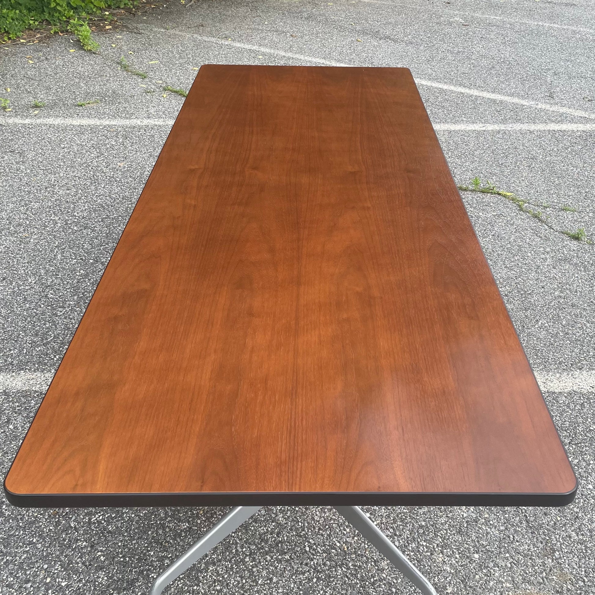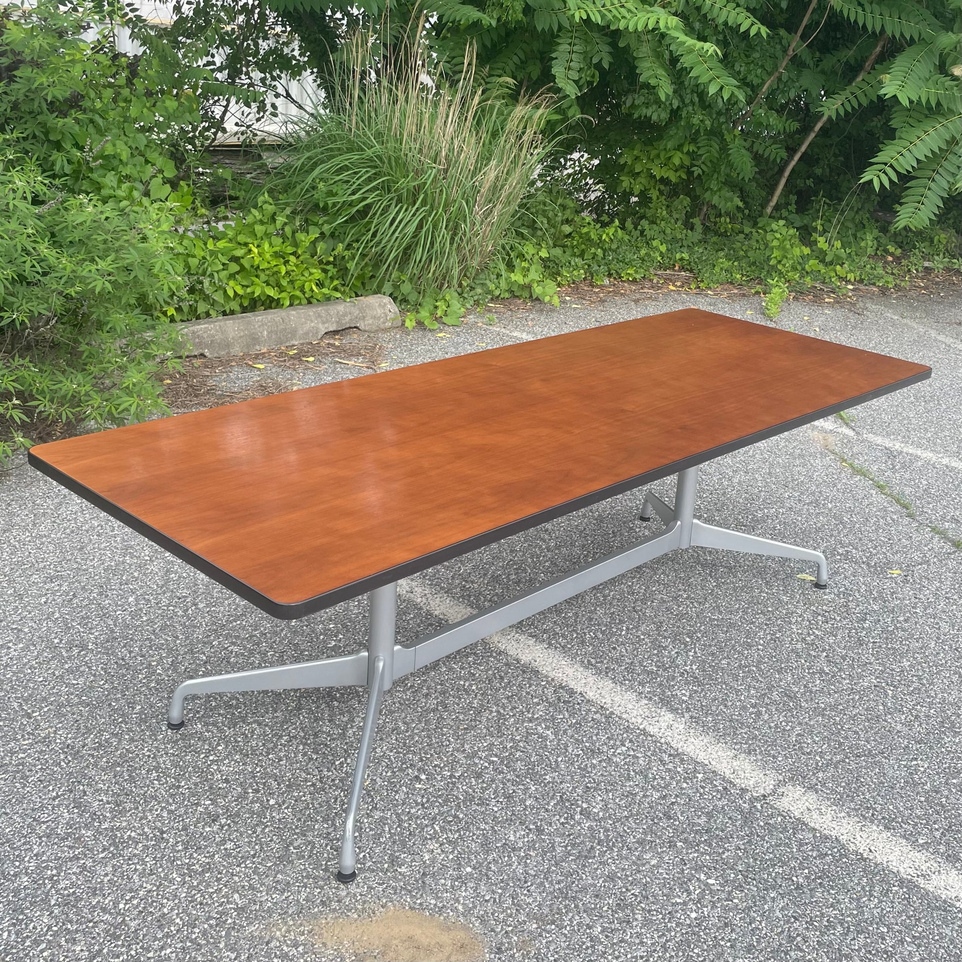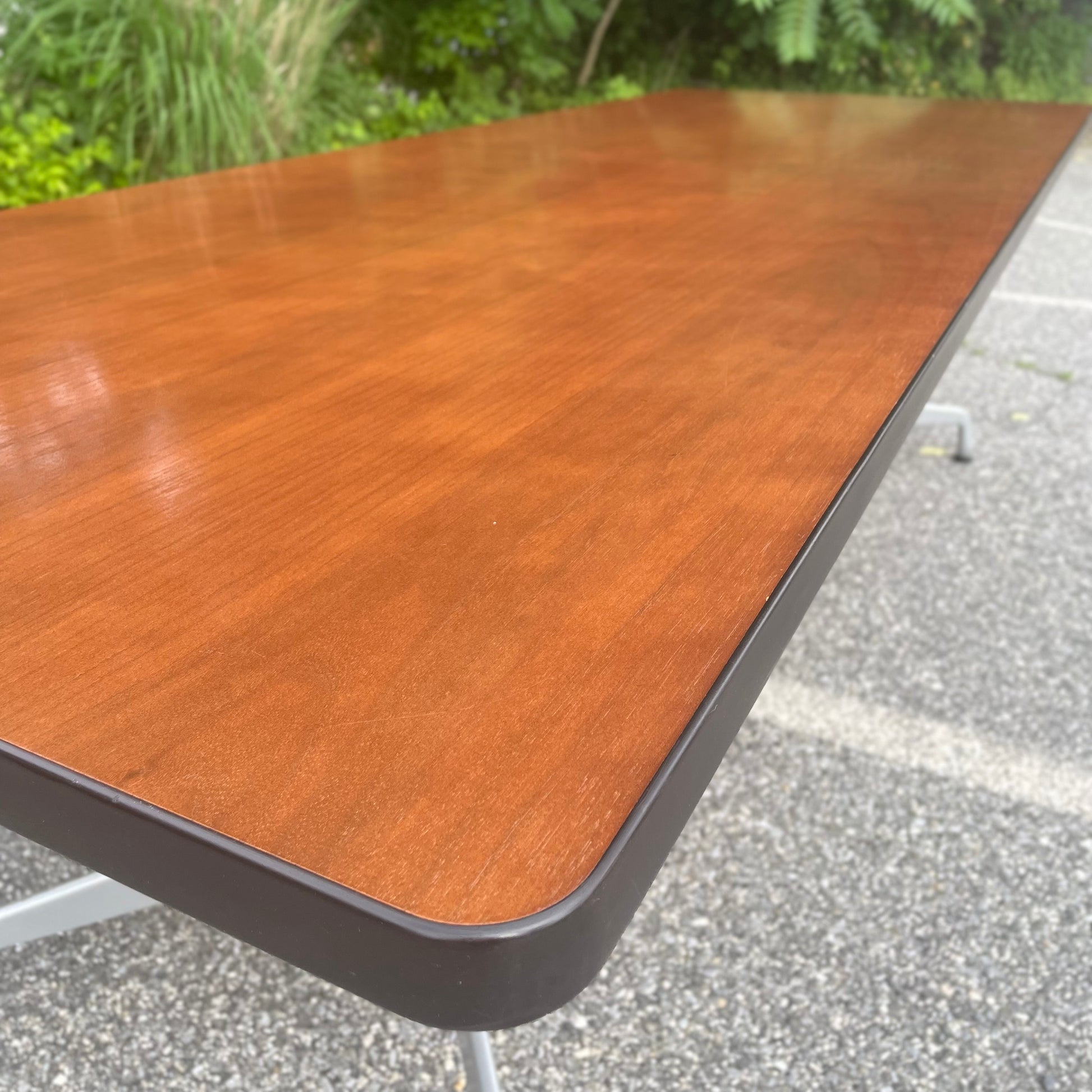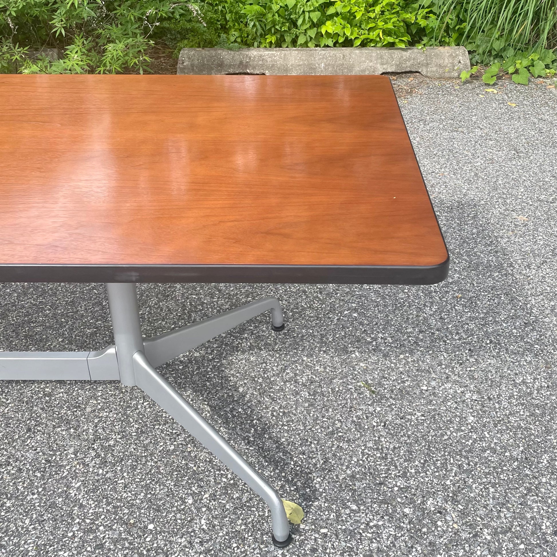 Eames designed model ’ET189C’ conference/dining table in walnut and vinyl edge, with a segmented base in powder coated aluminum. Originally designed for Herman Miller in 1964 and still built today, this example is dated 01/13/2011 and branded with the Eames Office label.