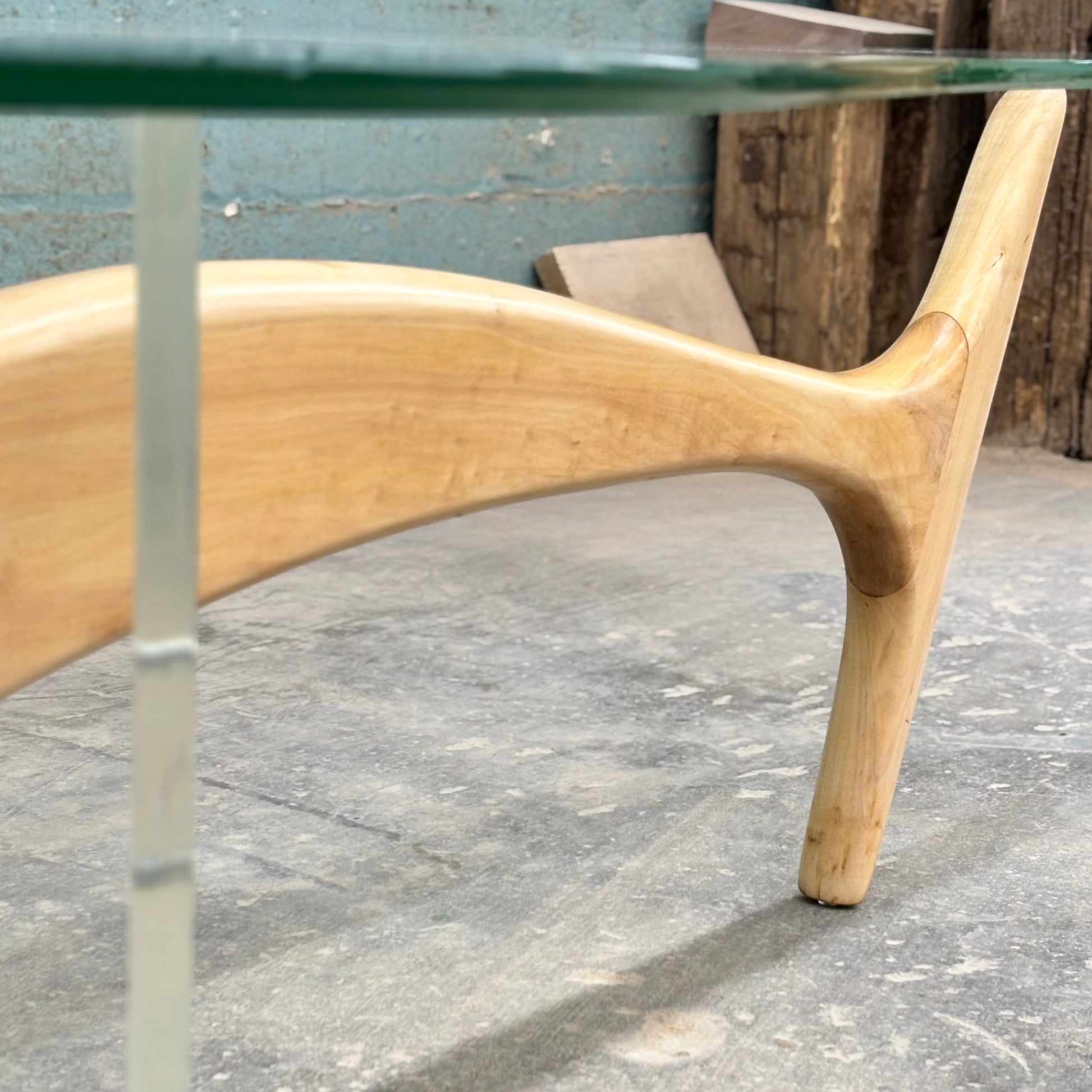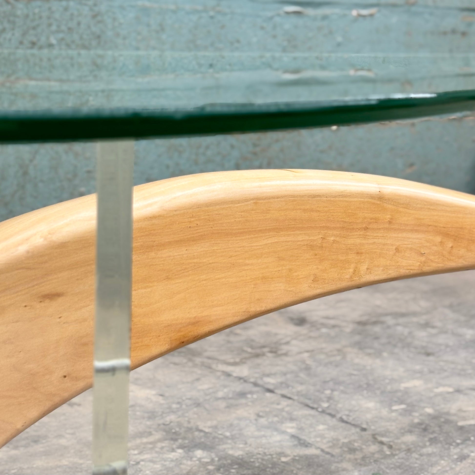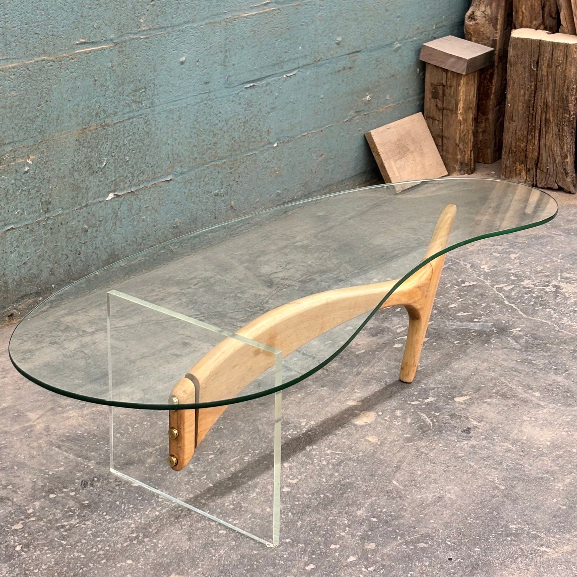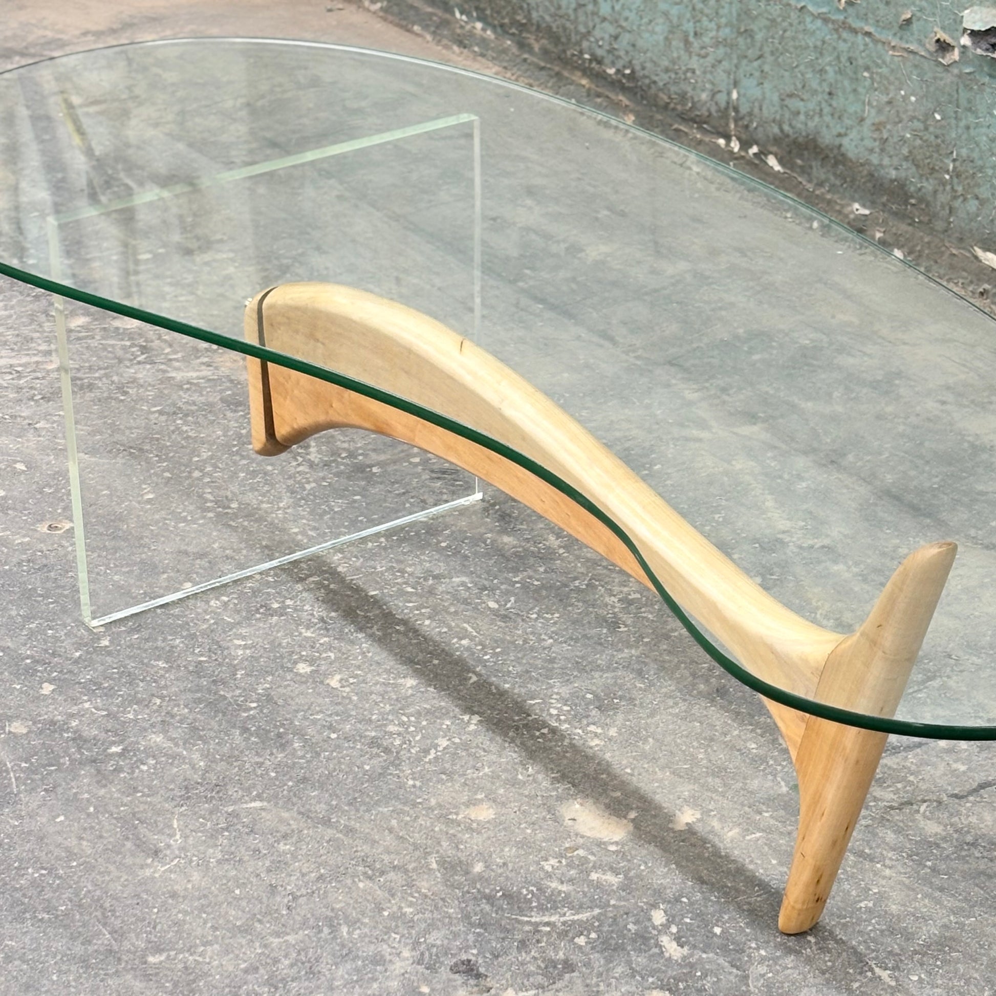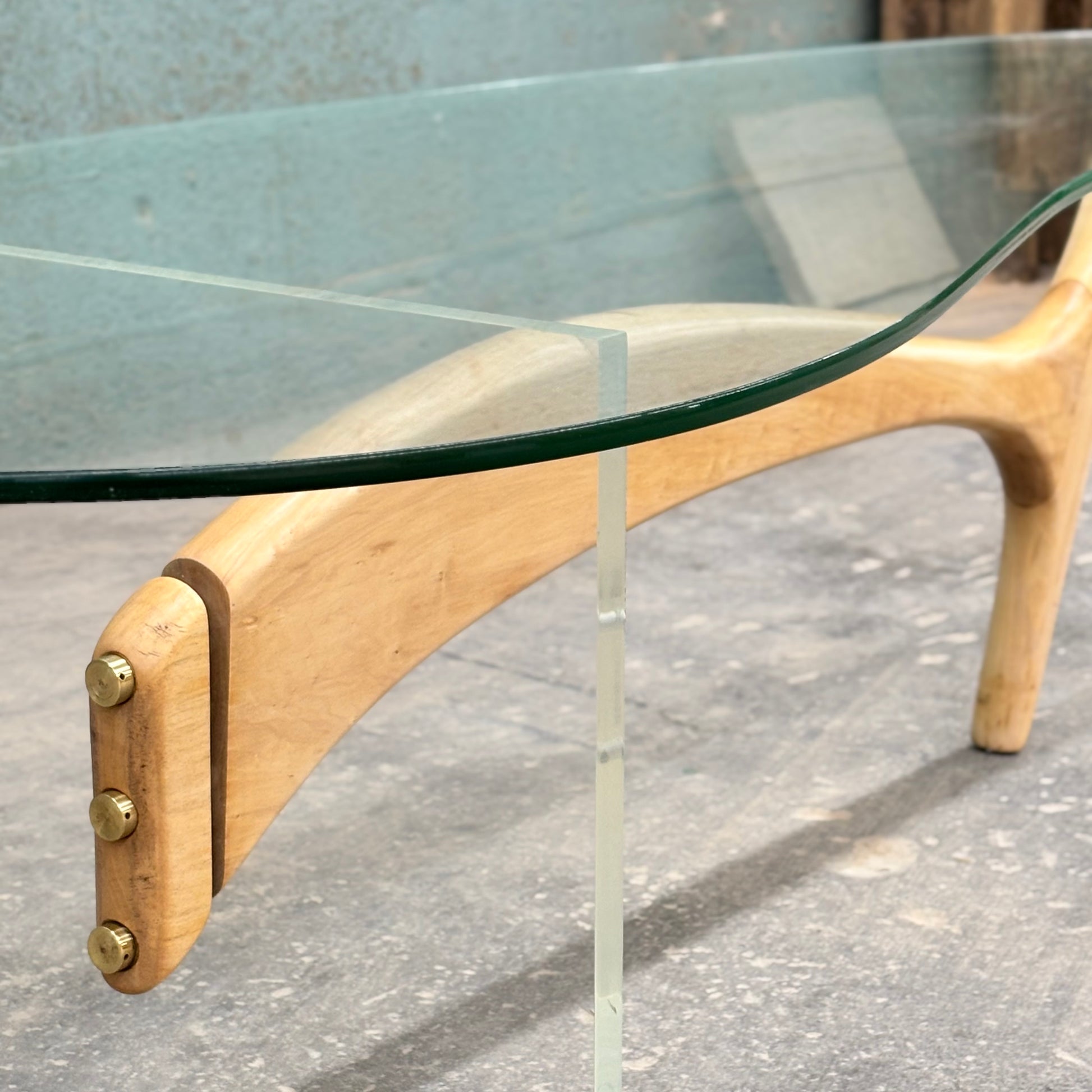 Superb sculpted maple & lucite coffee table with glass top, circa 1960s.