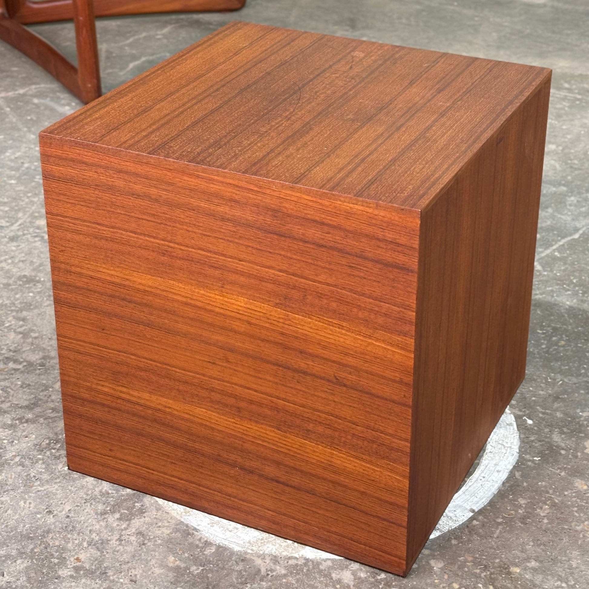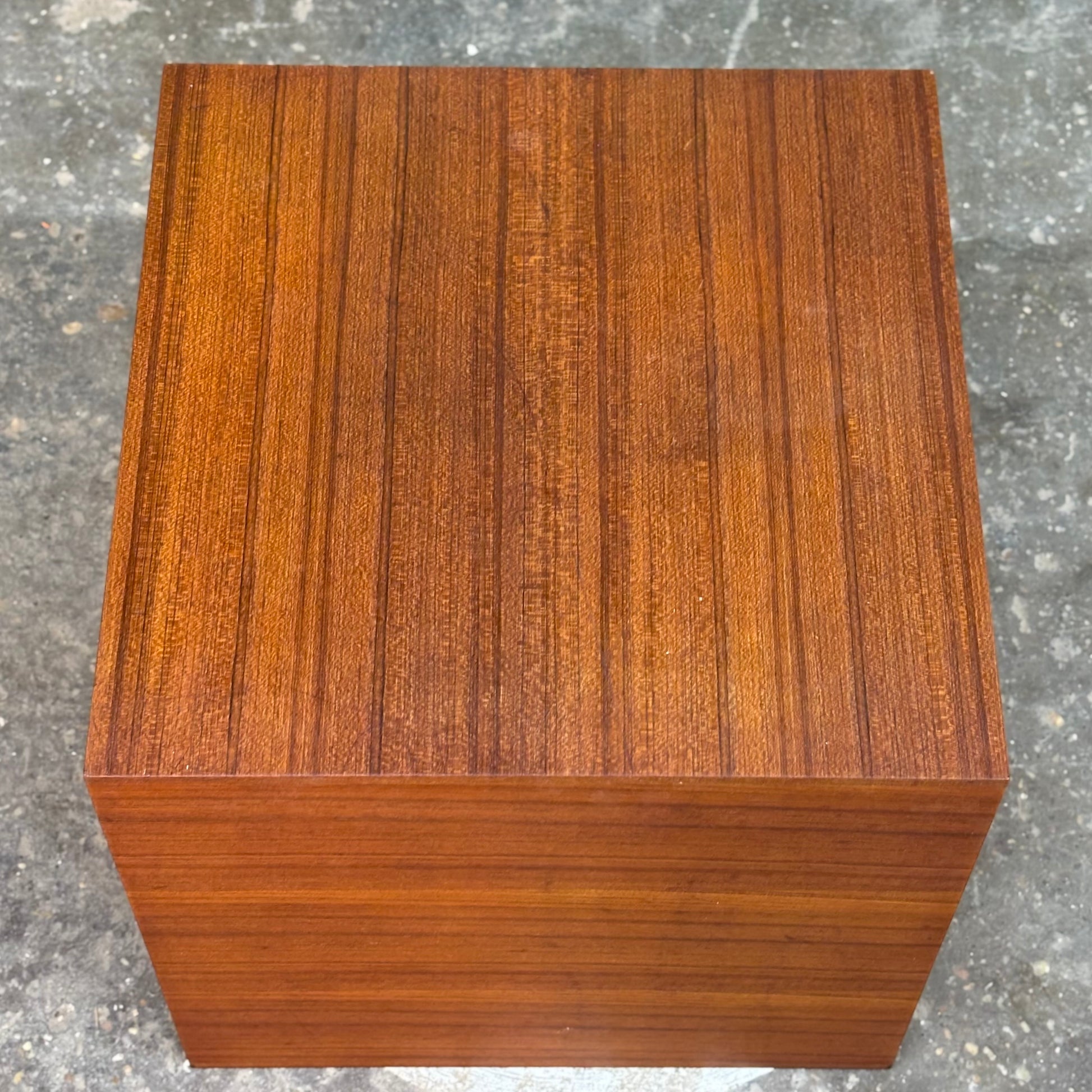 Unmarked but of great quality in material and construction. Similar to many danish designs, Milo Baughman, Paul Mayen et cetera. Formica bottom panel prevents damage to the wood surfaces, and solid teak edge banding adds extra protection for the veneer. Overall great vintage condition, shows some wear on the top panel but does not have any glaring cosmetic issues otherwise.