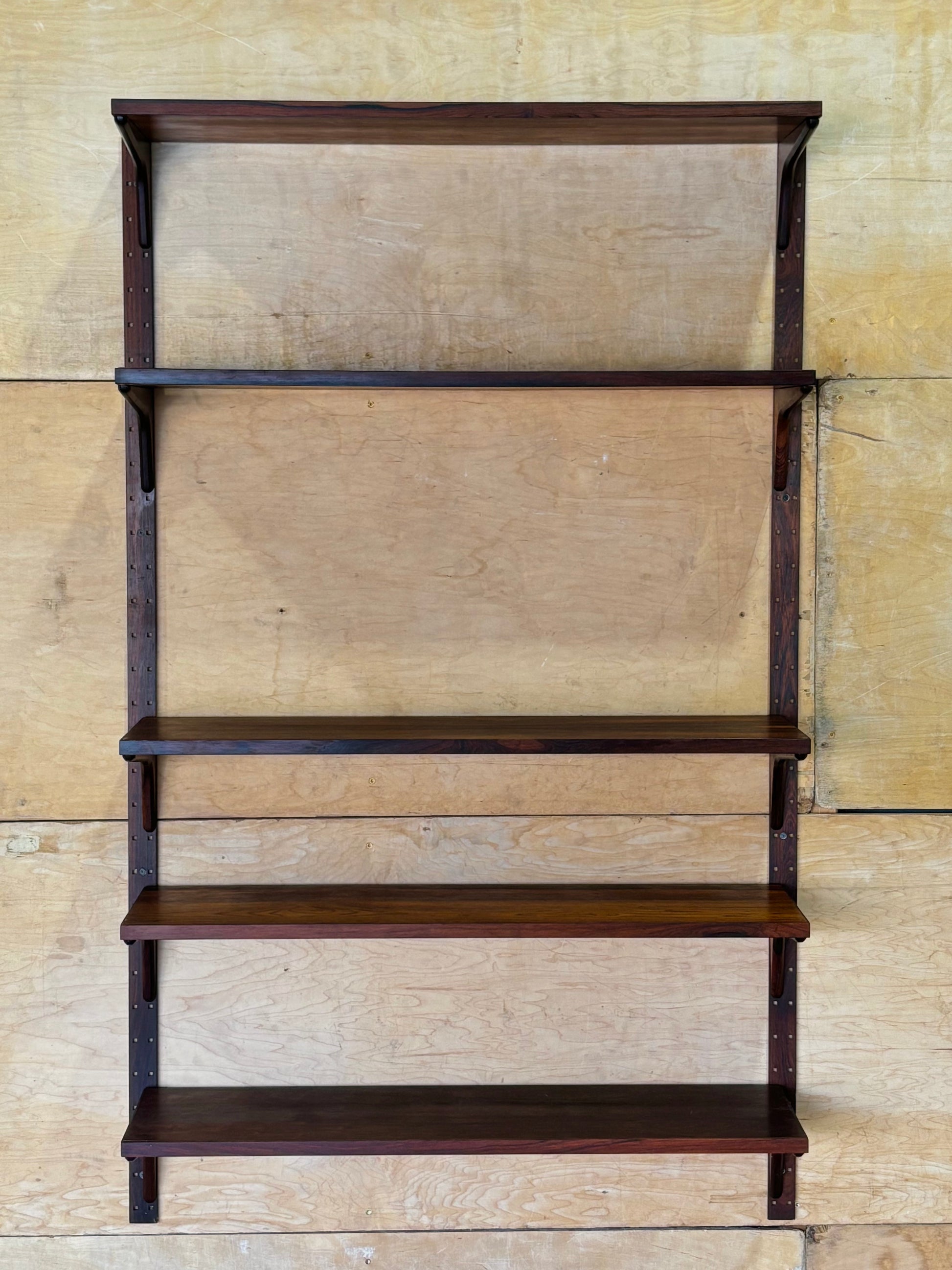 This classic Danish shelving system is an ideal choice for adding storage or display space in a very aesthetically pleasing way. Shown as a single bay configuration, there are 5 rails available to make a 4-bay system. Included components for the price shown are: