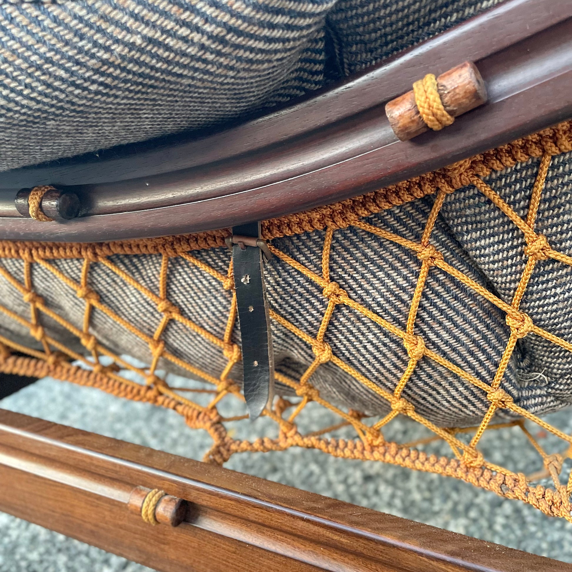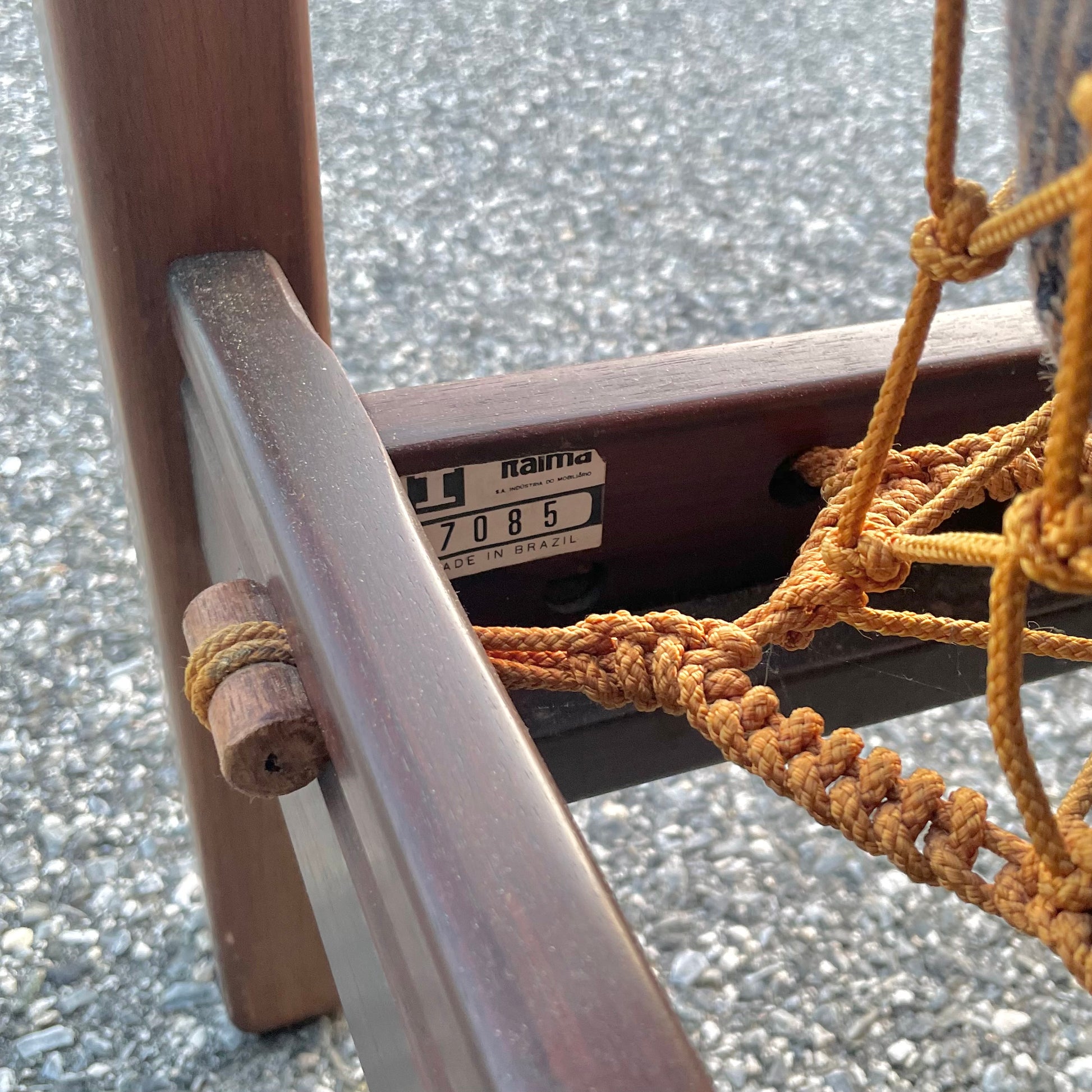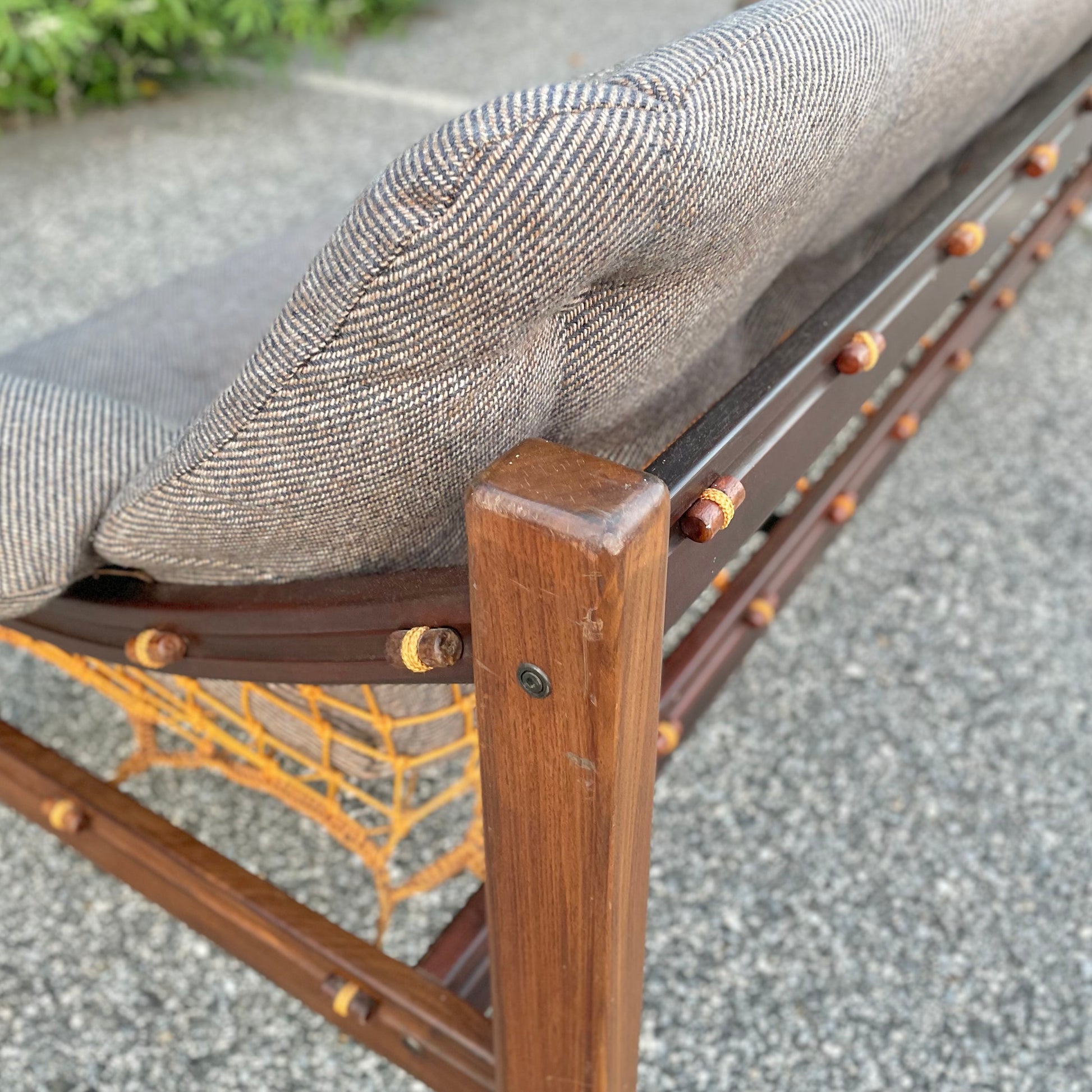 effortlessly beautiful; this is one of Jean Gillon’s best. Although, that is hard to say for certain since his design catalog is so incredible. This Brazilian masterpiece was designed in 1969 for Gillon’s company Italma, later renamed Woodart. The frame is crafted of solid Jacarandá-da-Bahia (Brazilian Rosewood) and the wool-upholstered cushion is supported by a hand tied, traditional Brazilian fishing net. Each end of the netting is held in place with a simple Jacarandá dowel, adding a pleasant visual interruption to the long wood stretchers.