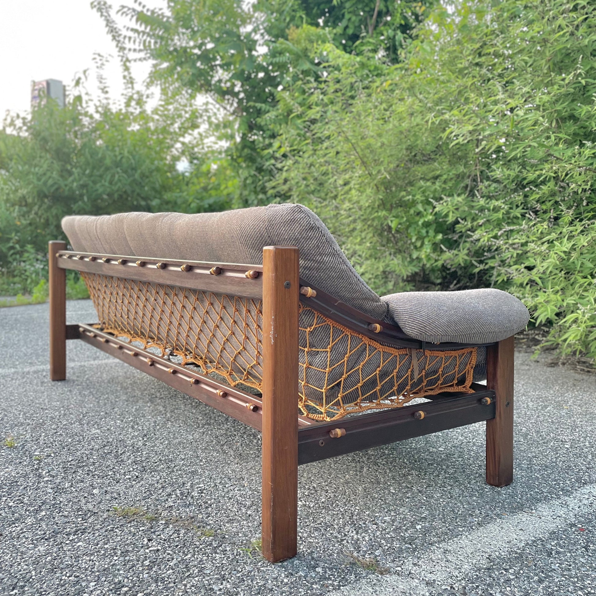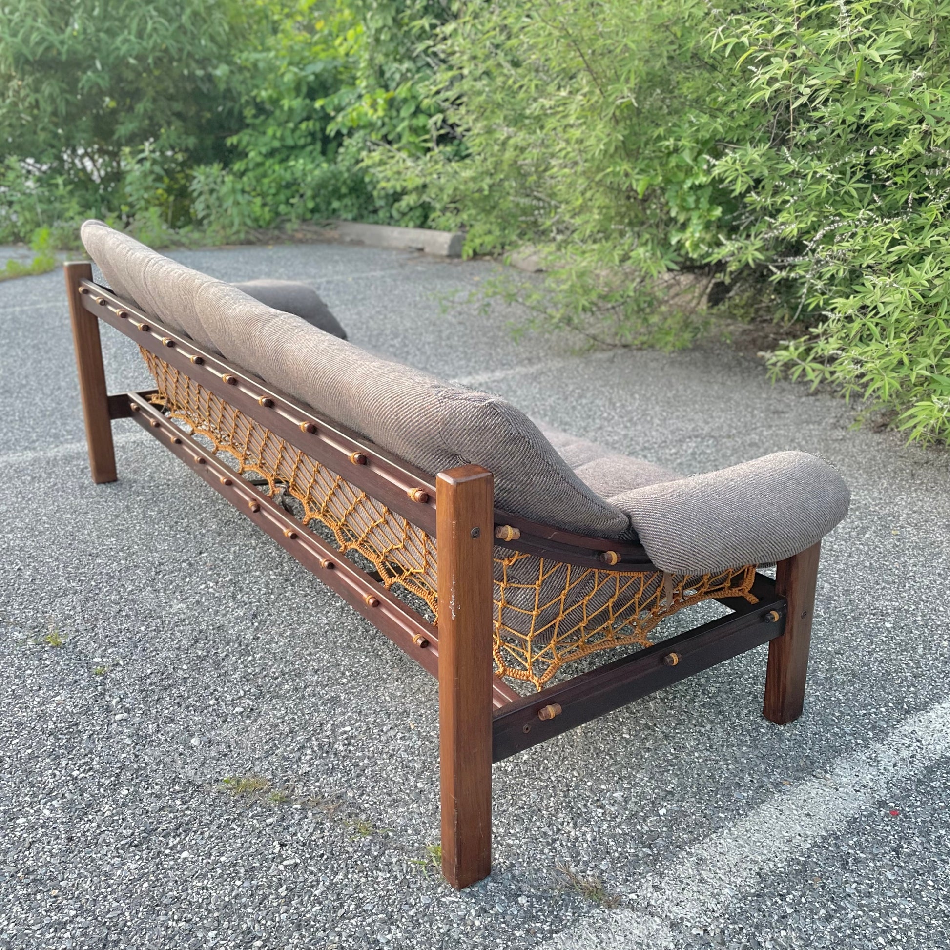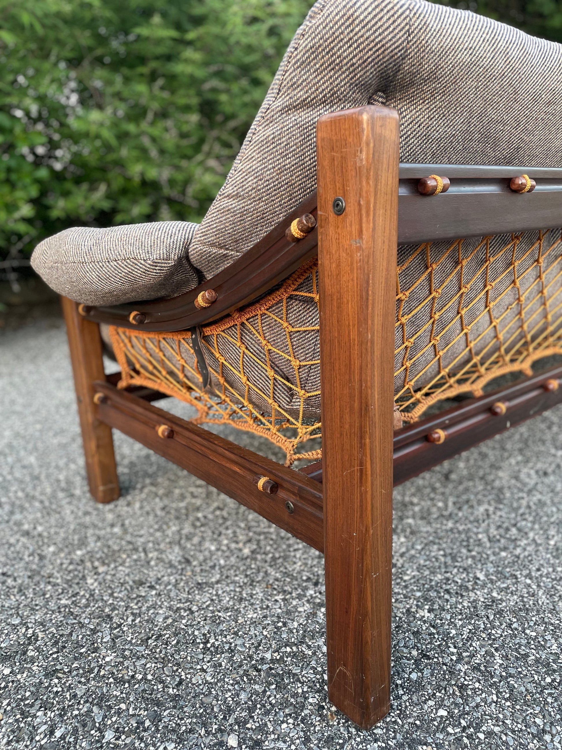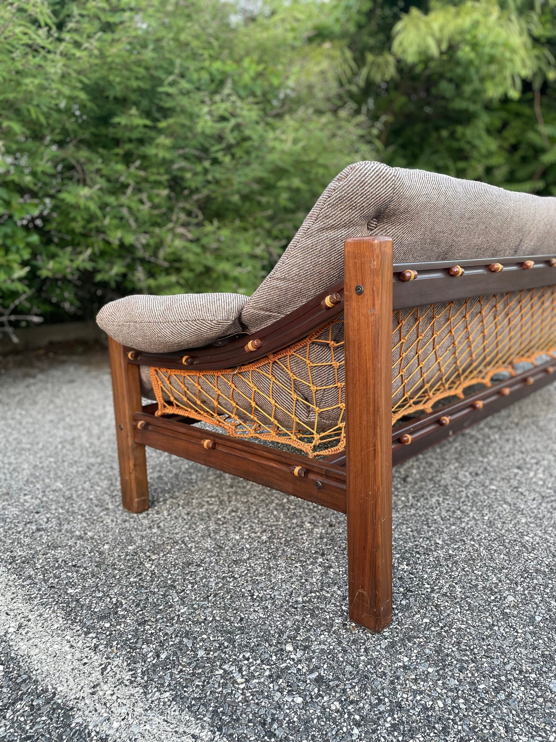 effortlessly beautiful; this is one of Jean Gillon’s best. Although, that is hard to say for certain since his design catalog is so incredible. This Brazilian masterpiece was designed in 1969 for Gillon’s company Italma, later renamed Woodart. The frame is crafted of solid Jacarandá-da-Bahia (Brazilian Rosewood) and the wool-upholstered cushion is supported by a hand tied, traditional Brazilian fishing net. Each end of the netting is held in place with a simple Jacarandá dowel, adding a pleasant visual interruption to the long wood stretchers.