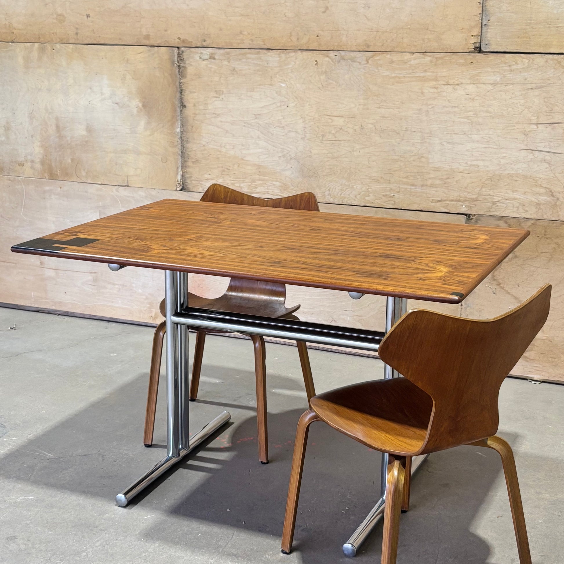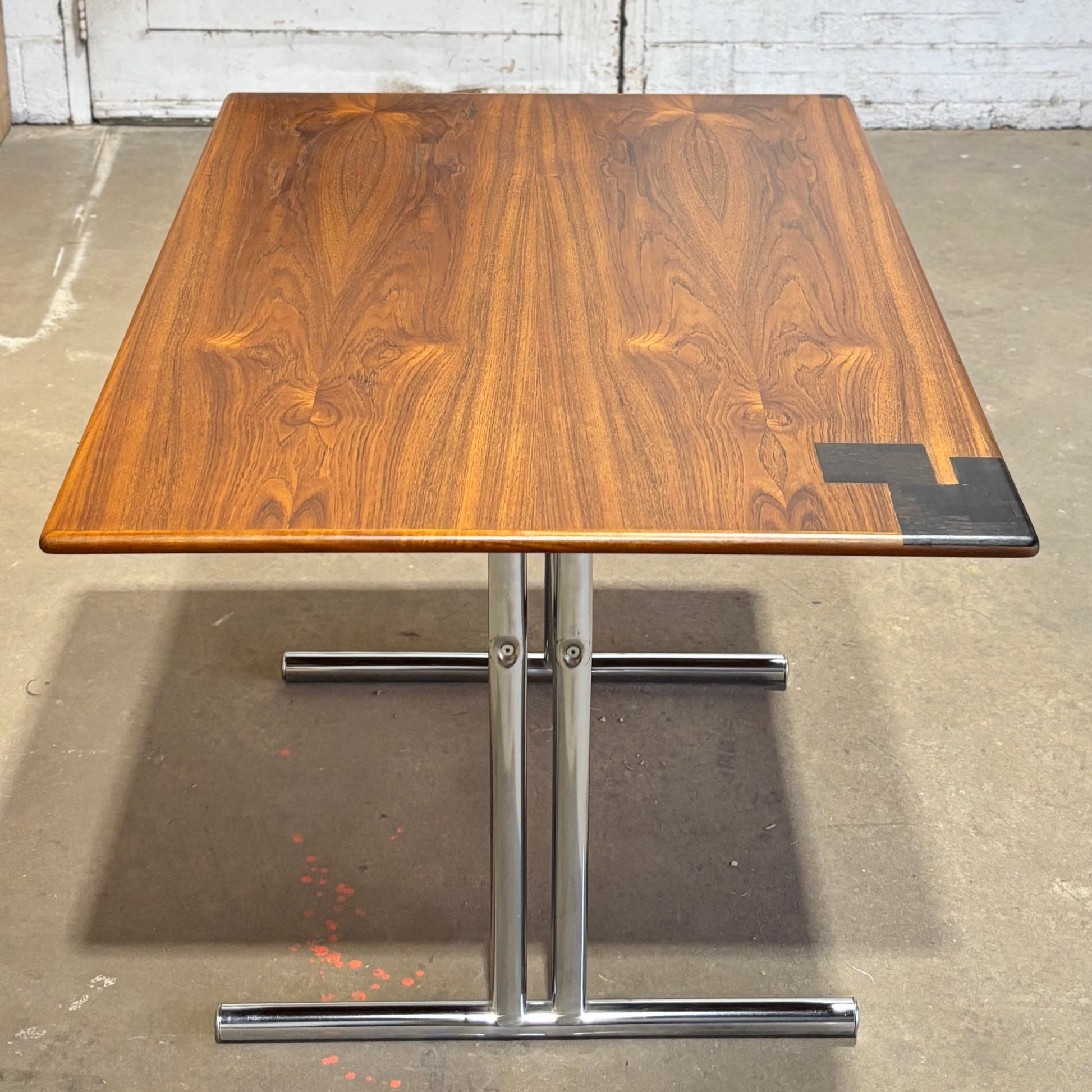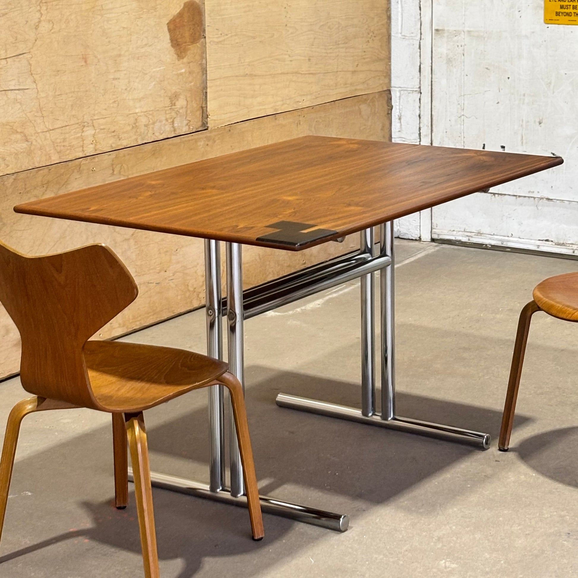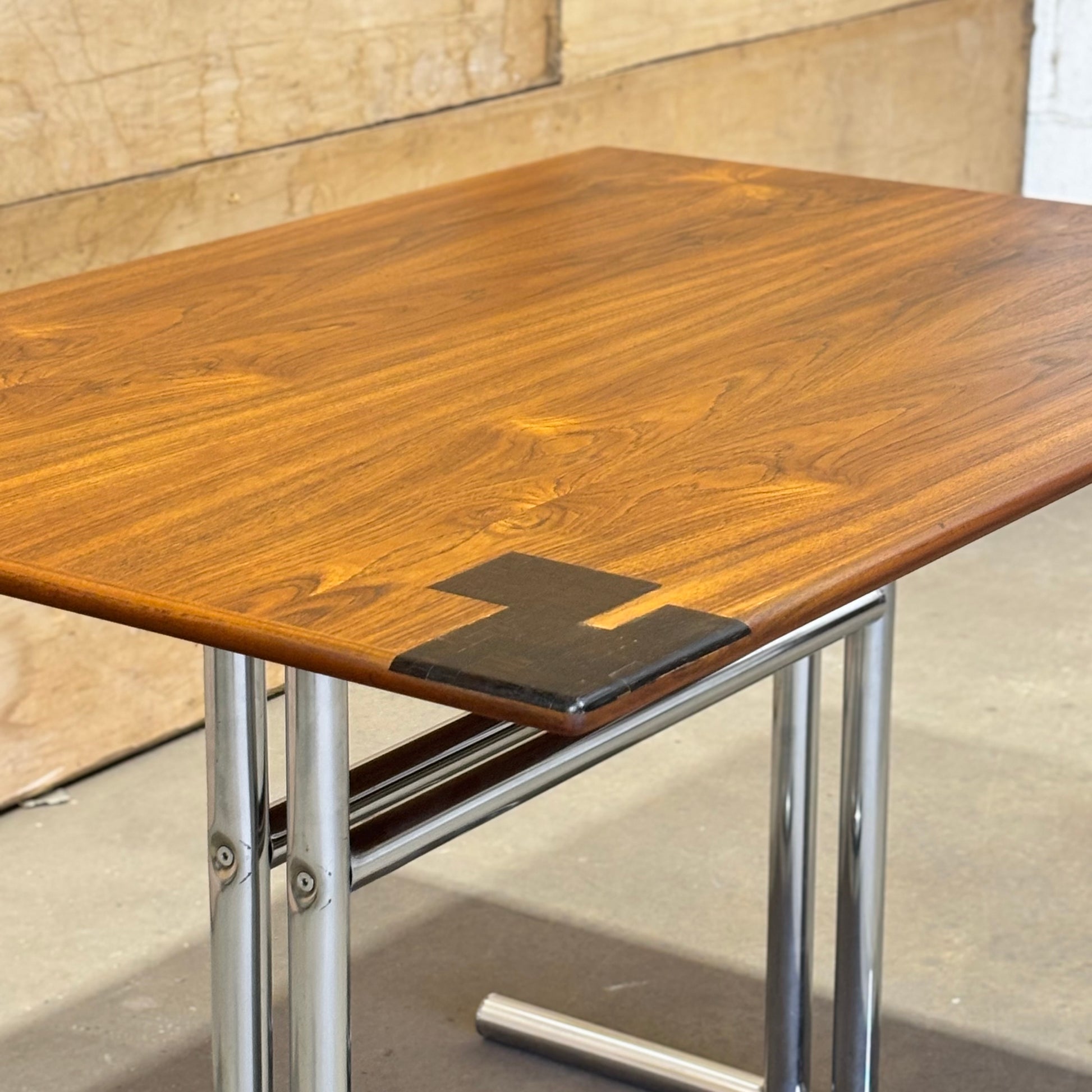 Super cool dining table consisting of a teak top, a chrome steel tubular steel base and a solid Wenge mosaic inlay. This is an amalgam of vintage components that have been repurposed into a “new” piece of furniture.