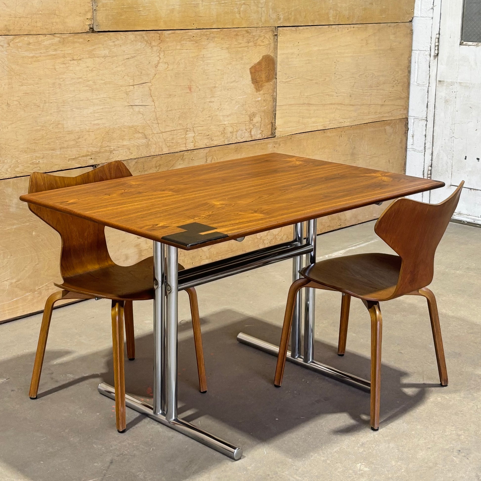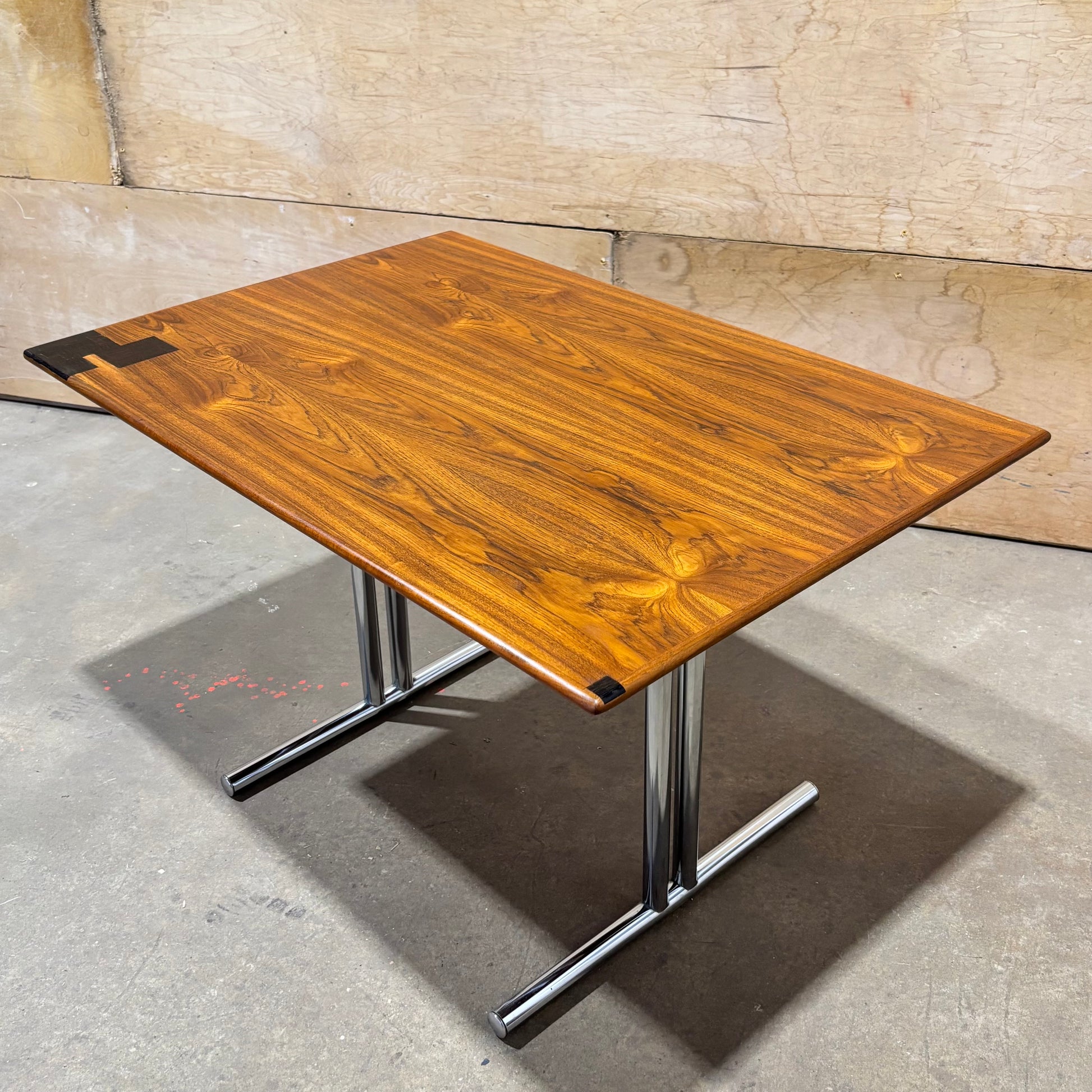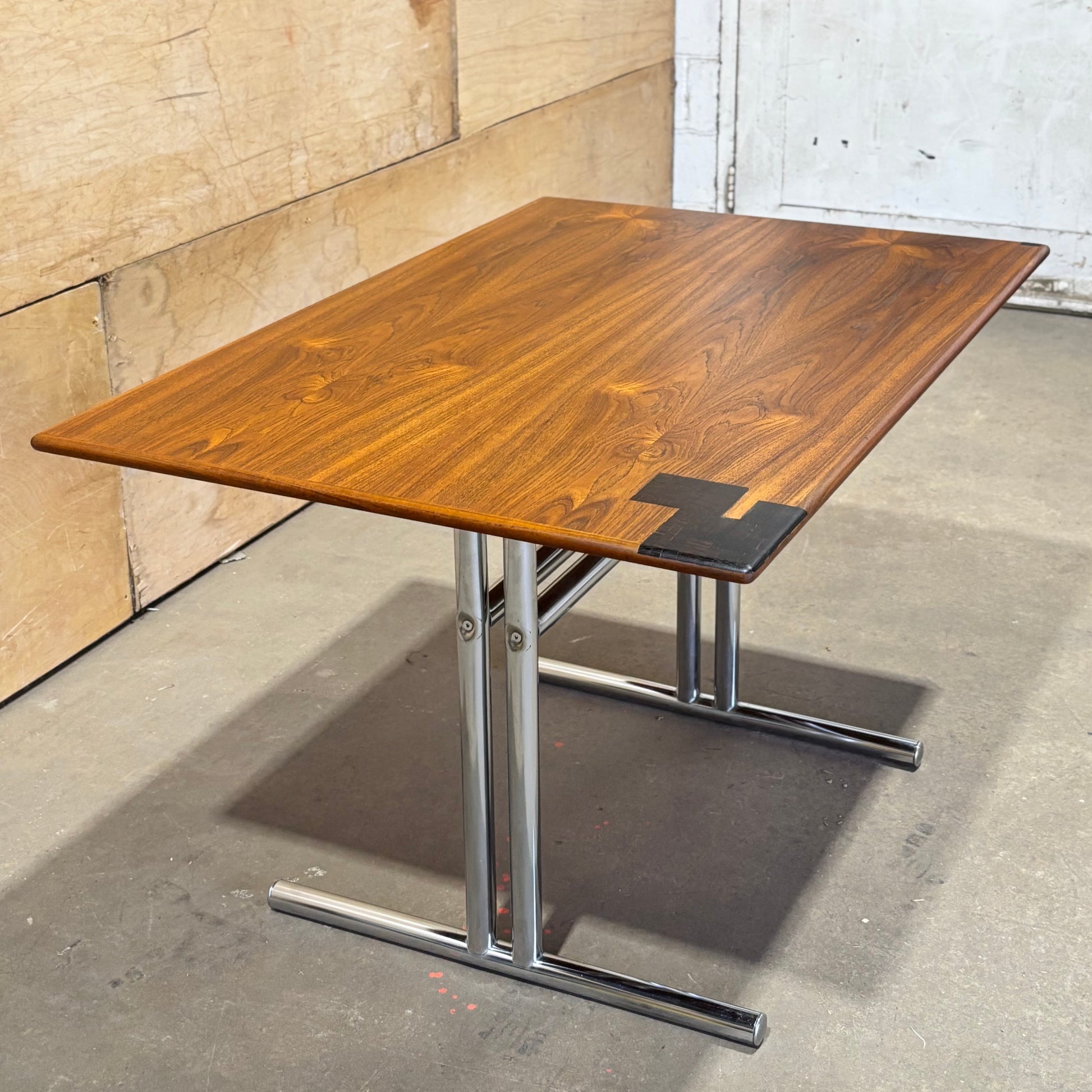 Super cool dining table consisting of a teak top, a chrome steel tubular steel base and a solid Wenge mosaic inlay. This is an amalgam of vintage components that have been repurposed into a “new” piece of furniture.