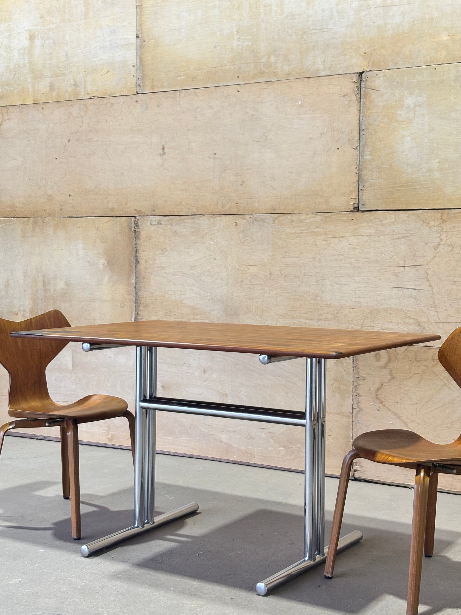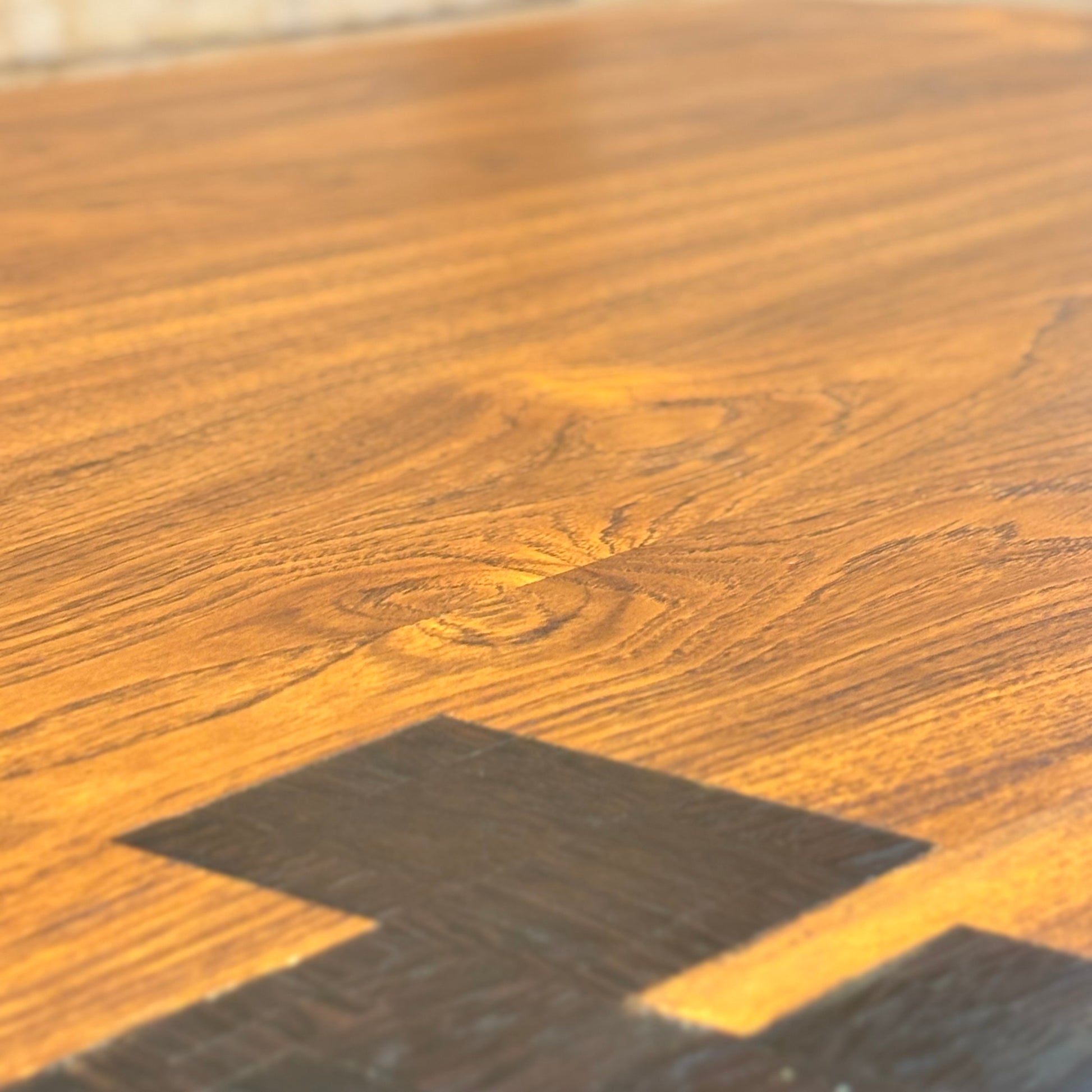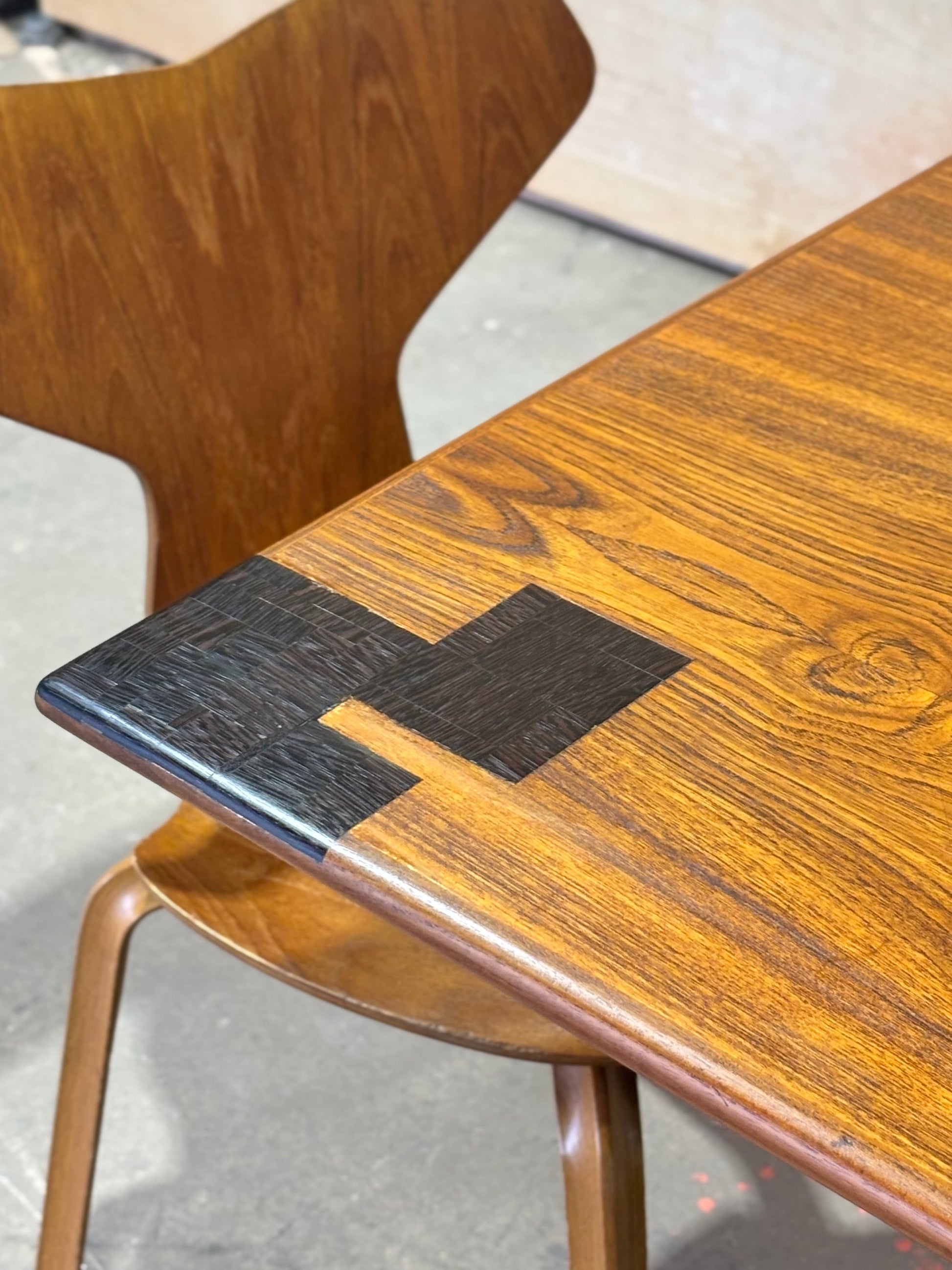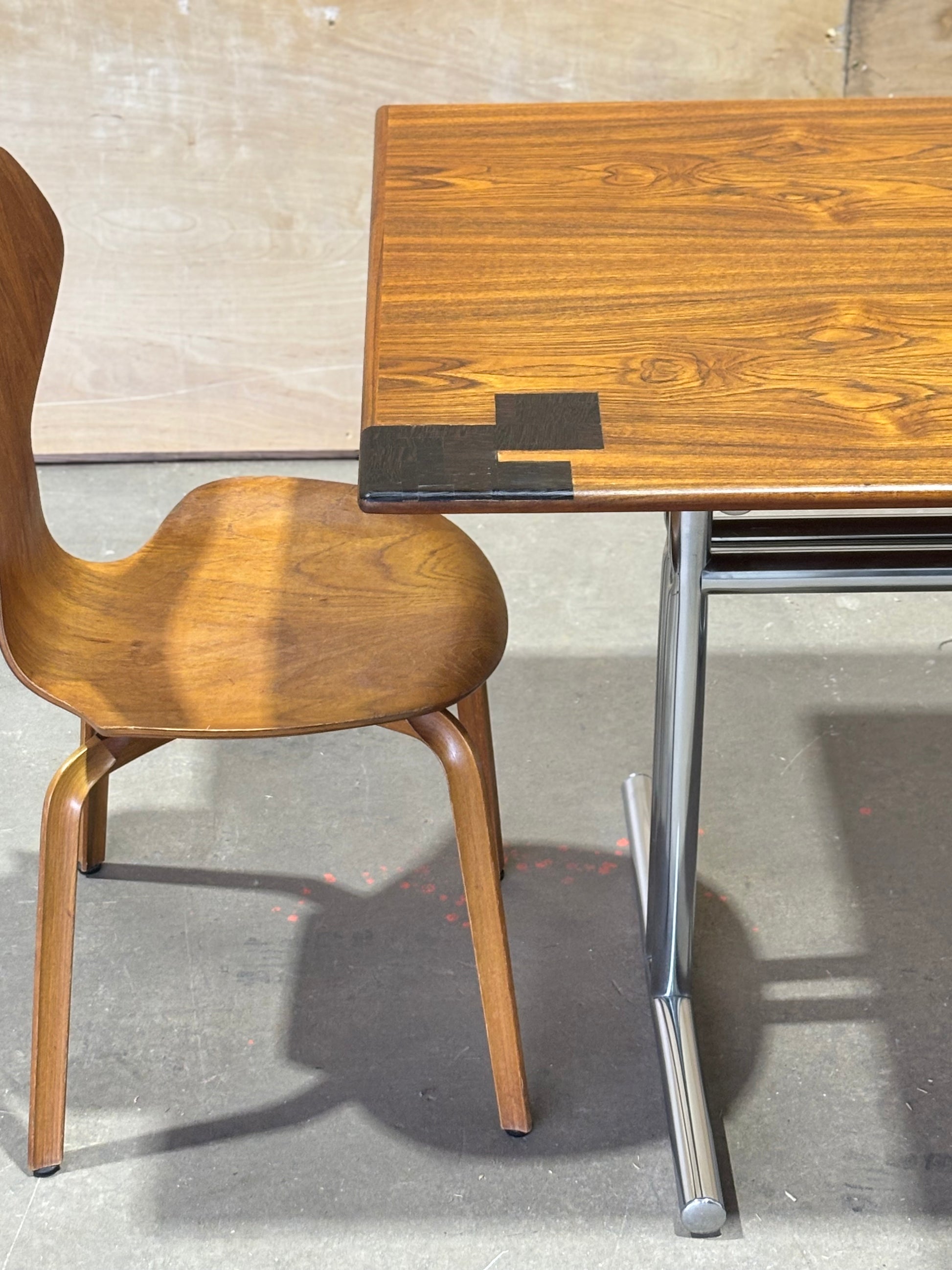 Super cool dining table consisting of a teak top, a chrome steel tubular steel base and a solid Wenge mosaic inlay. This is an amalgam of vintage components that have been repurposed into a “new” piece of furniture.