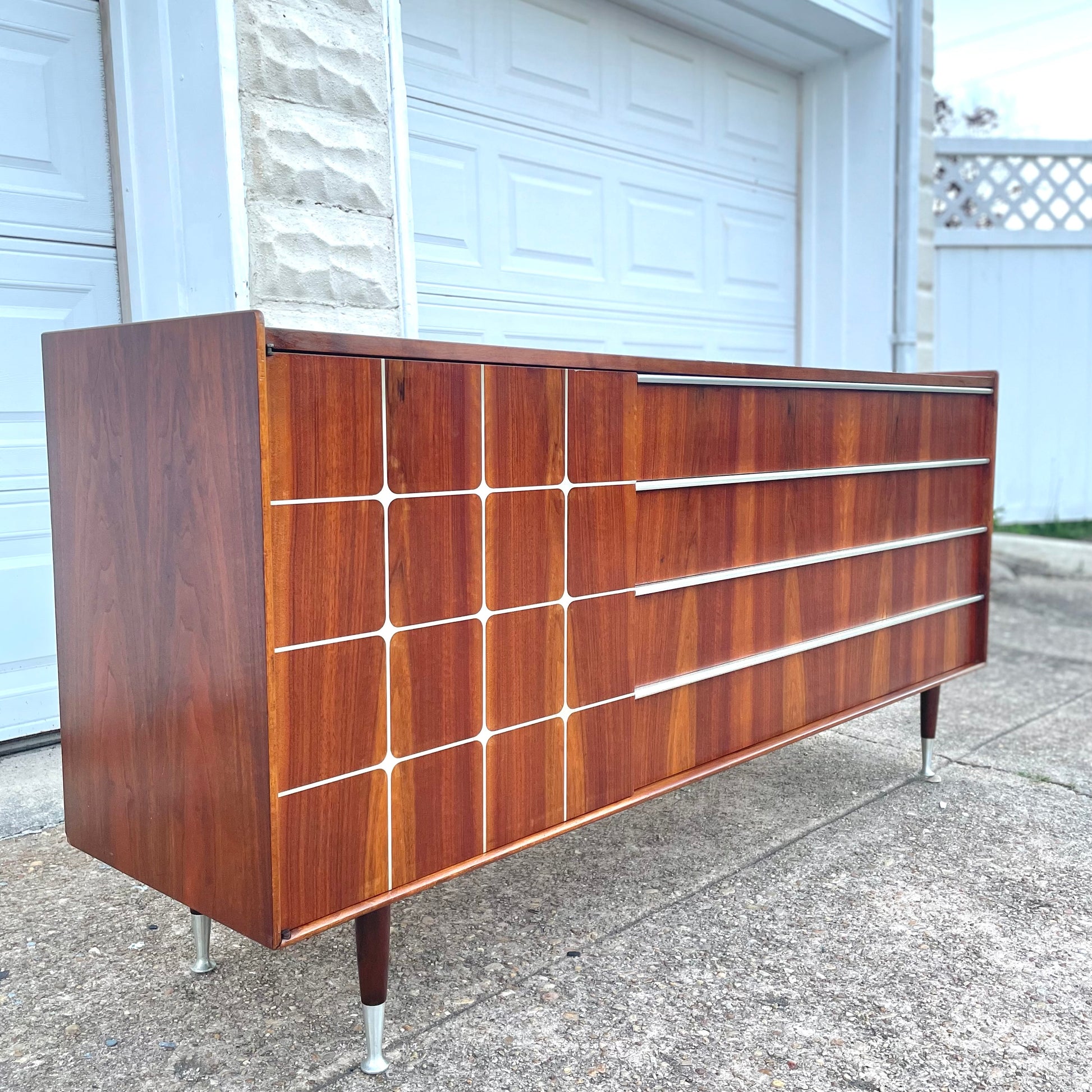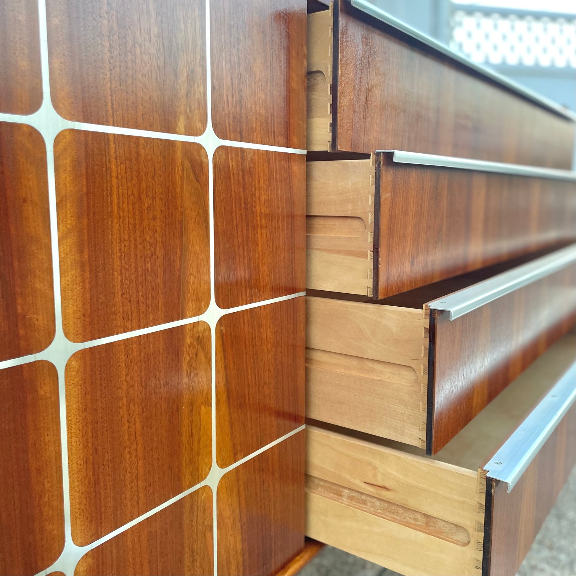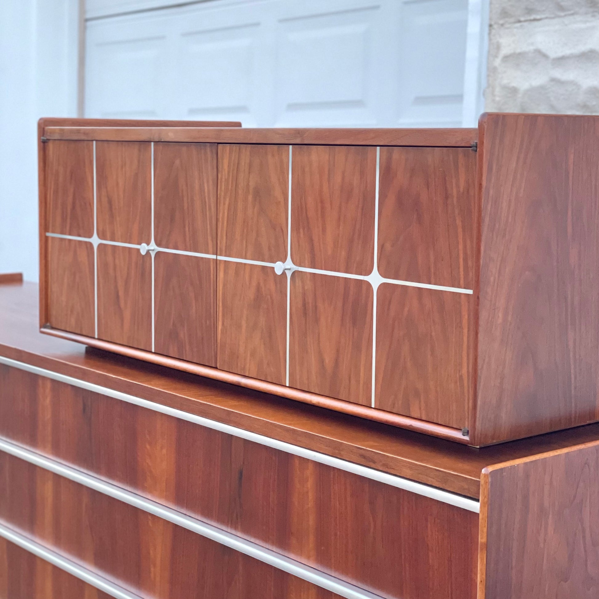 Jaw-dropping two piece sideboard/dresser in walnut & aluminum, designed by Edmond J. Spence in the early 1950s and retailed in the US by Stiehl Furniture. Marked made in Sweden on the back side.