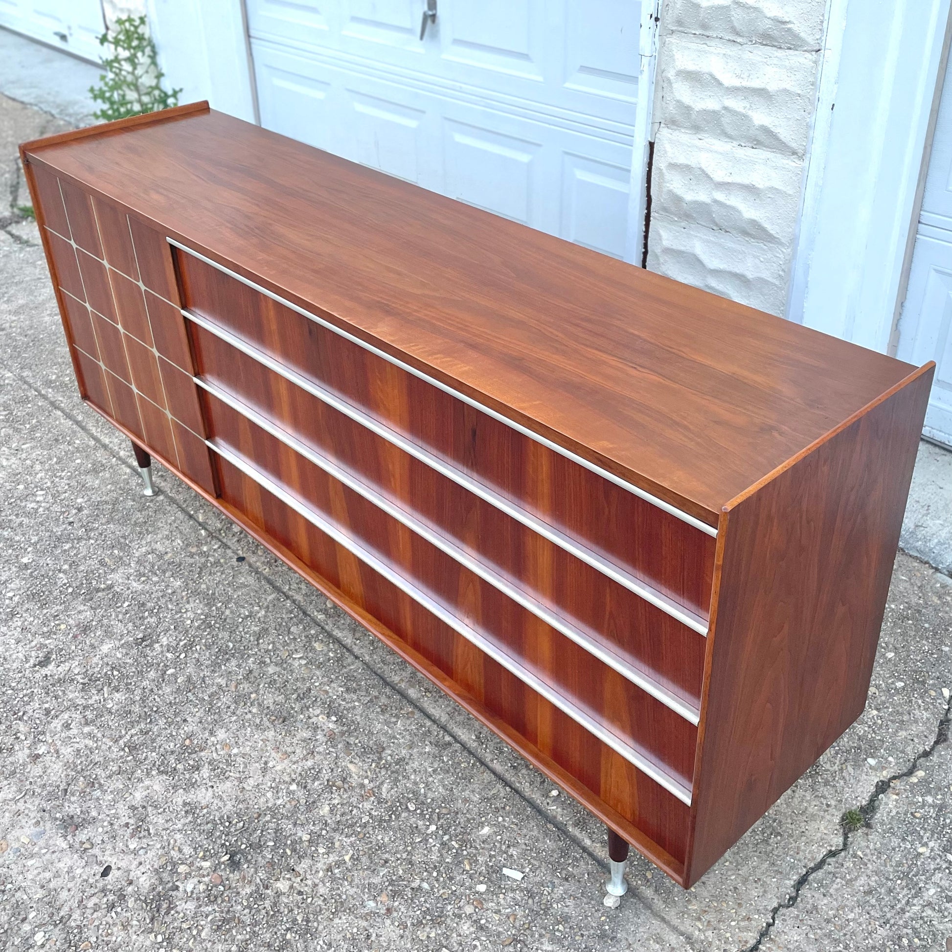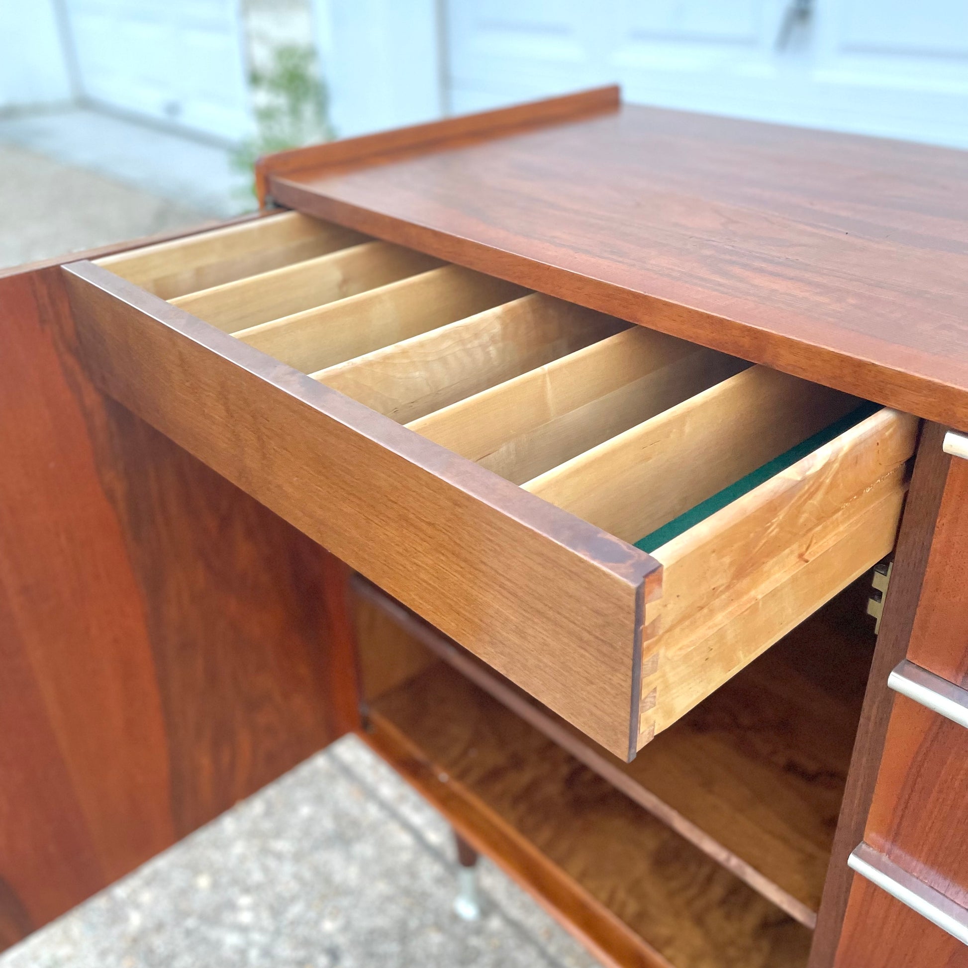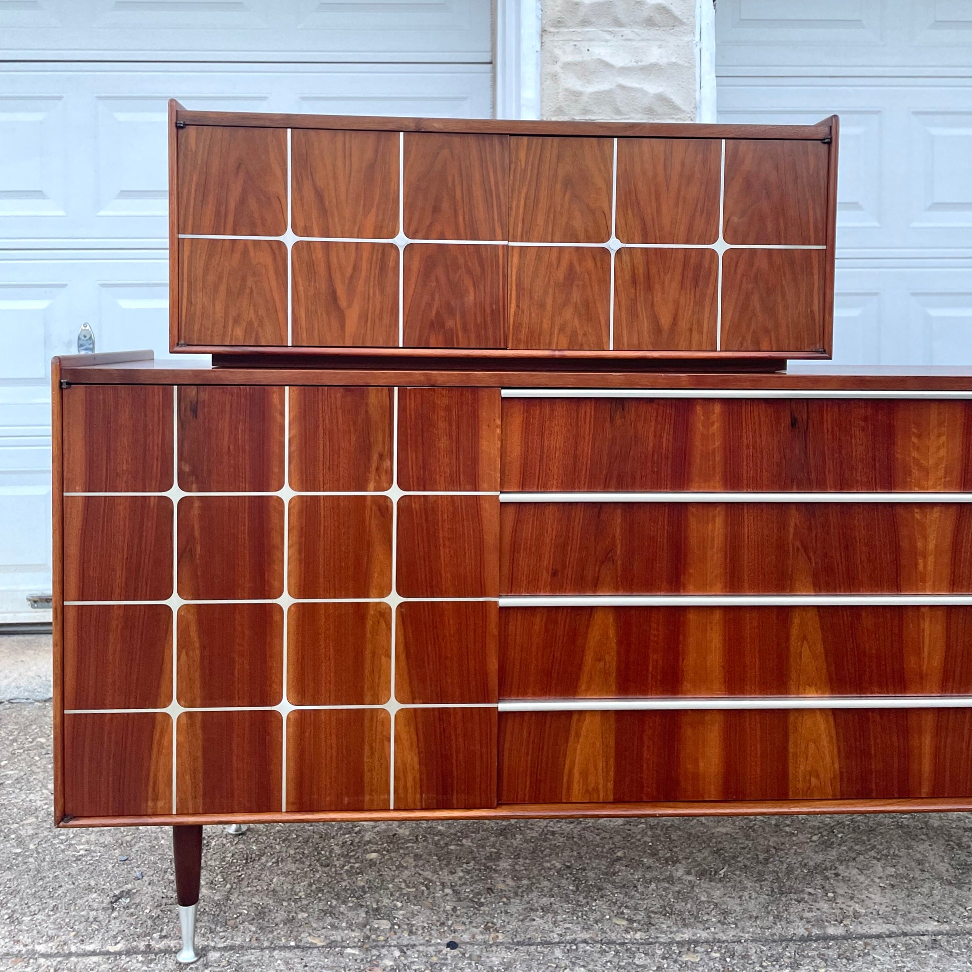 Jaw-dropping two piece sideboard/dresser in walnut & aluminum, designed by Edmond J. Spence in the early 1950s and retailed in the US by Stiehl Furniture. Marked made in Sweden on the back side.