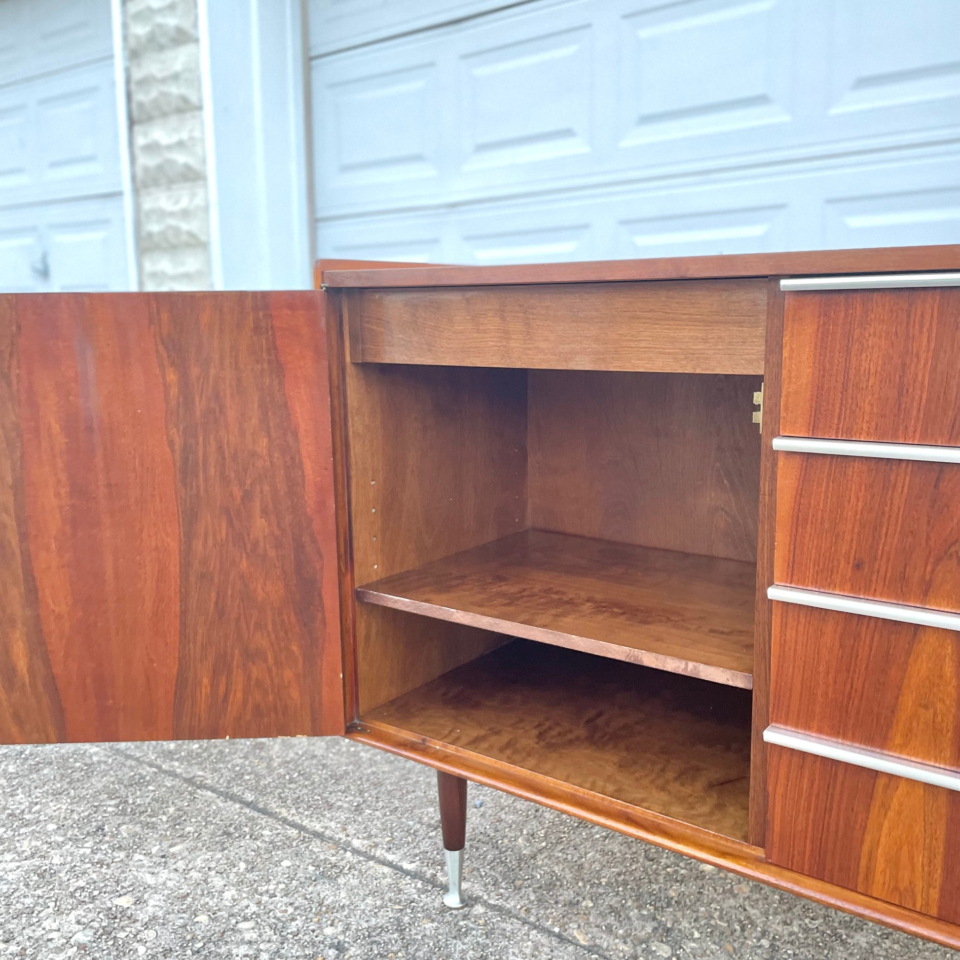 Shown in un-restored condition, this piece has been gently cleaned and oiled to bring back its natural beauty. Walnut veneer envelopes the case, with drawers, legs & a hinged door adorned in brushed aluminum. A separate top cabinet can be used with or without the sideboard, and provides perfect record or tableware storage.