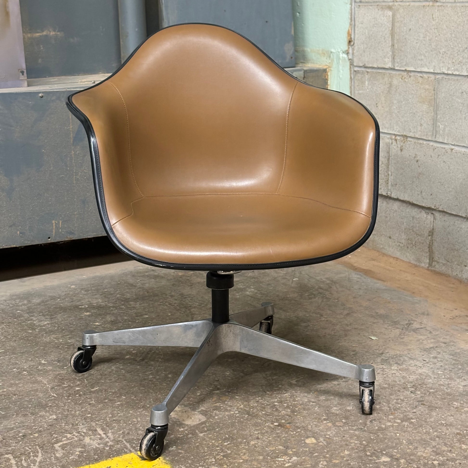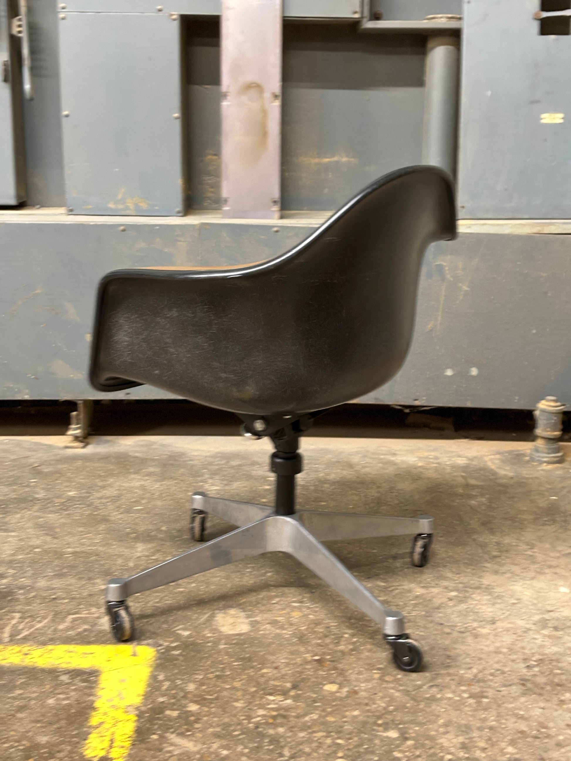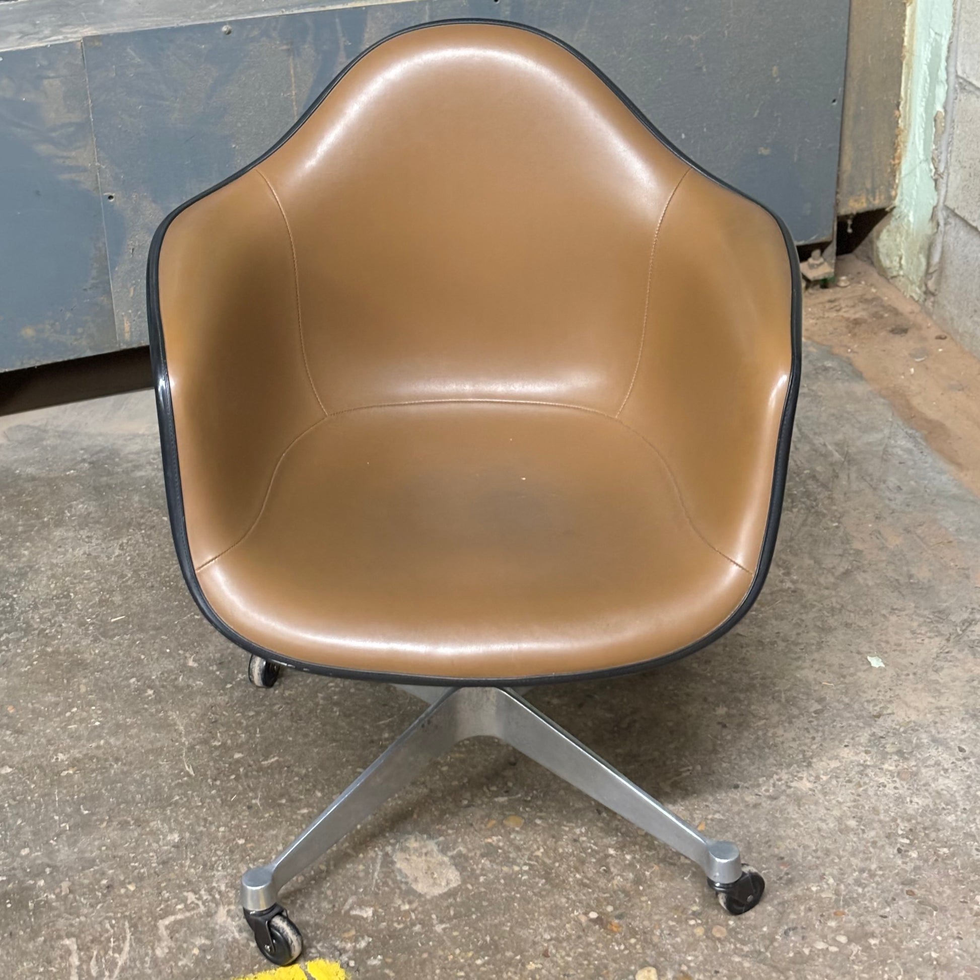 Classic Eames designed fiberglass shell chair with 4-leg contractor base and brown vinyl upholstery. Dated Jun 8th 1973.