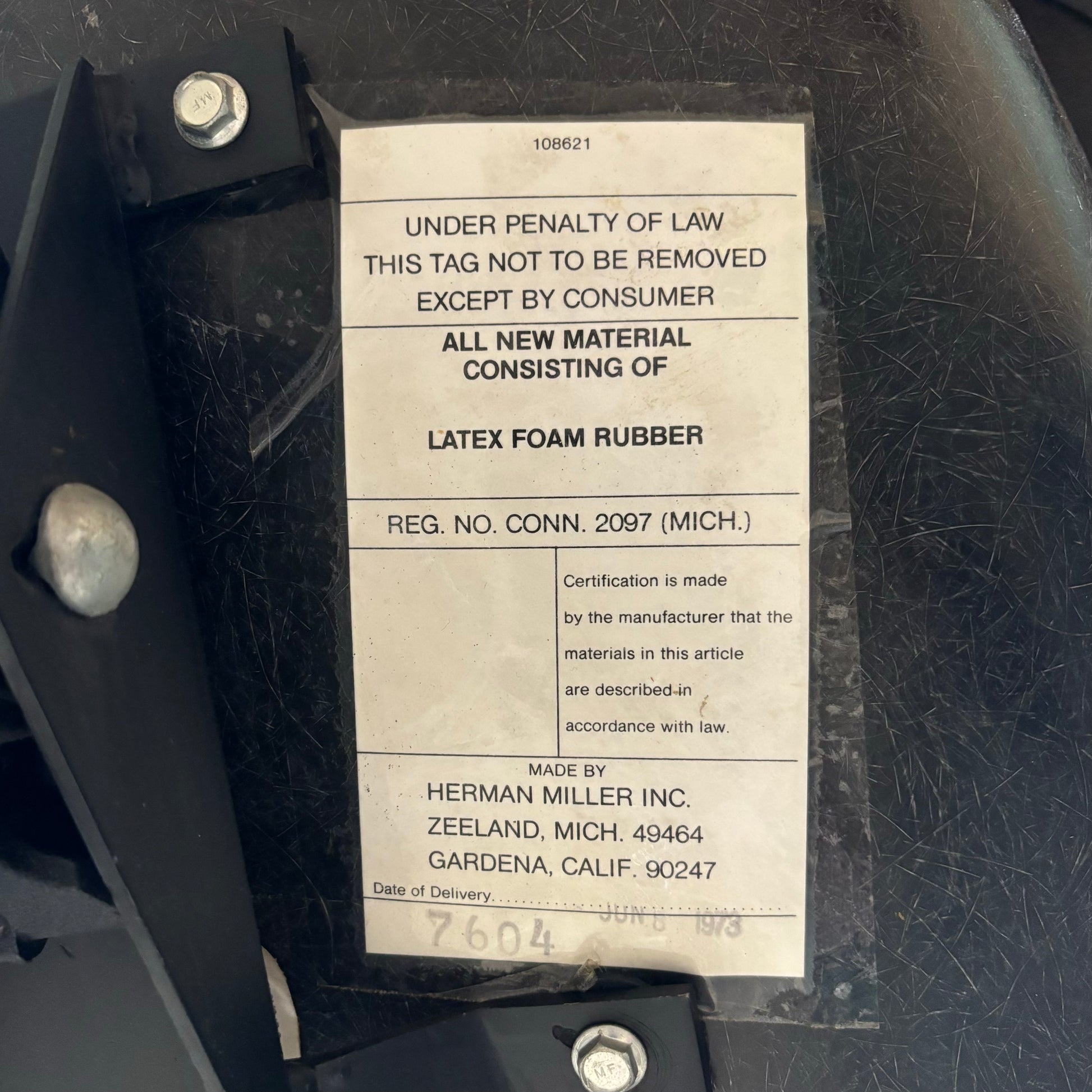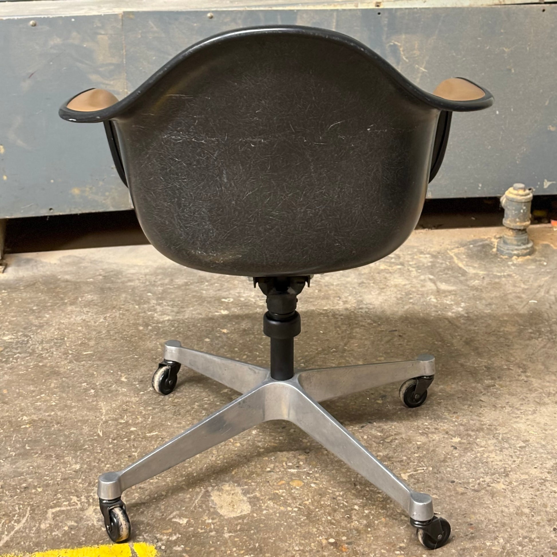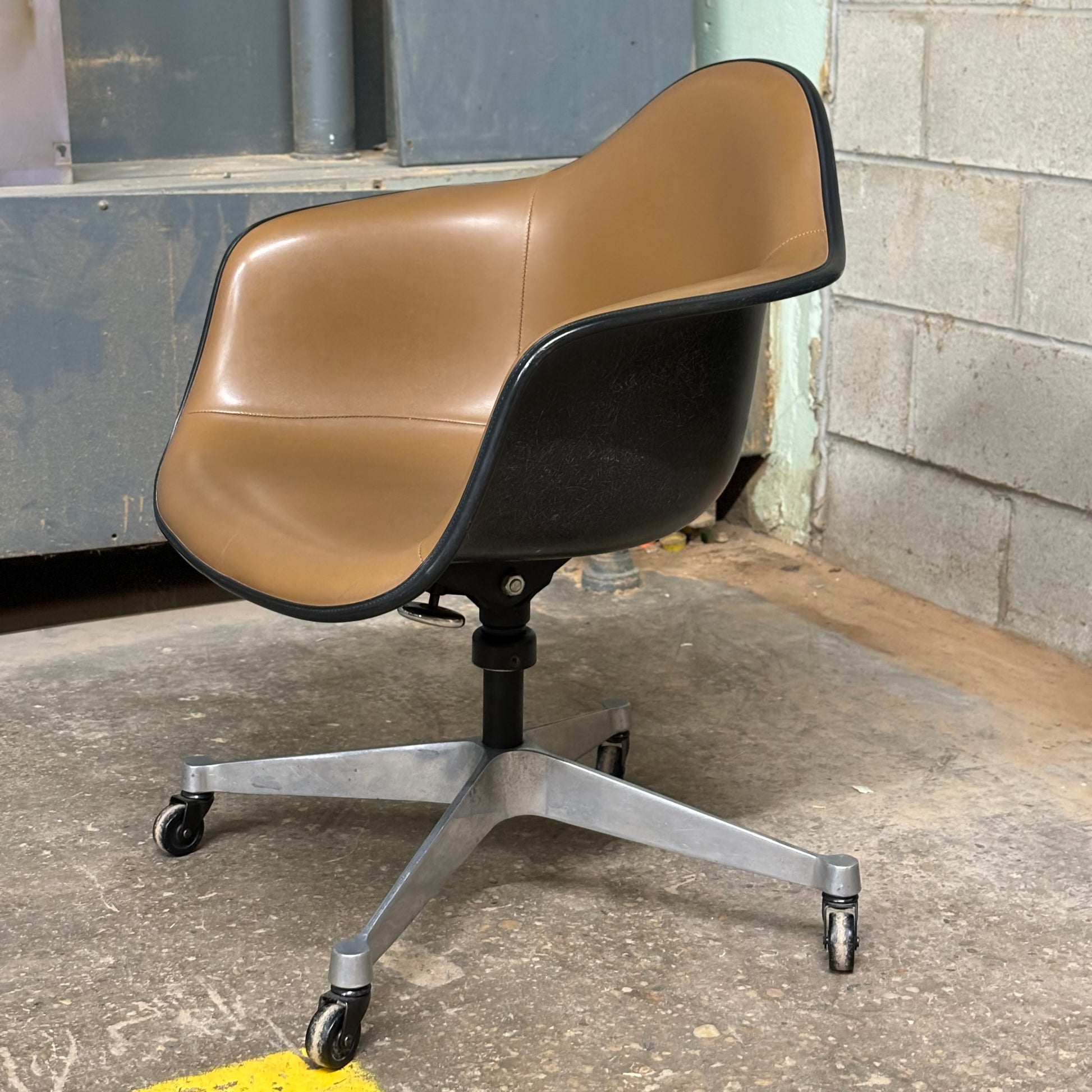 Classic Eames designed fiberglass shell chair with 4-leg contractor base and brown vinyl upholstery. Dated Jun 8th 1973.