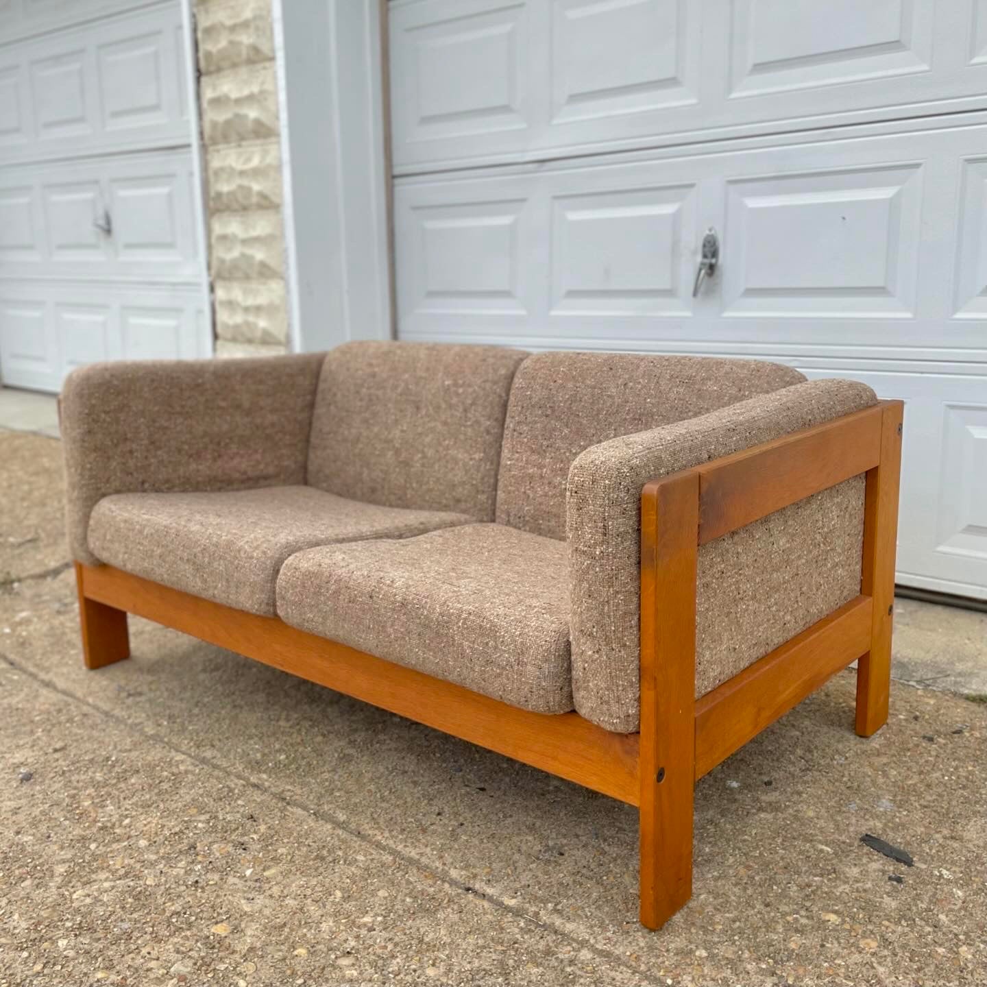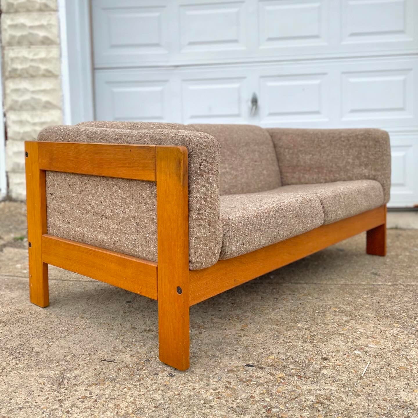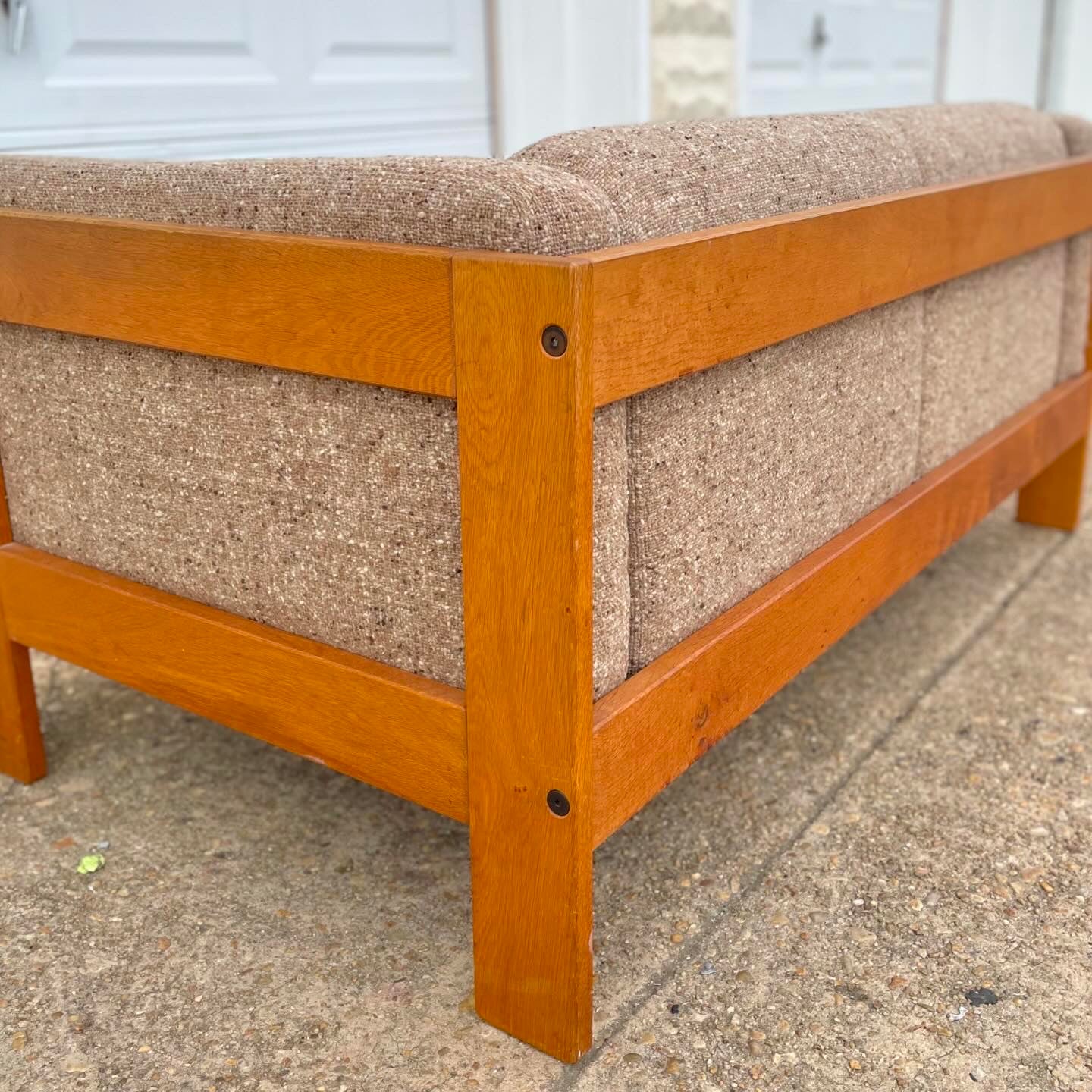 This superb mid 70s loveseat is an excellent example of Danish simplicity mixed with the growing influence of post-modernism, space age and Euro-modern styles. Erik Ole Jørgensen was a trained upholsterer turned furniture designer who worked with many notable manufacturers like Fredericia, Kvadrat and FDB Møbler; creating iconic designs in both furniture & textiles. His Neptun series for FDB seem to be somewhat uncommon (and often misattributed to Tobia Scarpa), though I was lucky enough to find a scan from a catalog to ID it. The solid oak frame and stout bolt fasteners give a strong presence while still being understated overall. Original wool tweed upholstered cushions are supportive & the color is super versatile!