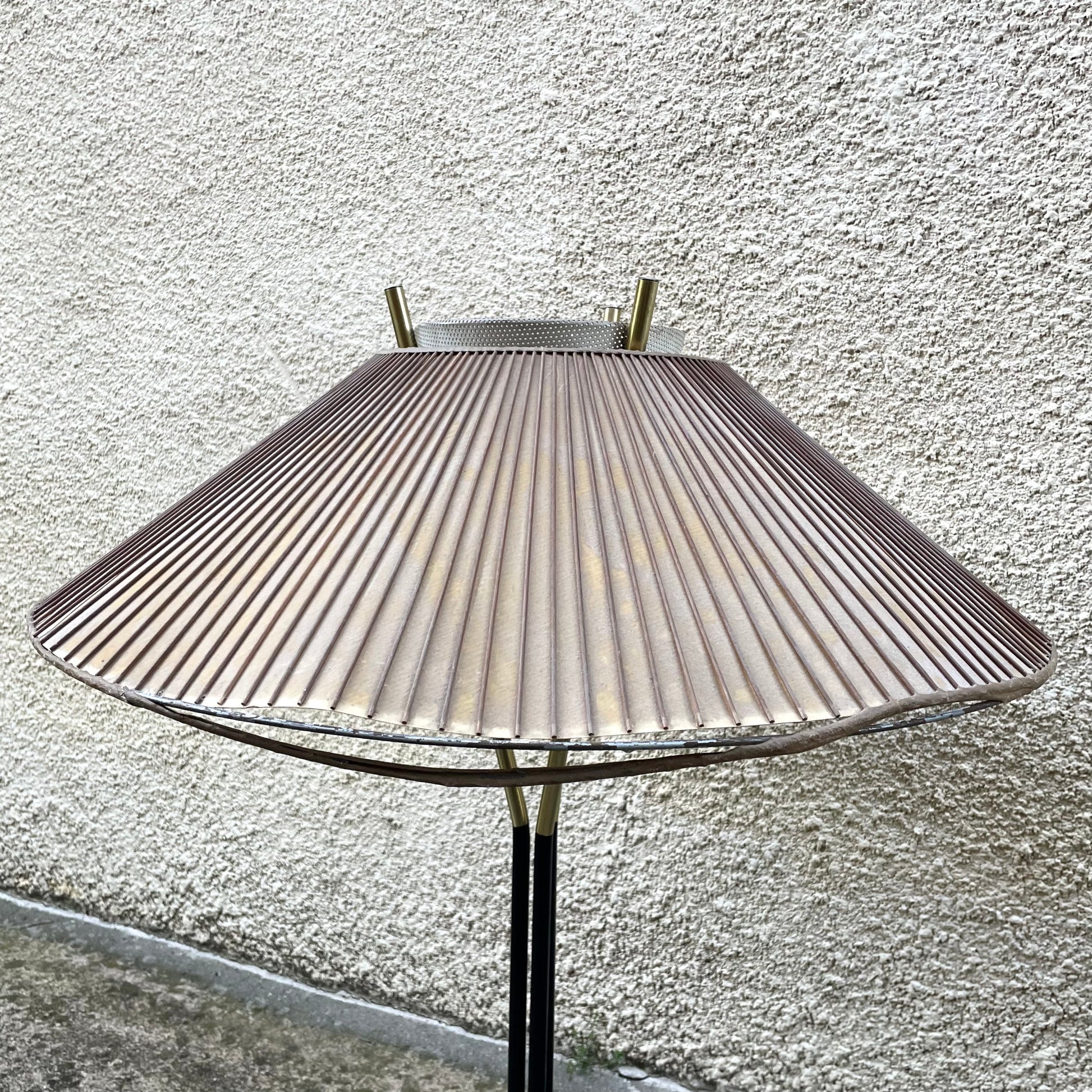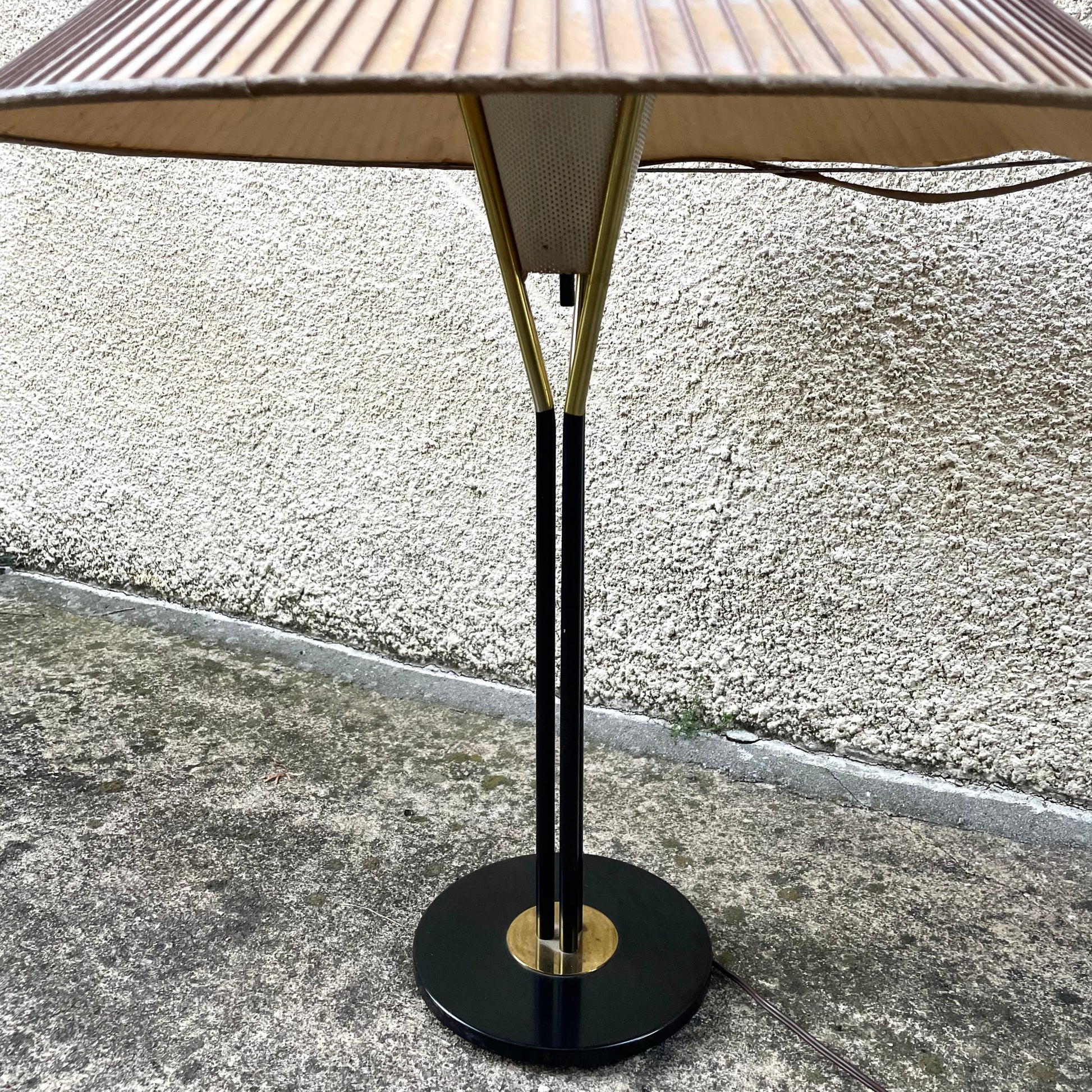 Enameled brass table lamp with a sleek tripod design, supporting a paper & wood frame, designed by Gerald Thurston for Lightolier circa 1950s.