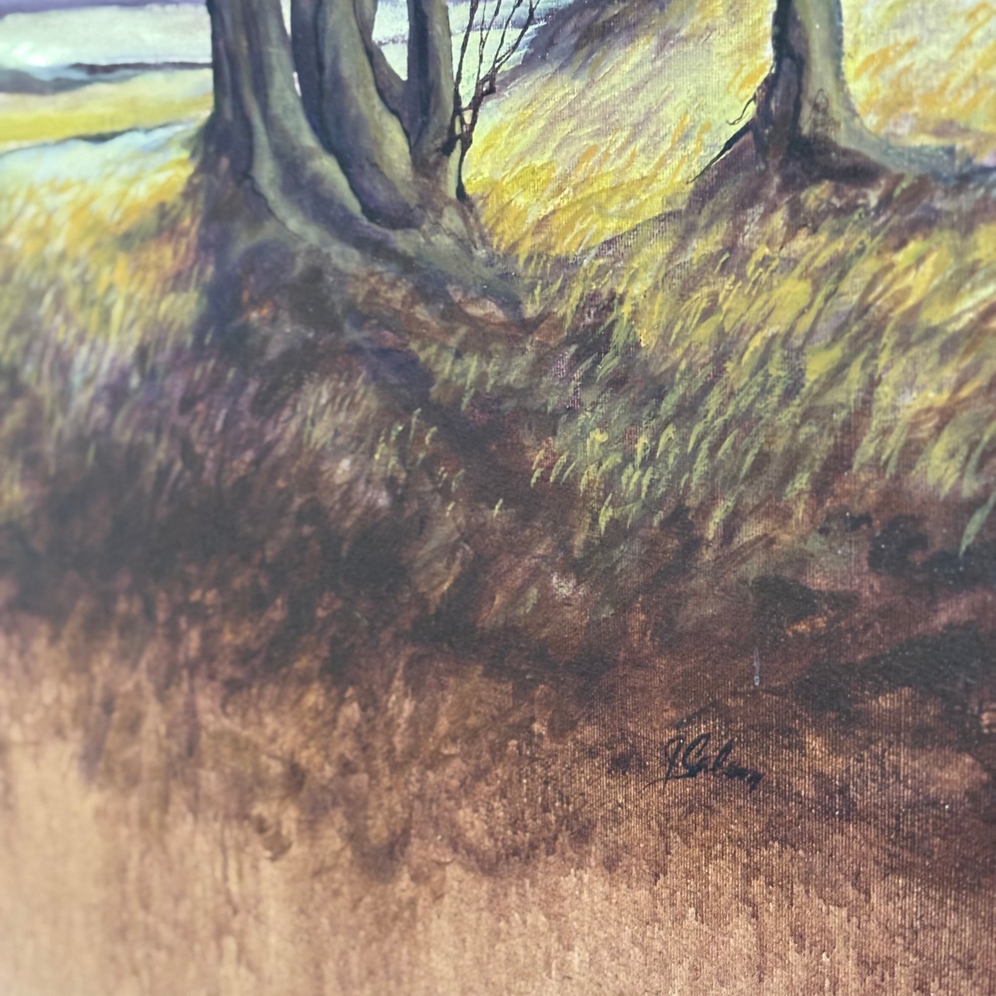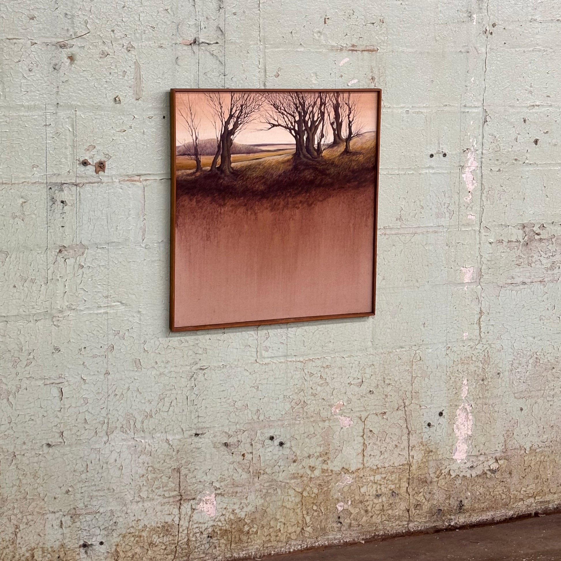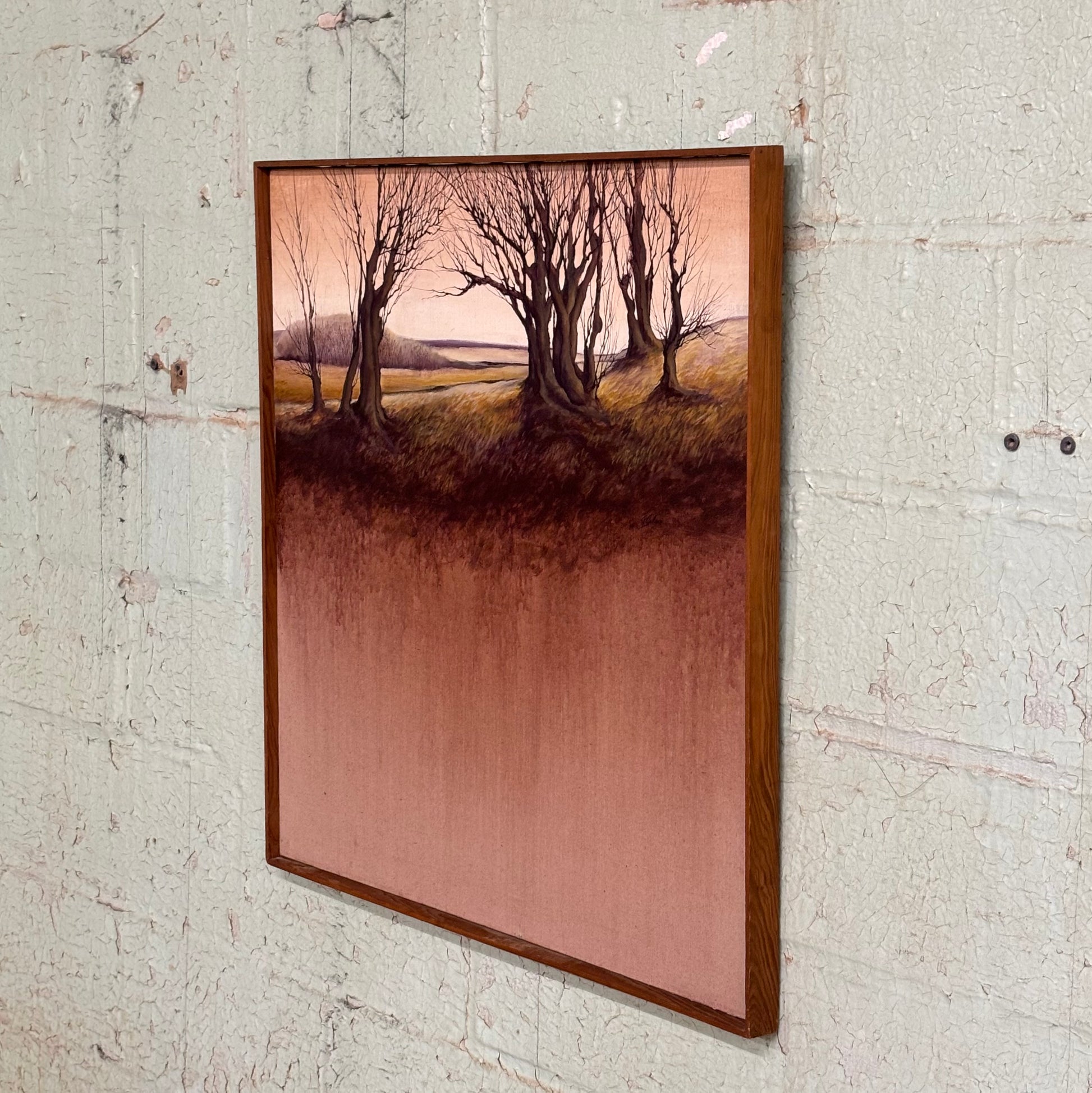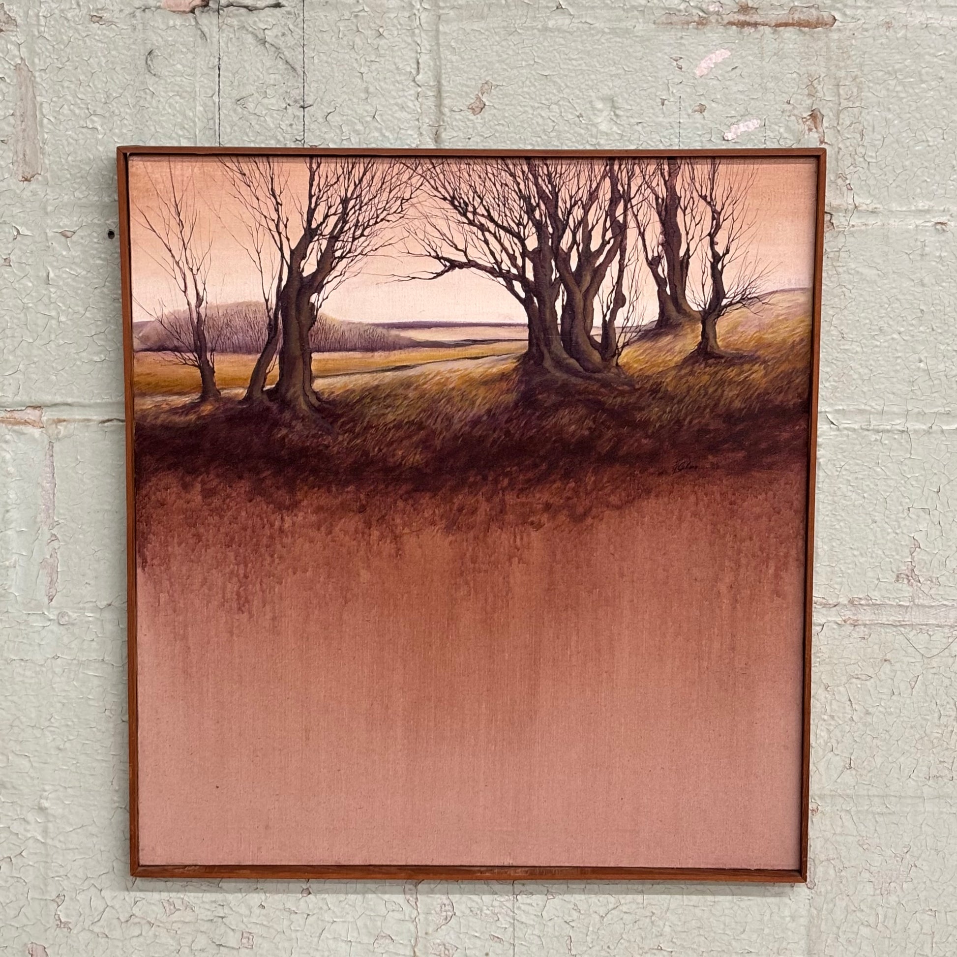 Striking Mid-Century landscape painting on stretched canvas, with a simple heart pine frame.