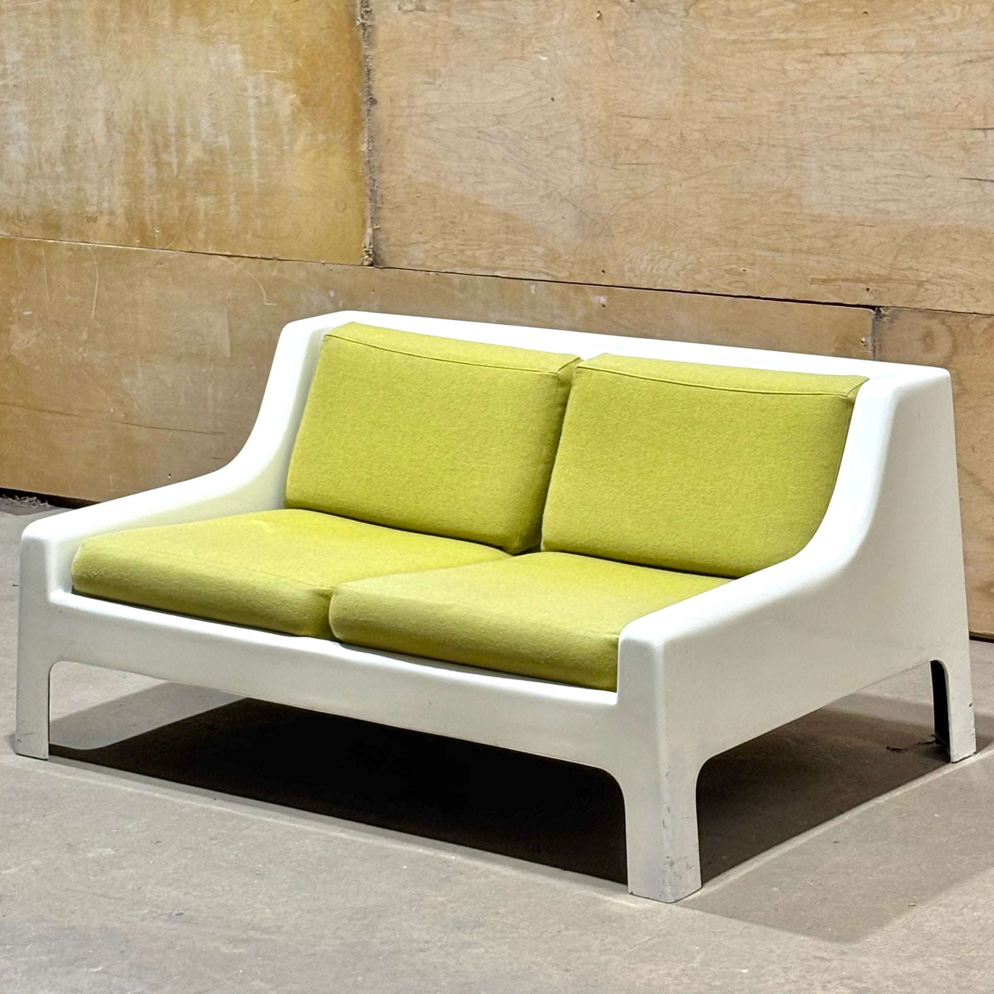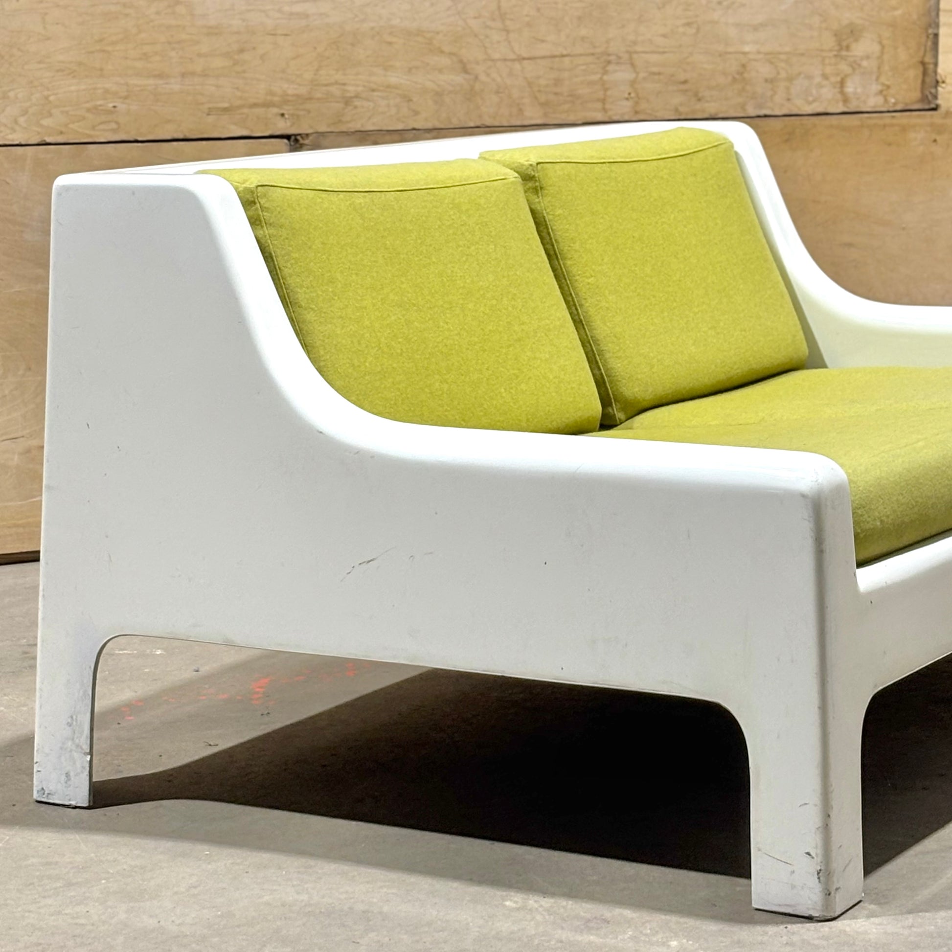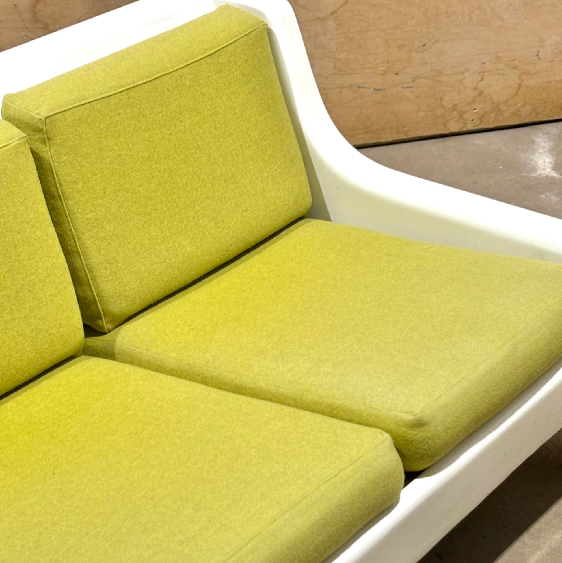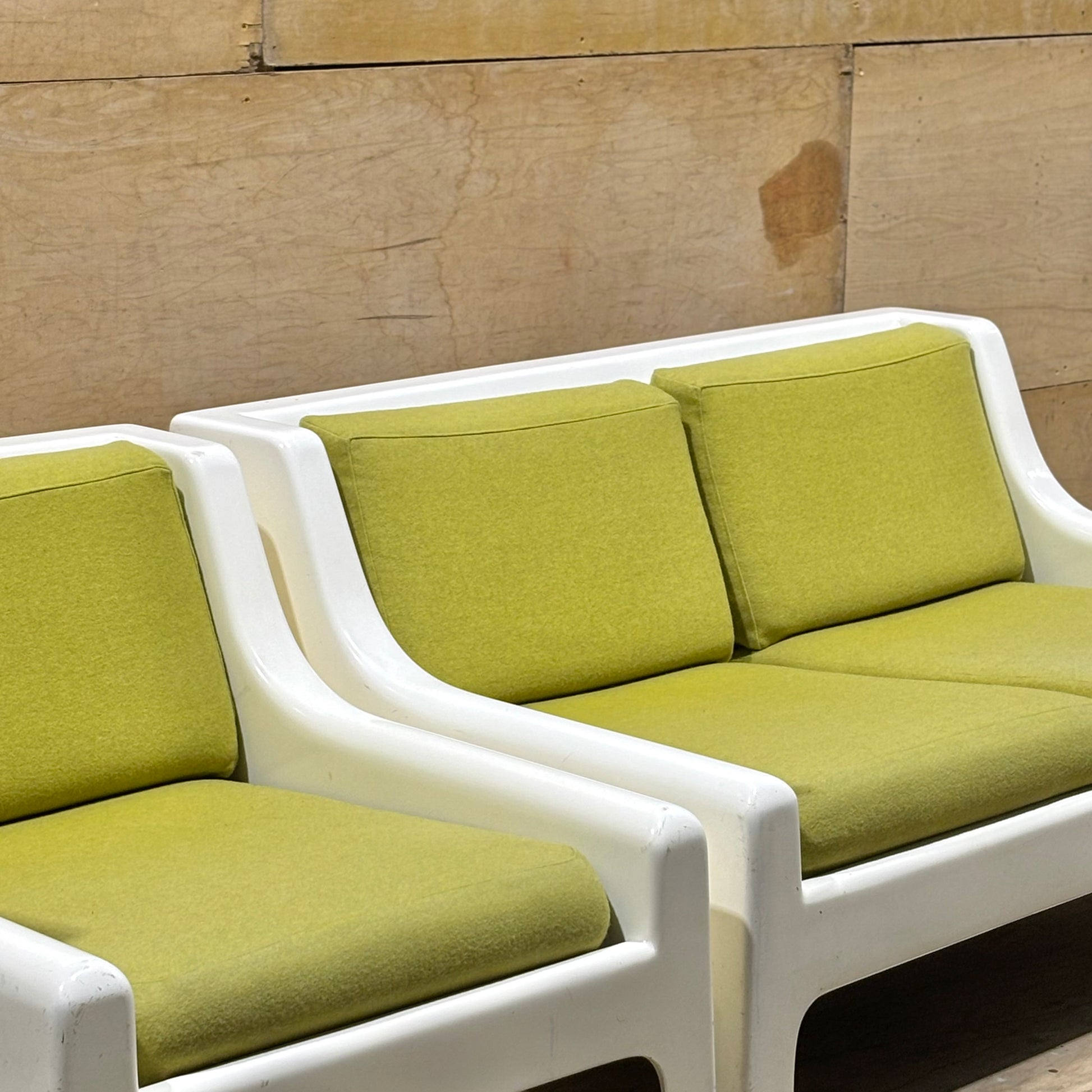 This pair is highly uncommon with very few examples coming up on the market. Muted chartreuse upholstery is in excellent condition and shows minimal wear. The frames have some dents & scrapes along the outer edges, but there are no structural issues. Perfect for the both the aspiring and the astute collector.