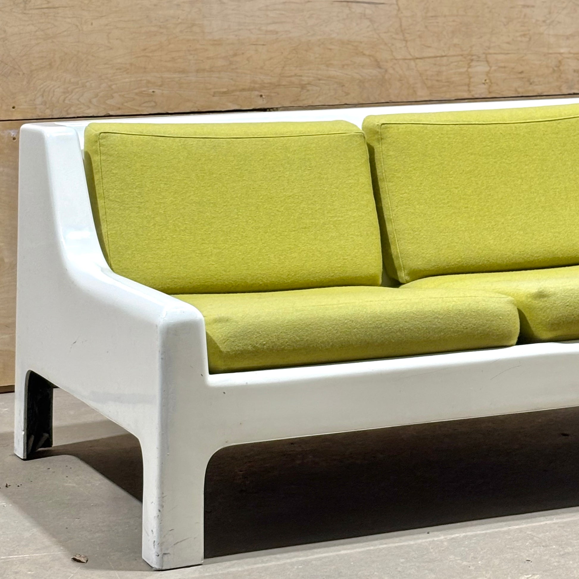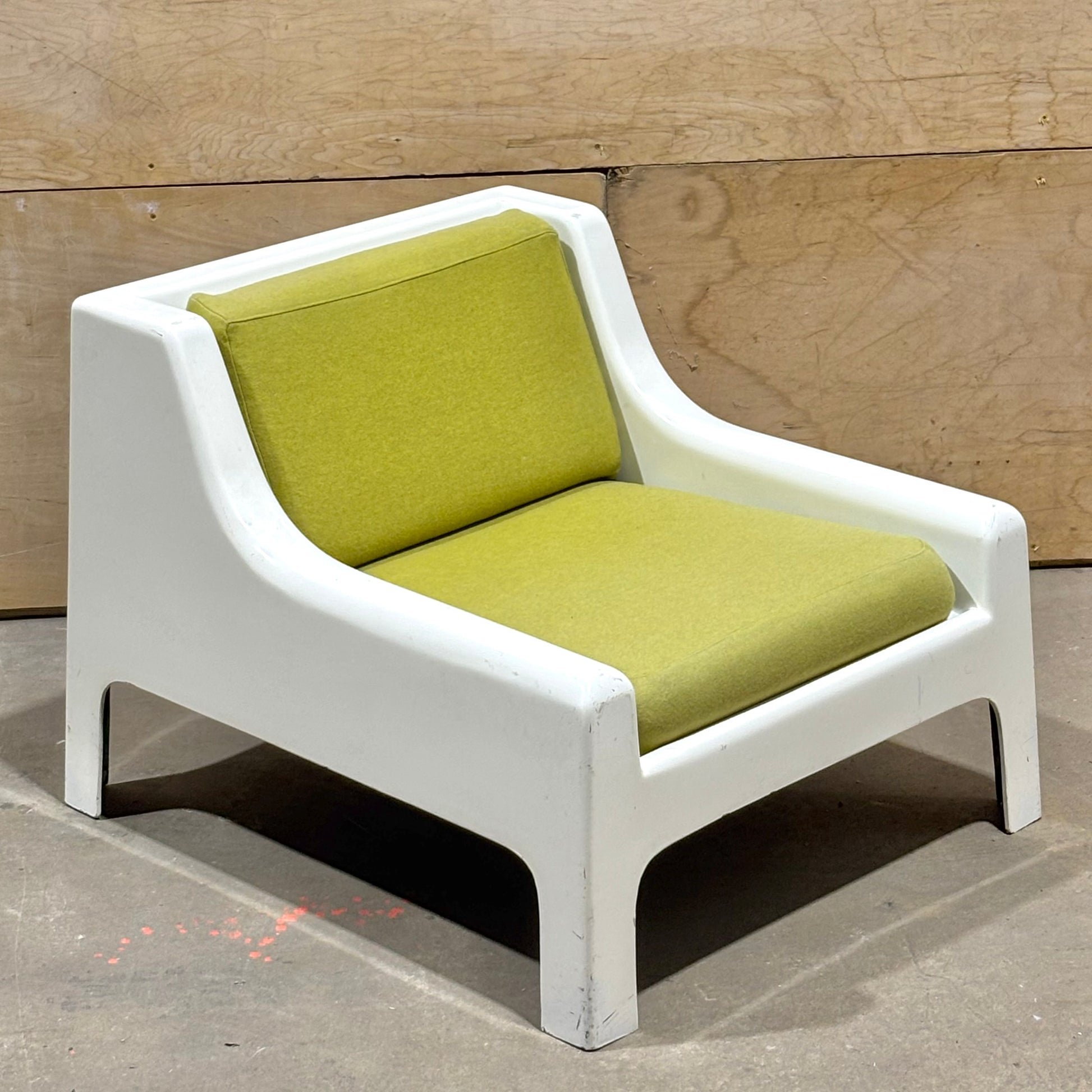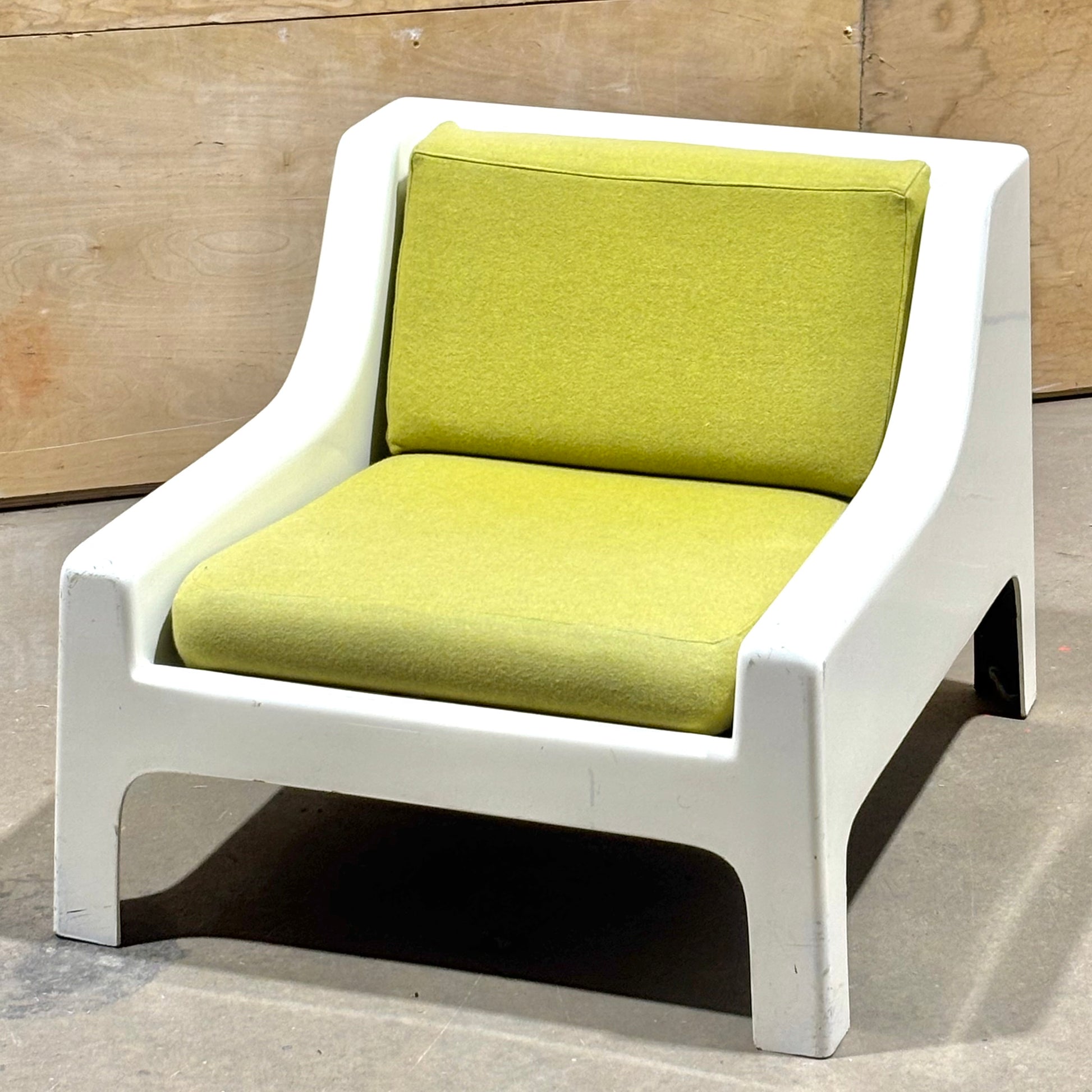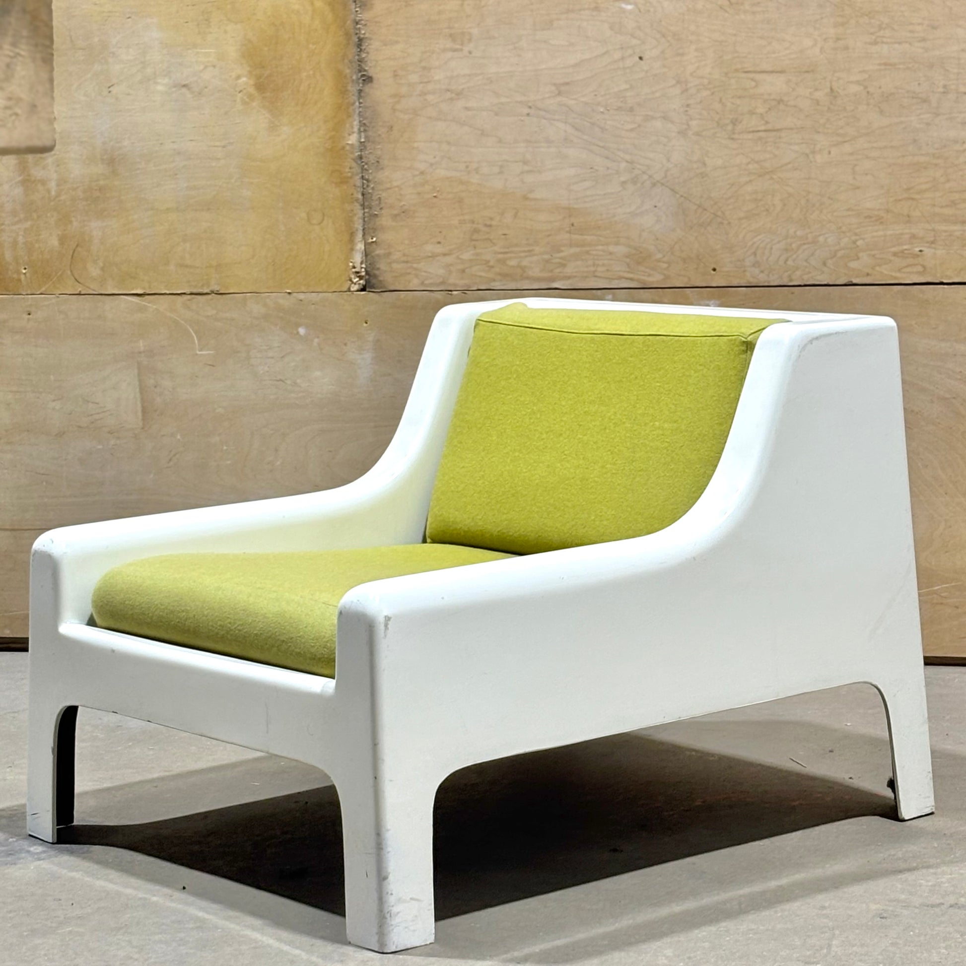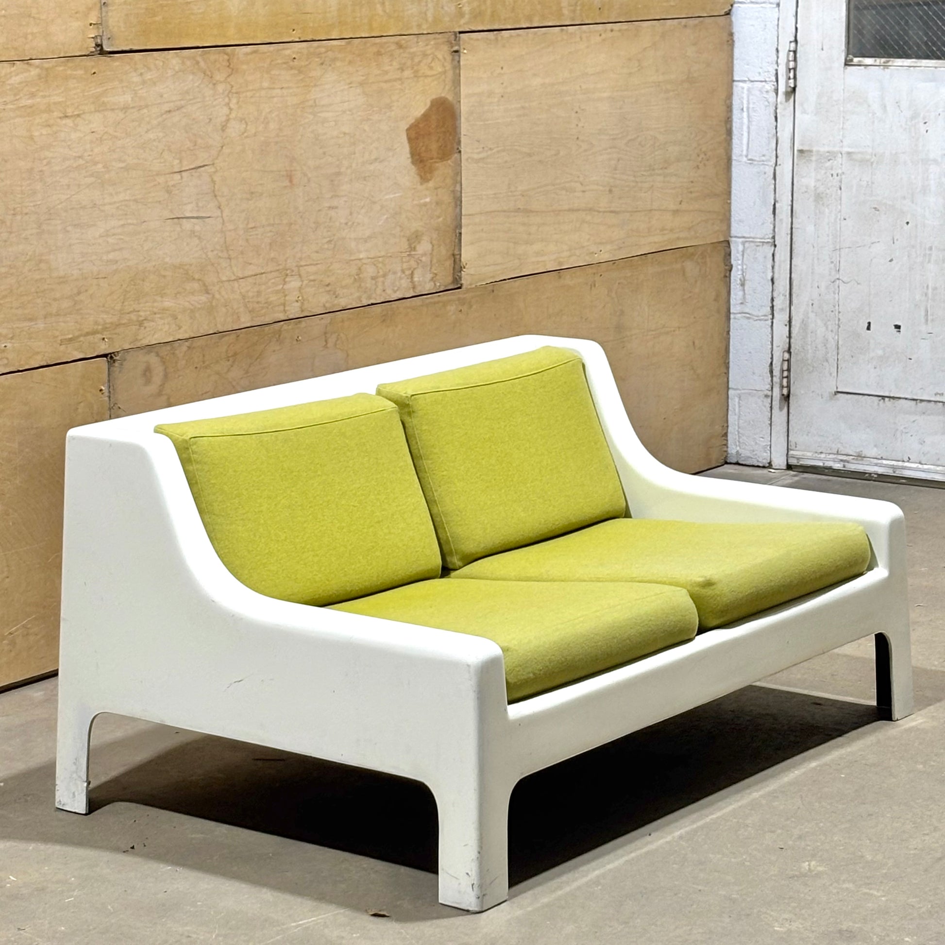 This pair is highly uncommon with very few examples coming up on the market. Muted chartreuse upholstery is in excellent condition and shows minimal wear. The frames have some dents & scrapes along the outer edges, but there are no structural issues. Perfect for the both the aspiring and the astute collector.