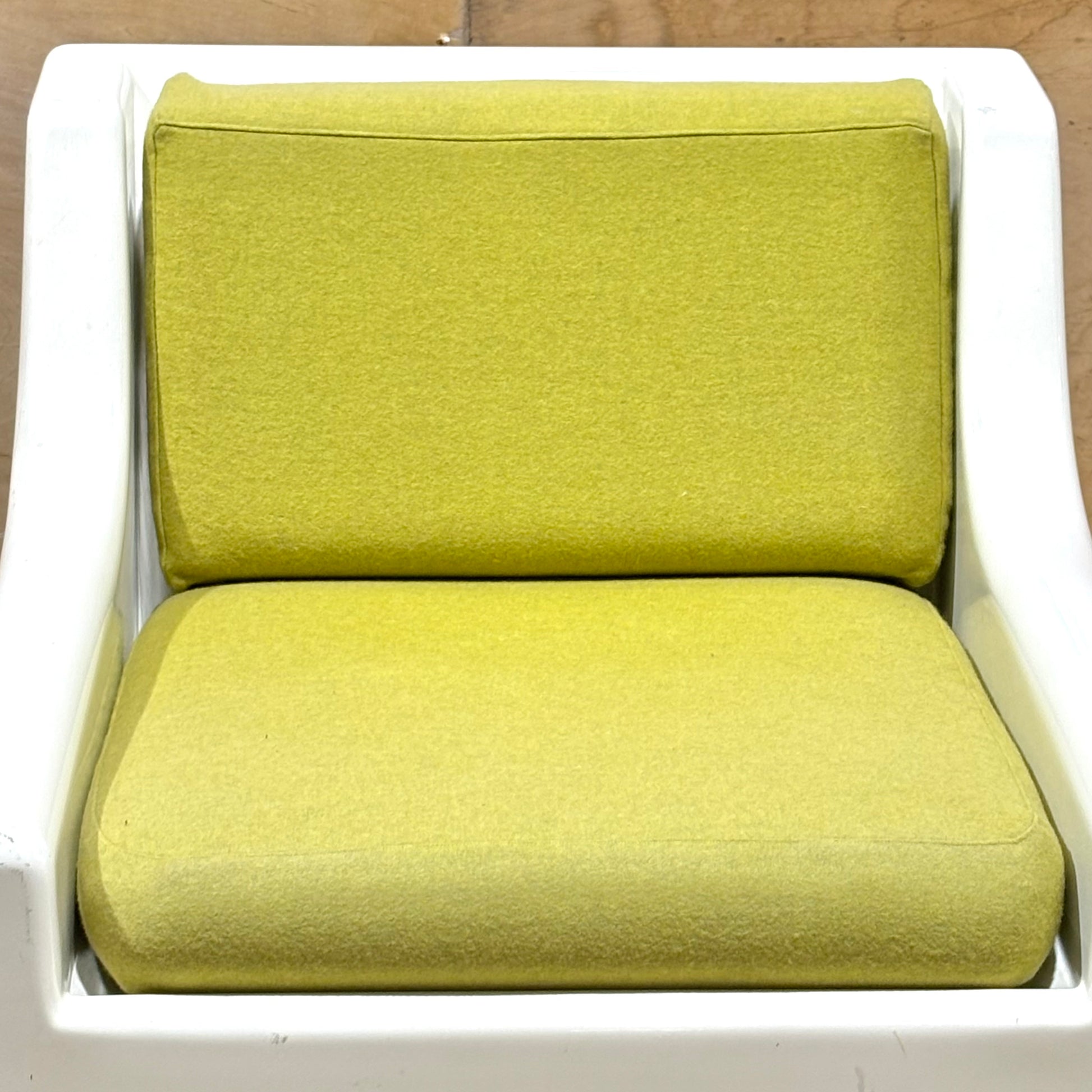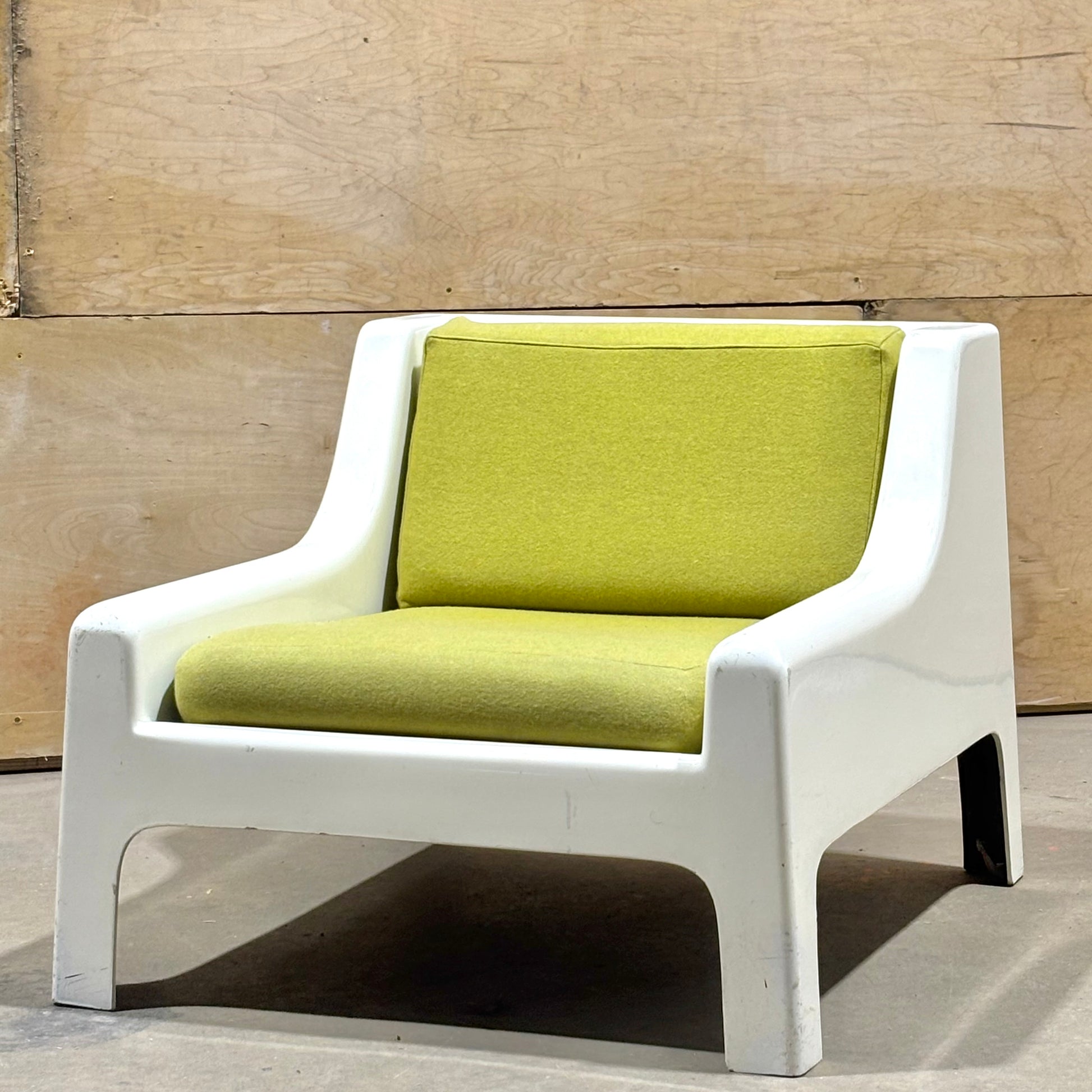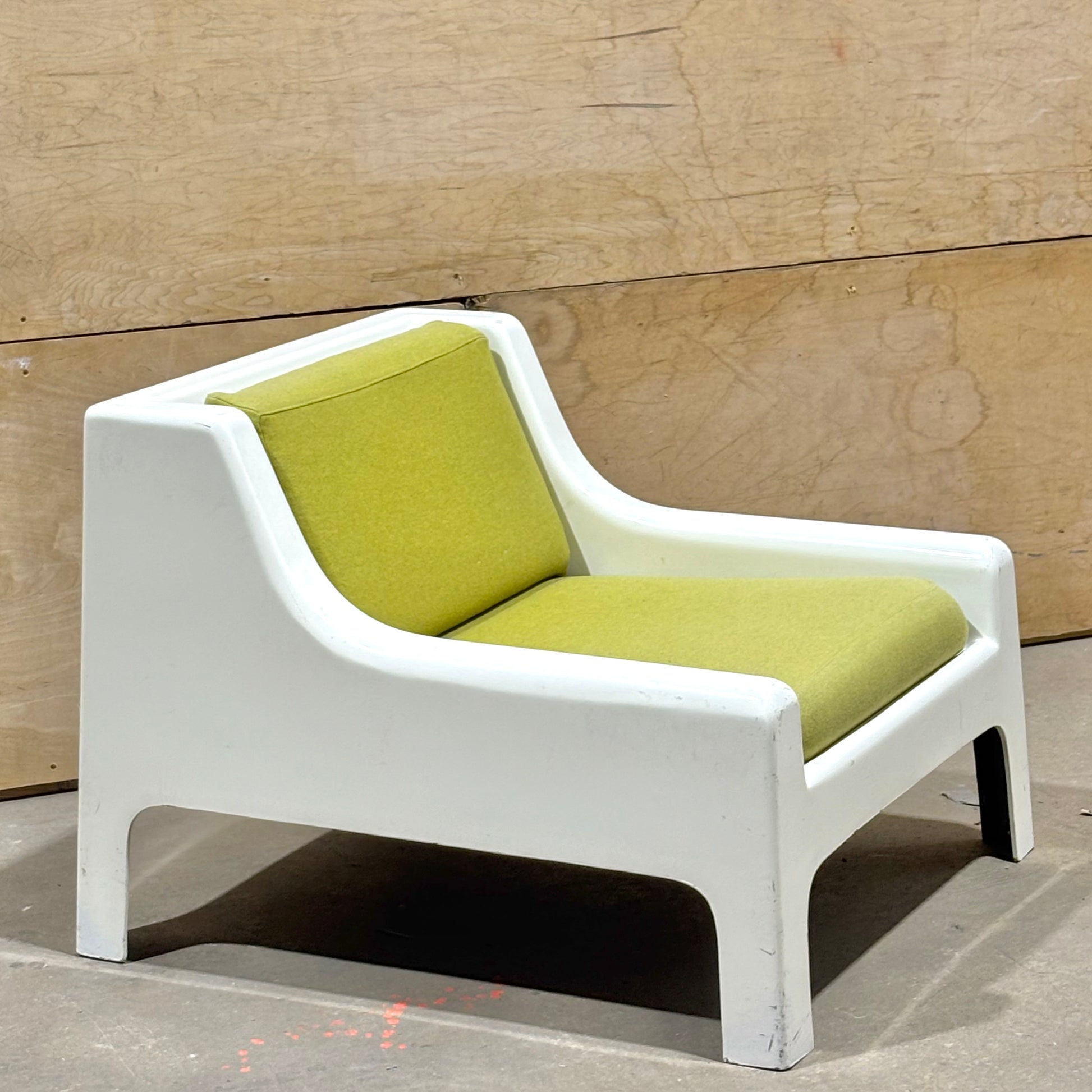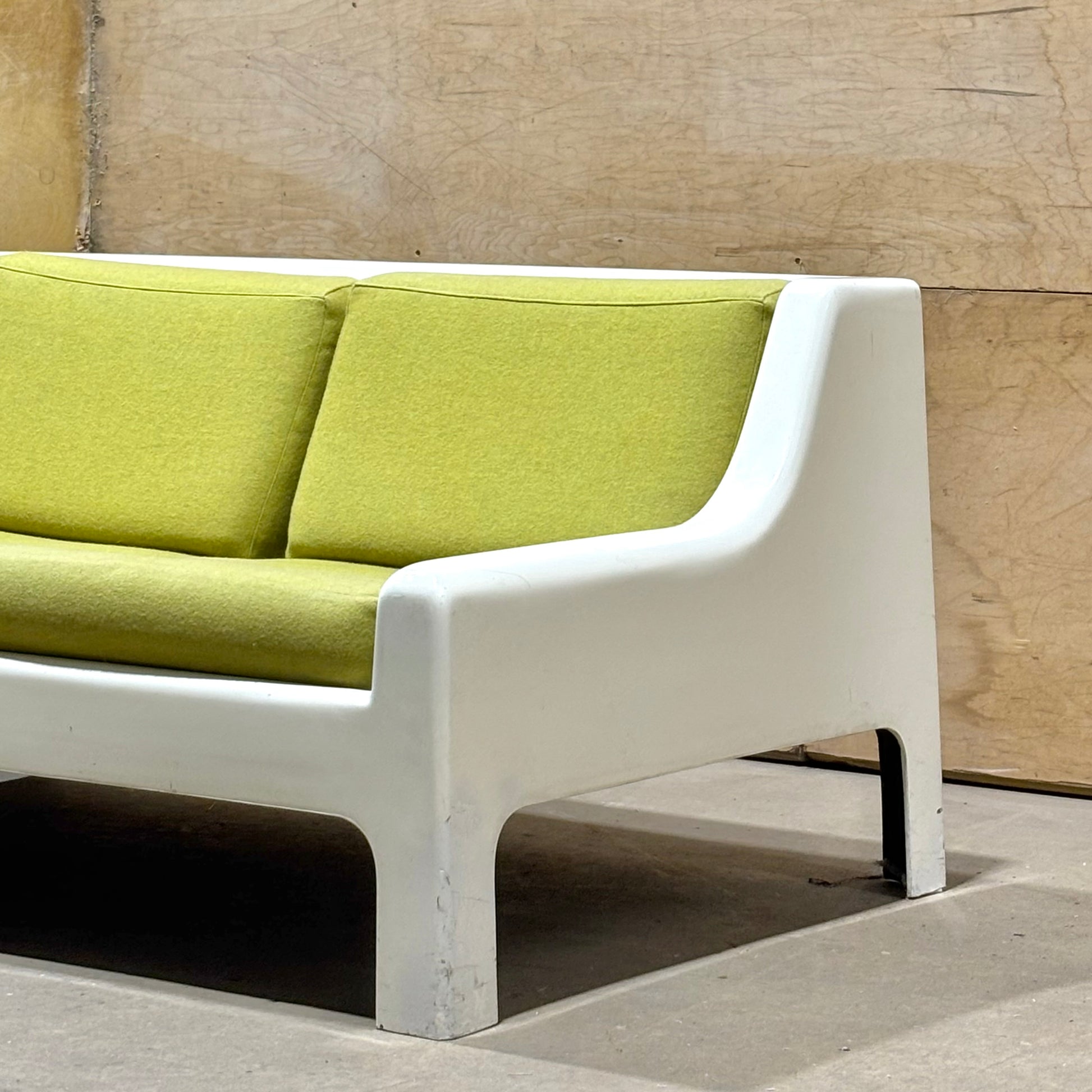 This pair is highly uncommon with very few examples coming up on the market. Muted chartreuse upholstery is in excellent condition and shows minimal wear. The frames have some dents & scrapes along the outer edges, but there are no structural issues. Perfect for the both the aspiring and the astute collector.