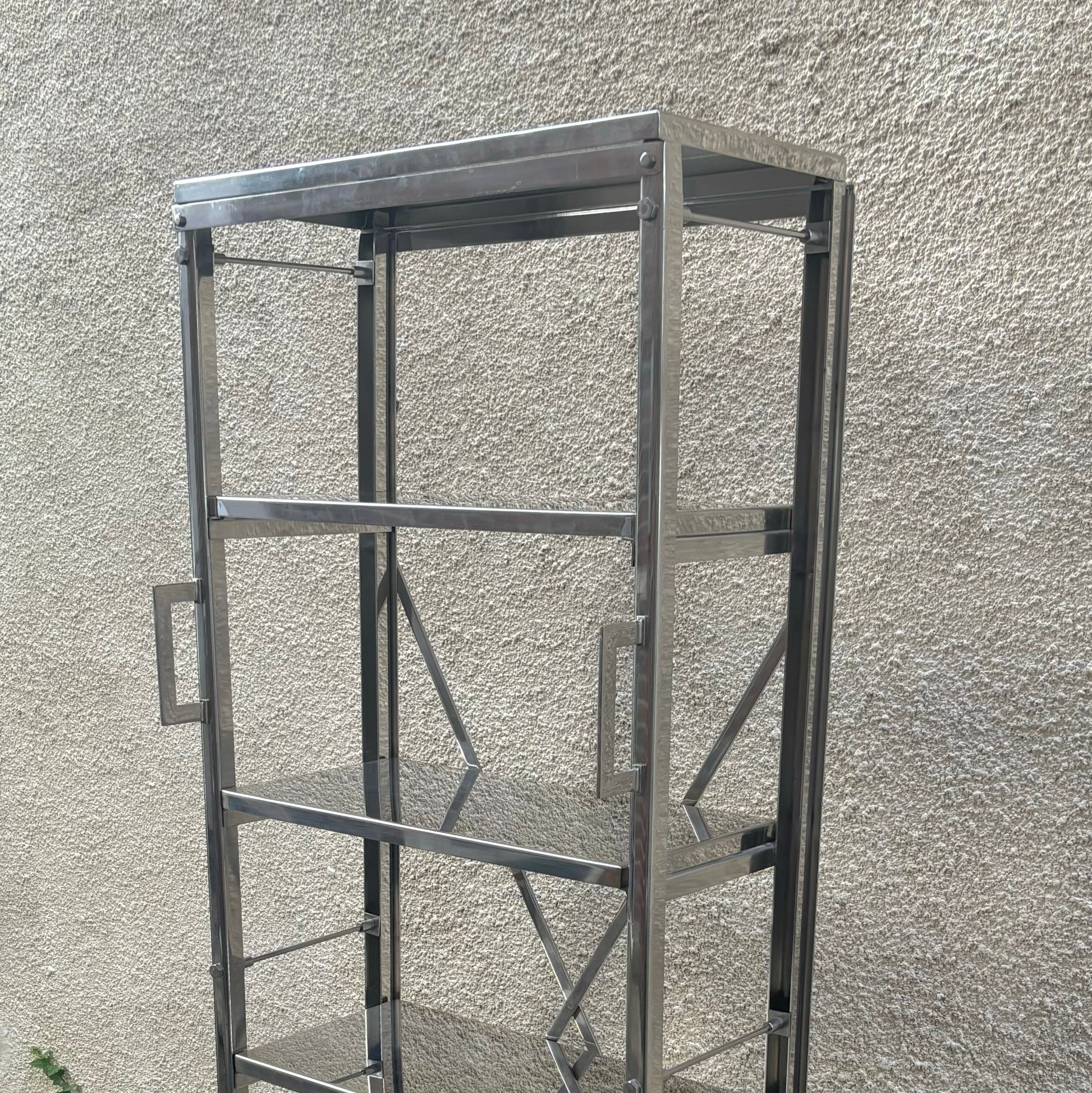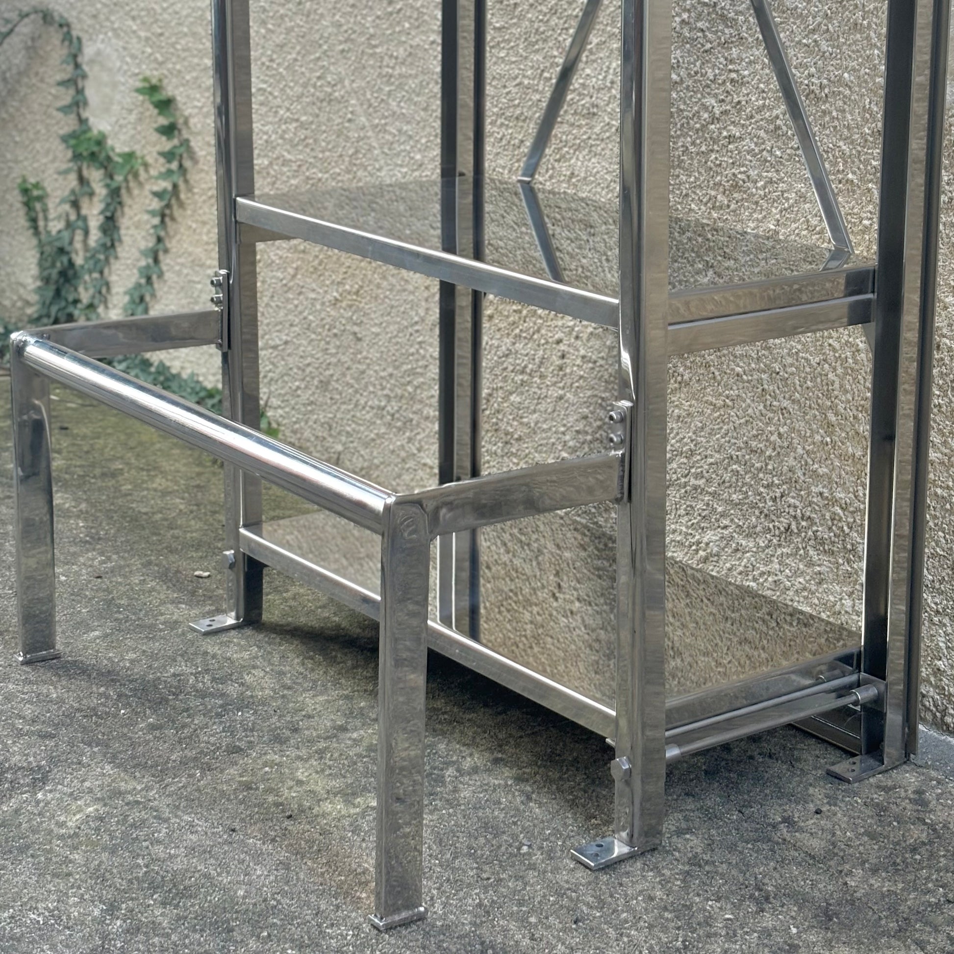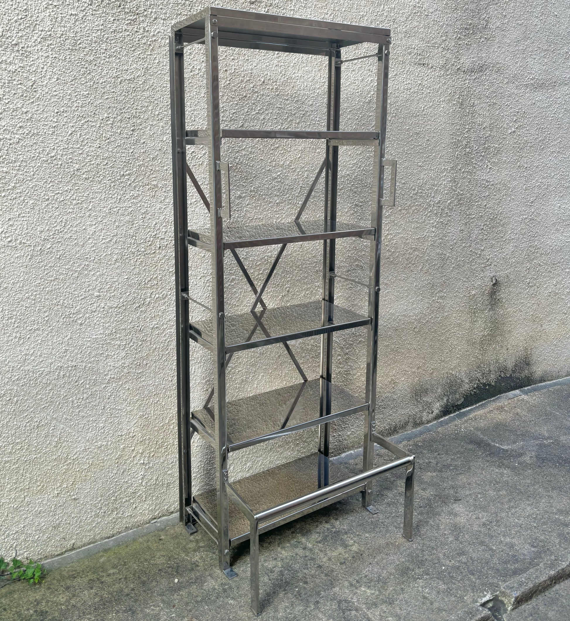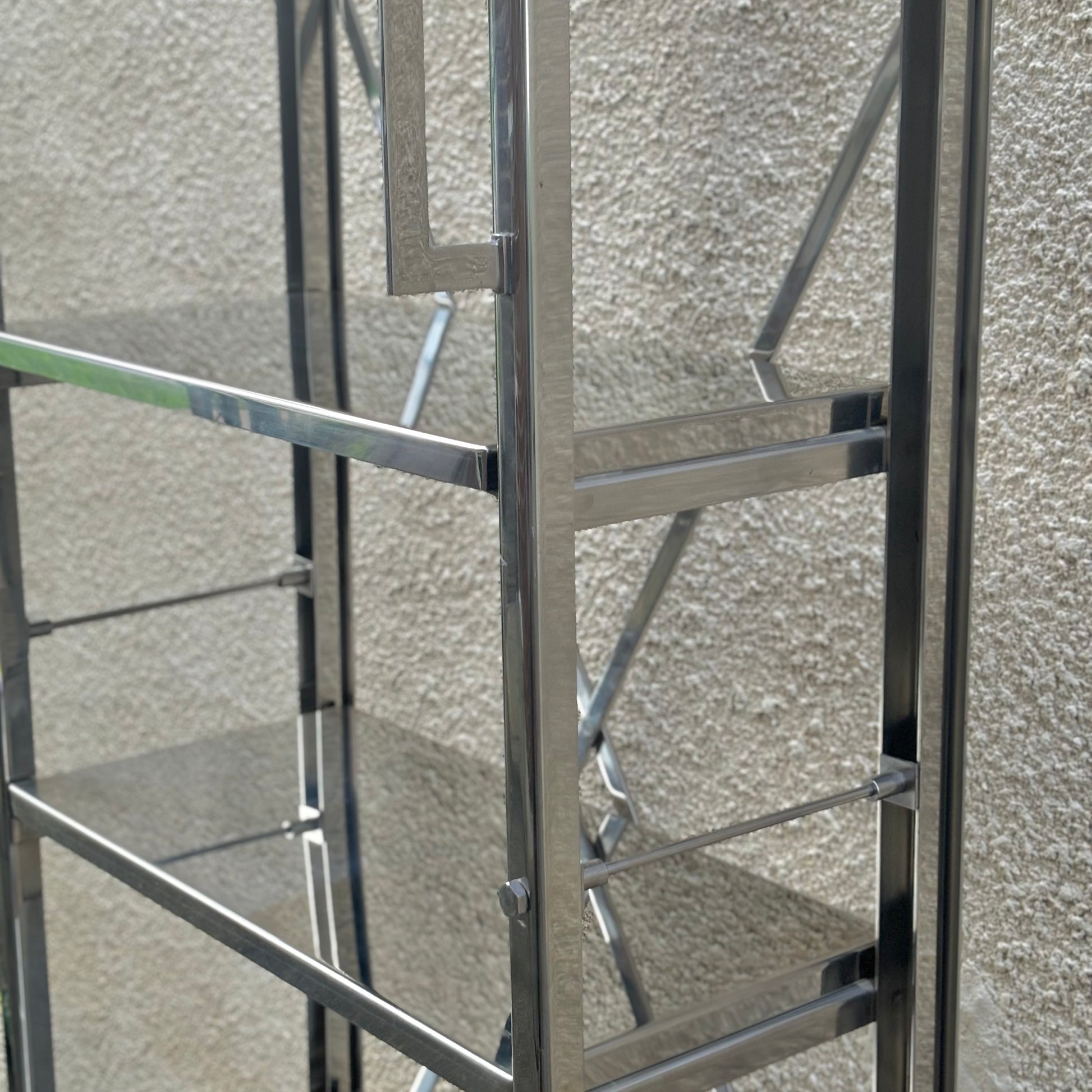 Impressive vintage etagere/bookshelf in stainless steel with a built-in step riser. Functional & sleek, this shelf is a wonderful statement piece and adds a strong presence in any room.