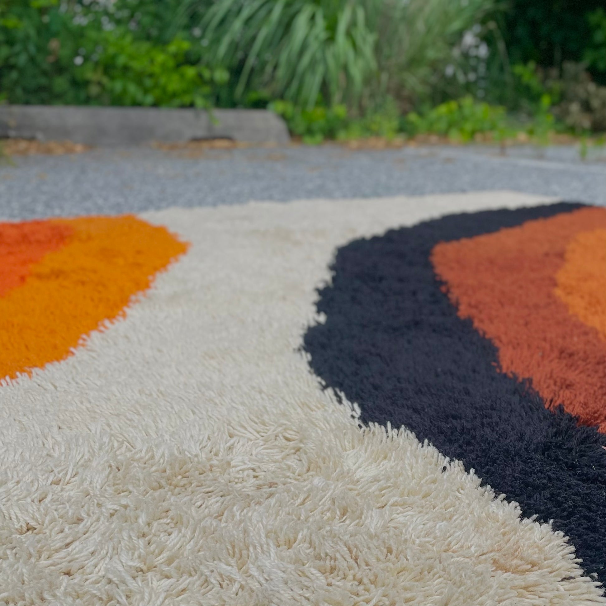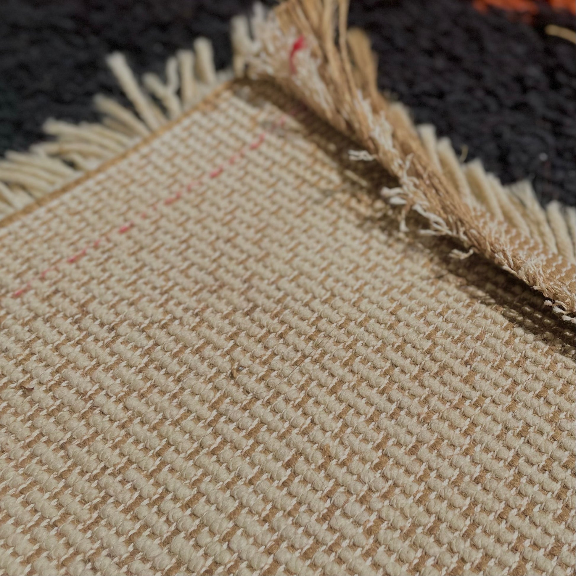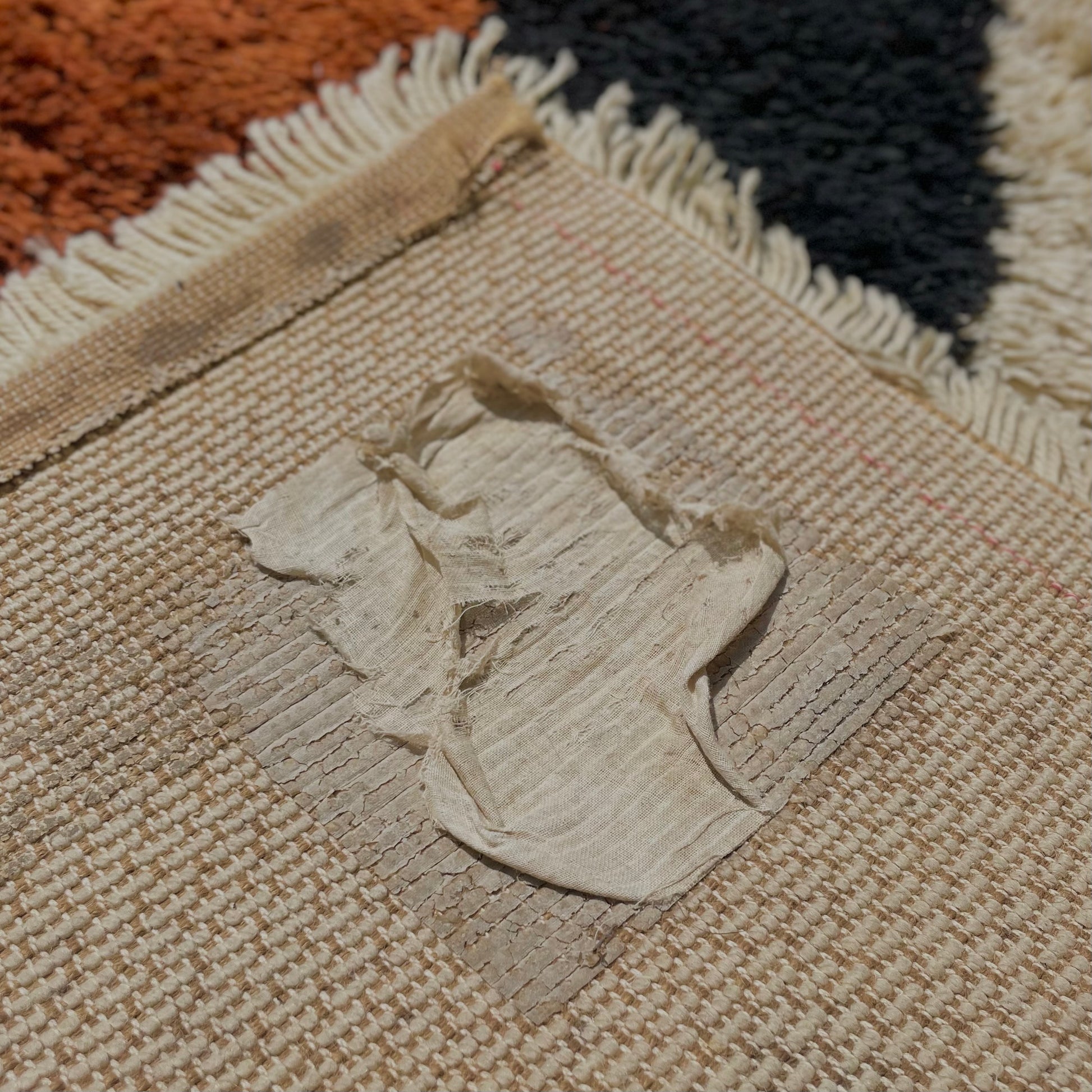 Gorgeous earth tones & oranges contrast with off-white and black, and the thick tufting provides ample comfort. Excellent condition with no apparent wear to the top side. Some minor fraying on two corners of the underside edges. No odors or matting of the fibers.