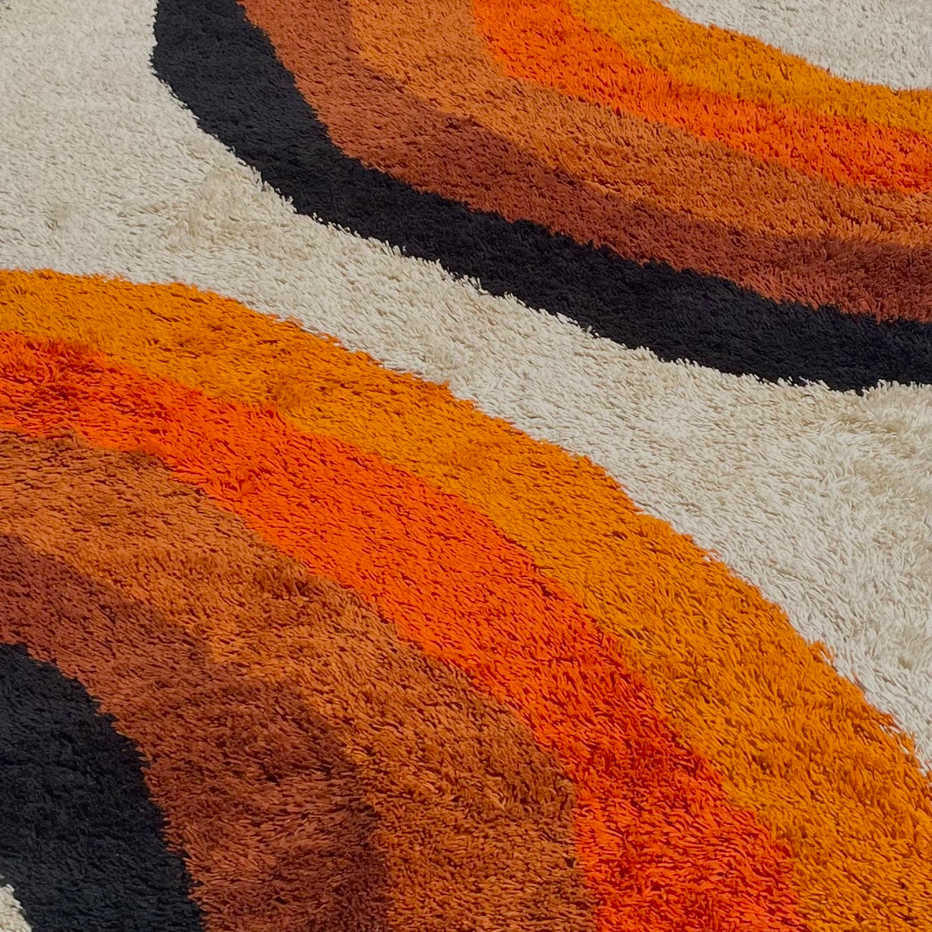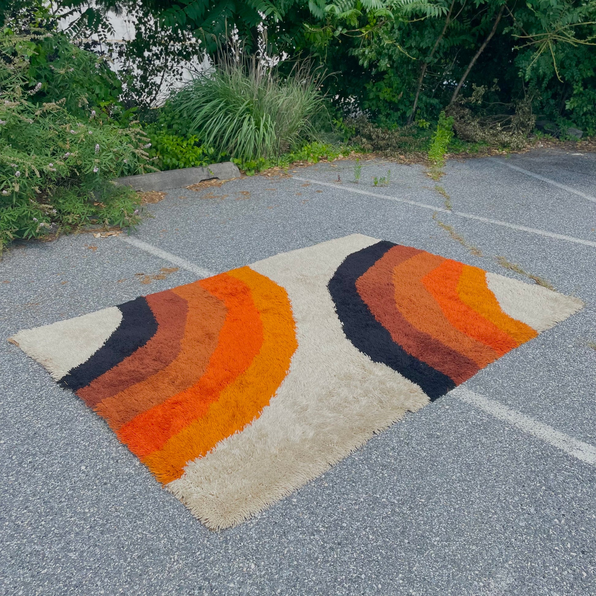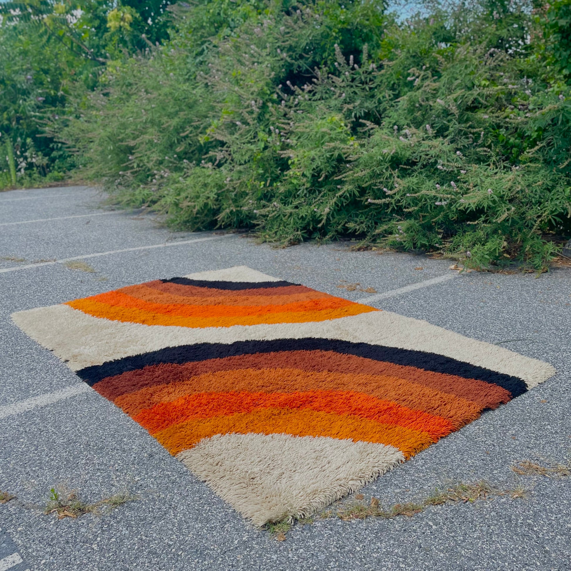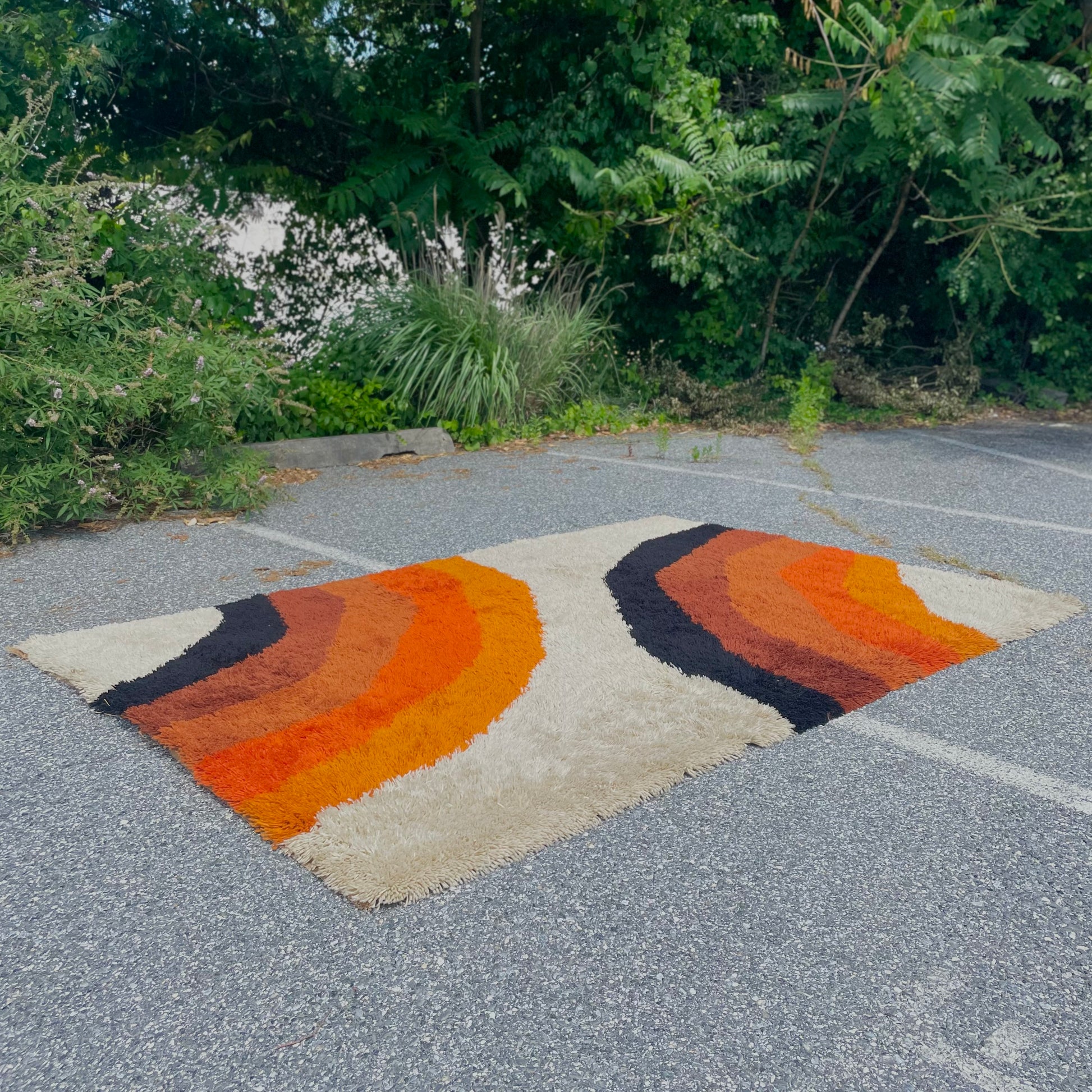 Gorgeous earth tones & oranges contrast with off-white and black, and the thick tufting provides ample comfort. Excellent condition with no apparent wear to the top side. Some minor fraying on two corners of the underside edges. No odors or matting of the fibers.
