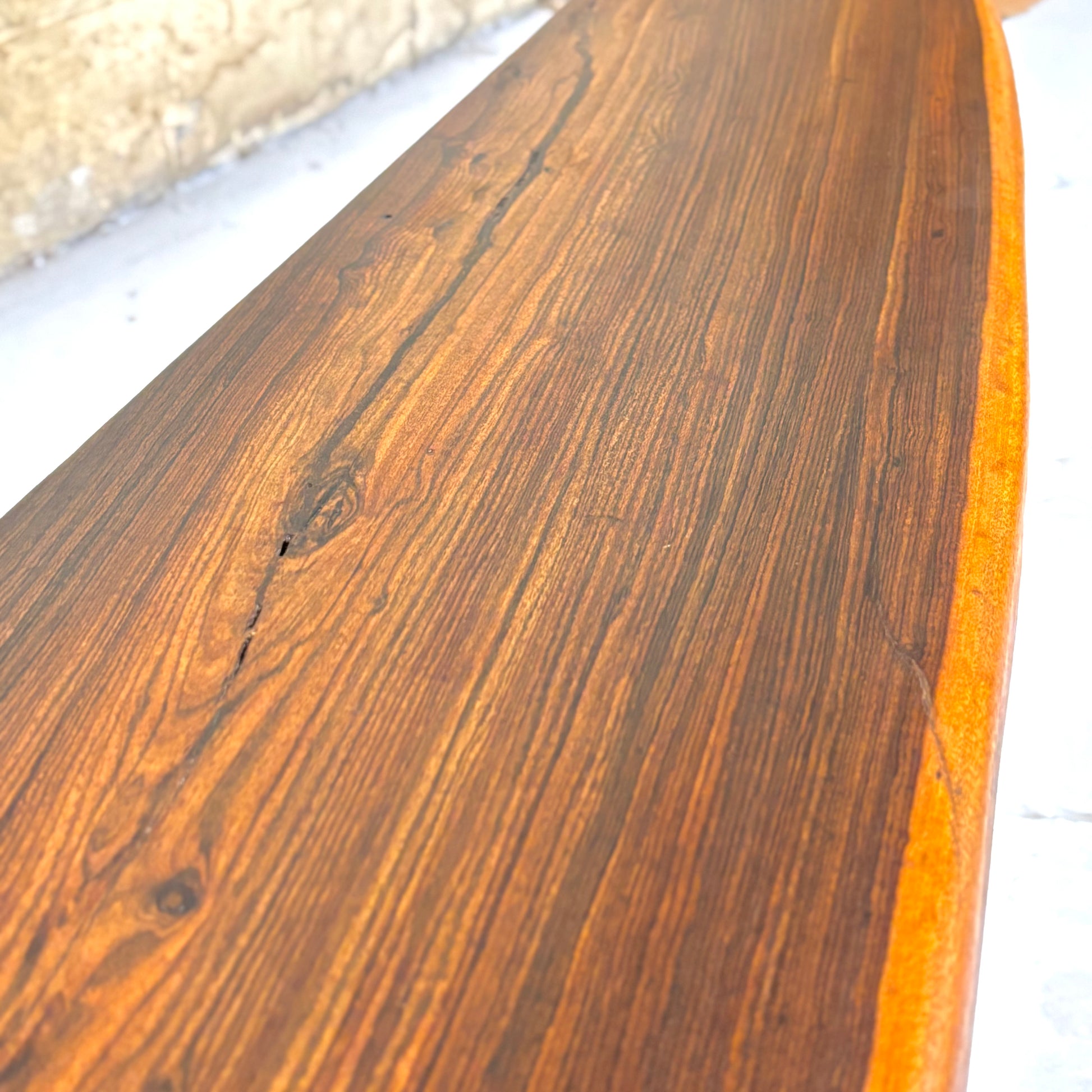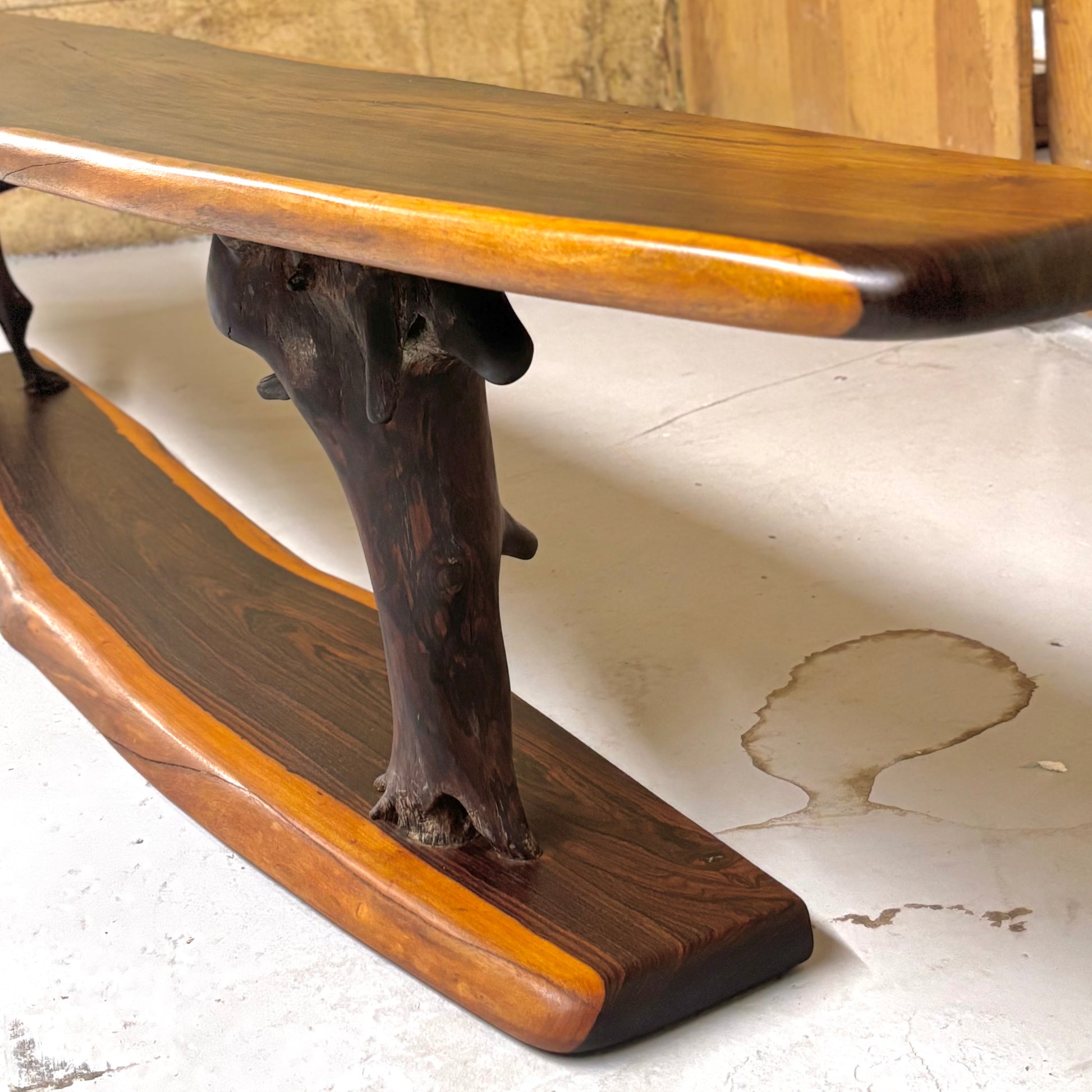 It isn’t uncommon to find furniture made from live-edge lumber. There are countless styles utilizing the natural shape of the wood, from primitive to modern. What isn’t common, however, is seeing pieces made from large pieces of rare tropical hardwoods. The lack of availability due to over-harvesting and environmental restrictions makes it almost infeasible.