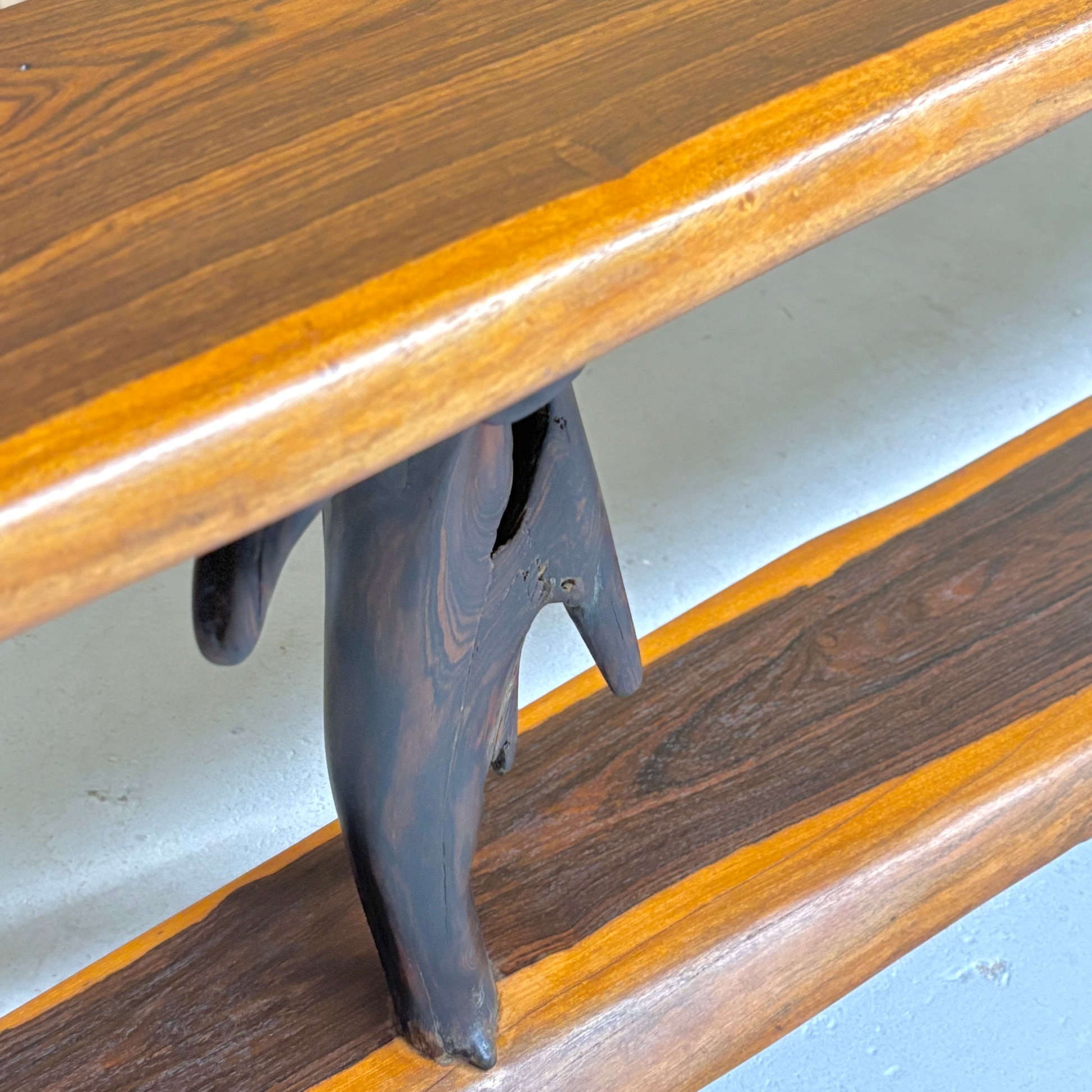 Jaw dropping Ironwood bench with live edges & branch legs, circa 1960s.