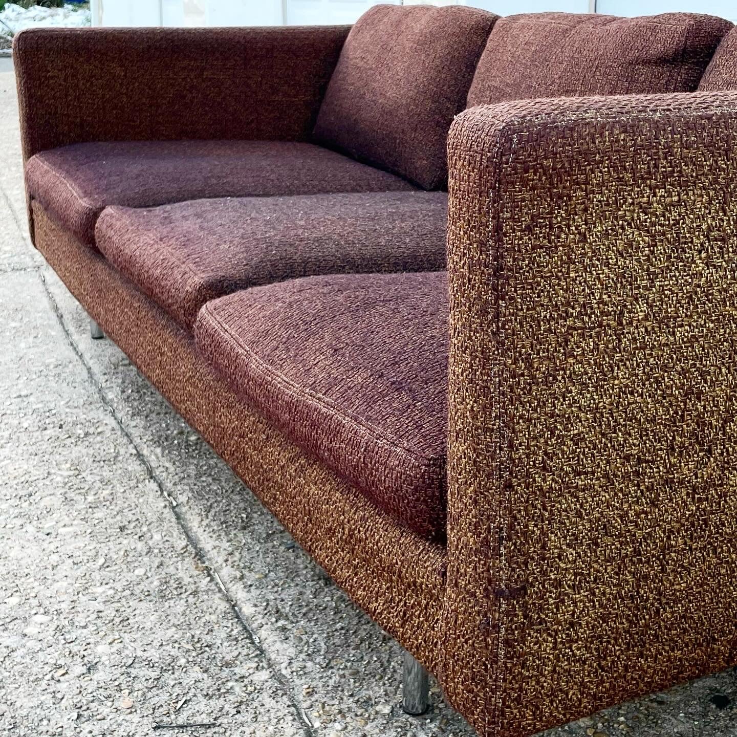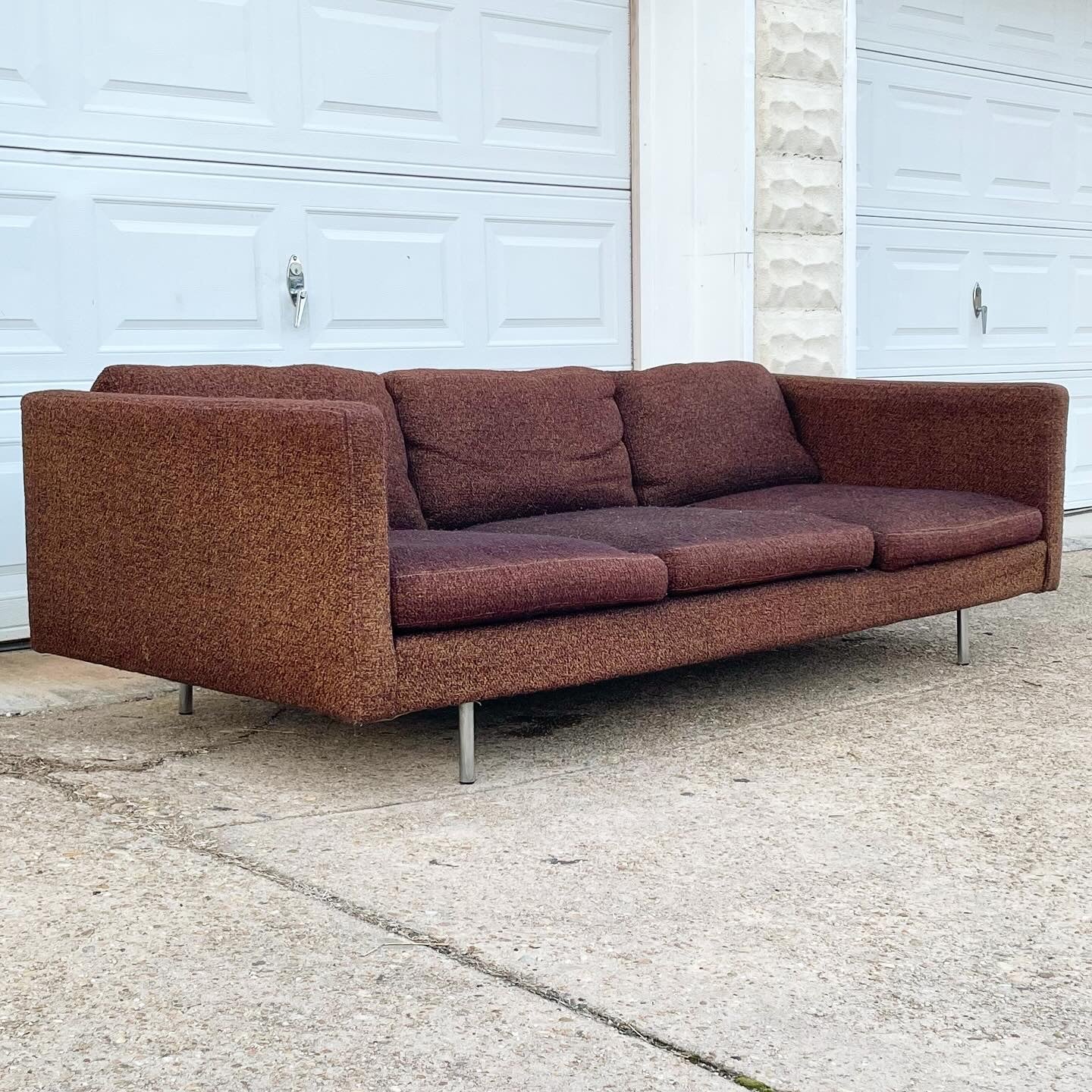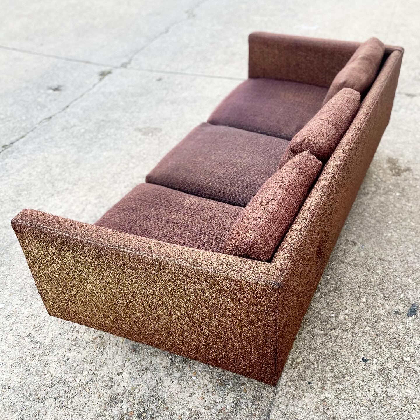 This is still rocking the original brown tweed wool upholstery & down-filled cushions, and quite well at that! Remnants of the original Thayer Coggin tag remain, no other markings or labels are present; but it is unmistakably Baughman.